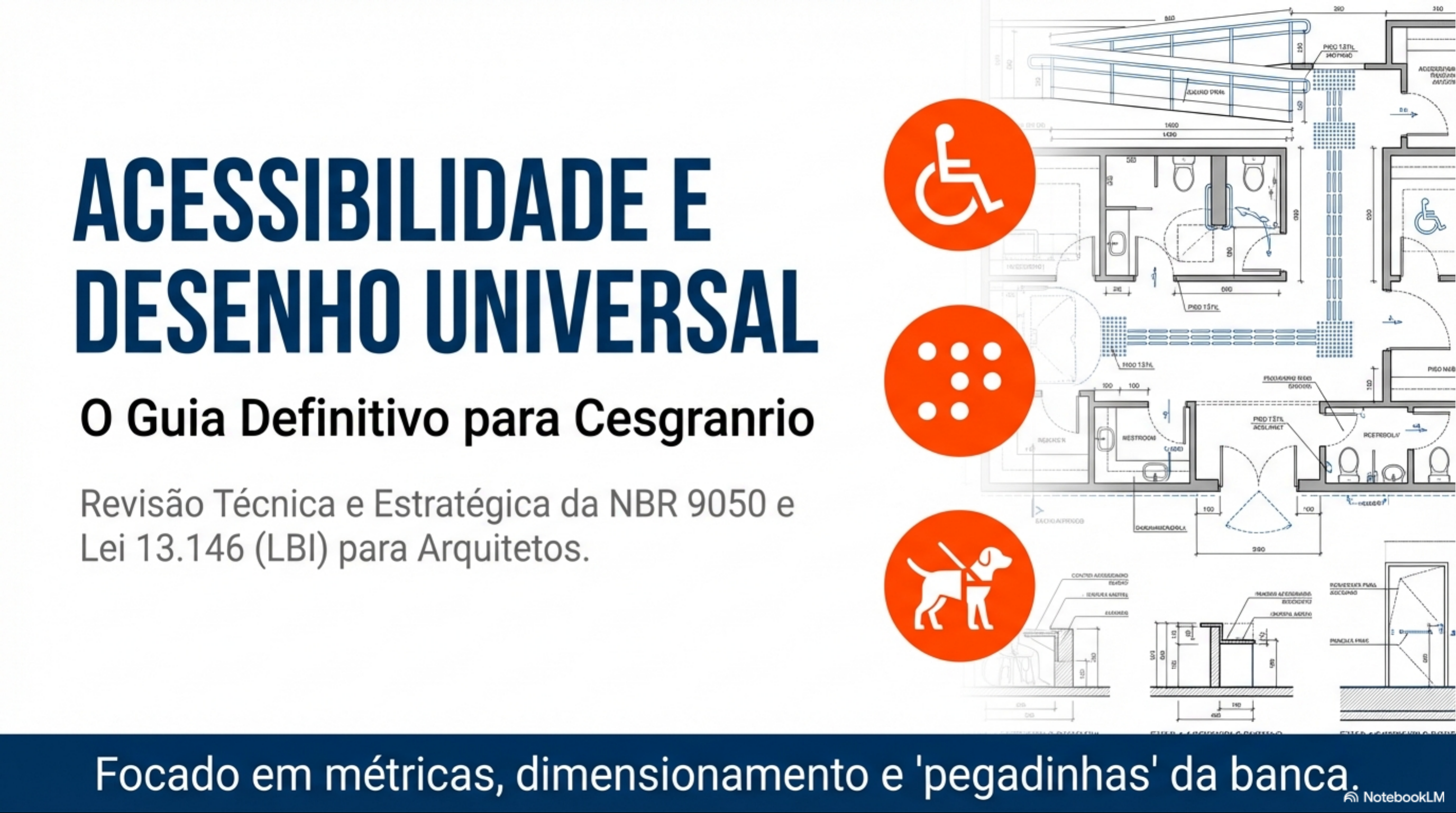 300 on ACESSIBILIDADE E DESENHO UNIVERSAL 100 100 Guia Definitivo para Cesgranrio Revisão Técnica e Estratégica da NBR 9050 e 100 Lei 13.146 (LBI) para Arquitetos. Focado em métricas, dimensionamento e 'pegadinhas' da banca. NotebookLMCONCEITOS FUNDAMENTAIS Lei 13.146 (LBI) & NBR 9050 DEFINIÇÕES TERMO DEFINIÇÃO Desenho Universal: Concepção de ACESSÍVEL Espaço, edificação ou produtos, ambientes e serviços para elemento que pode ser serem usados por todas as pessoas, alcançado, acionado e sem necessidade de adaptação ou vivenciado por qualquer projeto específico. pessoa. (Pronto para uso). Tecnologia Assistiva: Produtos, ADAPTÁVEL Espaço ou elemento equipamentos ou estratégias que cujas características promovem funcionalidade e possam ser alteradas autonomia (ex: uma bengala, um para se tornar acessível. software de leitura). (Potencial de mudança) NotebookLMCLASSIFICAÇÃO DAS BARREIRAS Lei 13.146 (LBI) - Art. 3°, IV 1. URBANÍSTICAS 2. ARQUITETÔNICAS 3. TRANSPORTES Nas vias e espaços Nos edifícios públicos e Nos sistemas e meios de públicos/privados de uso coletivo. privados. transportes. 4. COMUNICAÇÕES 5. ATITUDINAIS 6. TECNOLÓGICAS ! Obstáculos na expressão ou Comportamentos que Dificultam acesso às recebimento de mensagens. prejudiquem a participação social. tecnologias. NotebookLMANTROPOMETRIA: MÓDULO DE REFERÊNCIA (M.R.) Módulo de Referência (M.R.) É a projeção no piso ocupada por uma pessoa utilizando cadeira de rodas (motorizada ou não). 0,80 m X 1,20 m 1.20 m Conceitos Relacionados: - Área de Aproximação: Espaço livre de ! Exam Alert obstáculos para transferência (garantindo M.R.). Projeção no Piso! - Alcance Manual: Máximo frontal: 1,20 m 0.80 m Baixo: mínimo 0,40 m NotebookLMÁREAS DE MANOBRA E ROTAÇÃO AÇÃO Métricas de Ouro para a Cesgranrio Rotação 90° Rotação 180° Rotação 360° (Sem Deslocamento) 1,20 m X 1,20 m 1,50 m X 1,20 m ! ATENÇÃO: Não é quadrado! 1,20 mx 1,20 m Ø 1,50 m Rotação 180° com deslocamento: 1,50 X 1,20 m (manobra simples) 1,20 X 1,50 m (manobra em L) NotebookLMCÁLCULO DE RAMPAS (TABELA 4) Tabela 4 - Dimensionamento de rampas Desníveis máximos (h) Inclinação admissível (i) N° máx de segmentos 1,50 m 5,00% (1:20) Sem limite 1,00 m 5,00%ELEMENTOS DA RAMPA: LARGURA E PATAMARES Largura Livre: Largura: Inclinação Máx: 1,20 m (min) 8,33% Mínimo admissível: 1,20 m 1,50 min. Recomendável: 1,50 m Reformas (exceção): 0,90 m 1,20 min. Patamares (Landings): 3,00 mínimo No início e fim. A cada 50 m de comprimento. Raio Mínimo: Dimensão longitudinal mínima: Patamar 3,00 m Patamar 1,20 m. Rampa em curva - Planta NotebookLMESCADAS E CORRIMÃOS 0,92 m Fórmula de Blondel: 0,63 m ≤ 2E + P ≤ 0,65 m Piso (P): 0,28 a 0,32 m Espelho (E): 0,16 a 0,18 m 0,70 m Patamares: Obrigatório a cada 3,20 m de desnível. 30 cm NotebookLMCIRCULAÇÃO: CORREDORES E PORTAS Corredores (Largura): Uso Público: 1,50 m Uso Comum (>10m): 1,20 m diâmetro ≥ 1,50 Uso Comum (SANITÁRIOS ACESSÍVEIS: REQUISITOS GERAIS Quantificação (A Regra dos 5%): Uso Público/Coletivo: Mínimo 5% do total de cada peça. Área de Transferência (Mínimo 1 por sexo). Localização: Em rotas acessíveis. Giro 360° = 1,50 m Distância máx: 50 m. Entrada independente. Alarme: A 40 cm do piso (acionável em queda). ≥ 0,60 NotebookLMSANITÁRIOS: DETALHES TÉCNICOS Bacia, Barras e Lavatório 0,90 min. 0,70 min. 0,30 Lavatório: Altura máx (sup): 0,80 m 0,70 min. 0,75 0,75 m 0,80 m Altura livre (inf): 0,73 m (joelho) 0,90 min. (min) Barras ao redor. 0,90 min. 0,46 m (máx c/ assento) Bacia: Proibido abertura frontal. 0,80 min. a) Vista superior b) Vista lateral esquerda Figura 118 - Boxe com duas barras de 90° NotebookLMCALÇADAS E ESTACIONAMENTO Faixa de Serviço Faixa Livre Faixa de Acesso (min 0,70 m) (min 1,20 m) *Faixa Adicional de Circulação: 1,20 m 3,70 m **Vagas Reservadas: 2% (min 1)** NotebookLMAUDITÓRIOS, CINEMAS E PLATEIAS Espaço P.C.R. (Pessoa Cadeira 1.20 m de Rodas): Dimensão: 0,80 mx 1,20 m & Piso deve ser plano. 1,20 m Localização: Dispersos por setores e preços. 0,80 m * * Não segregados. 0,80 m 0.80 E Plan Detailed View NotebookLMMOBILIÁRIO E ALCANCE MANUAL 1,20 m Balcões de Atendimento: Pelo menos uma parte acessível. Altura máx: 0,90 m. 0,78 a 0,80 m Mesas: 0,73 m (min) 5% acessíveis (min 1). b) Vista lateral NotebookLM"RESUMÃO" NUMÉRICO Print Screen para a porta da prova! 1.90 0,80 1,20 & 1,50 m 1,50 1,20 m Módulo de Referência Giro 360° Giro 180° sem desloc. 8,33% 1,20 m 8,33% 1,20 m 0,92 / 0,70 m Rampa Máx Geral Largura Rampa/Calçada Alturas Corrimão 0,92 0,70 0,80 m 5% % 0,46 m % Vão Porta Cota Sanitários Alt. Máx Vaso 0,46 m Boa Prova! NotebookLM