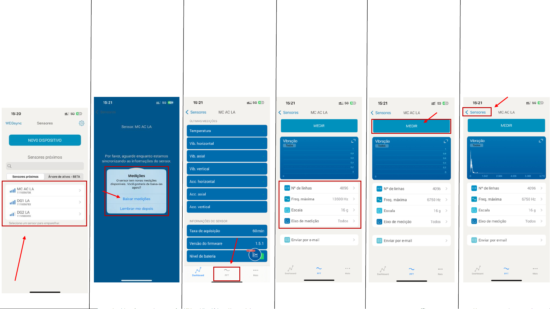 • Ative o bluetooth. • Abra o aplicativo Weg Scan. • Desloque até o compartimento que está localizado os sensores. • Selecione o sensor desejado. 1° • Caso tenha medições armazenadas no sensor irá informar na tela do aplicativo. Selecionar o campo “Baixar medições” e aguardar até a conclusão. 2° • Selecionar a opção “FFT”. 3° • Ajustar os campos conforme abaixo: N° linhas = 4096 Feq. Máxima = 6750 Hz Escala = 16 g Eixo de medição = Todos 4° • Após ajustar os campos, selecionar o campo “Medir” e aguardar completar a medição. 5° • Após a conclusão da medição, na tela irá plotar o espectro de vibração. Selecionar “Sensores” para retornar a página inicial. 6° • Se o celular estiver sem acesso à internet durante a coleta de dados, as medições ficarão armazenadas no celular; caso contrário, serão enviadas diretamente para a nuvem. Ao retornar para a página inicial, é necessário verificar se há medições a serem enviadas para a nuvem, acessando a engrenagem localizada na parte superior direita. 7° • Selecionar o campo “Medições” e certificar que há medição em vermelho, o que indica que as medições estão armazenadas no celular. 8° Selecionar o campo “enviar” e aguardar o envio completo das medições a nuvem. Após, comunicar a Preditiva para verificar se as medições de fato subiram para a nuvem 9° Slide 1 Slide 2