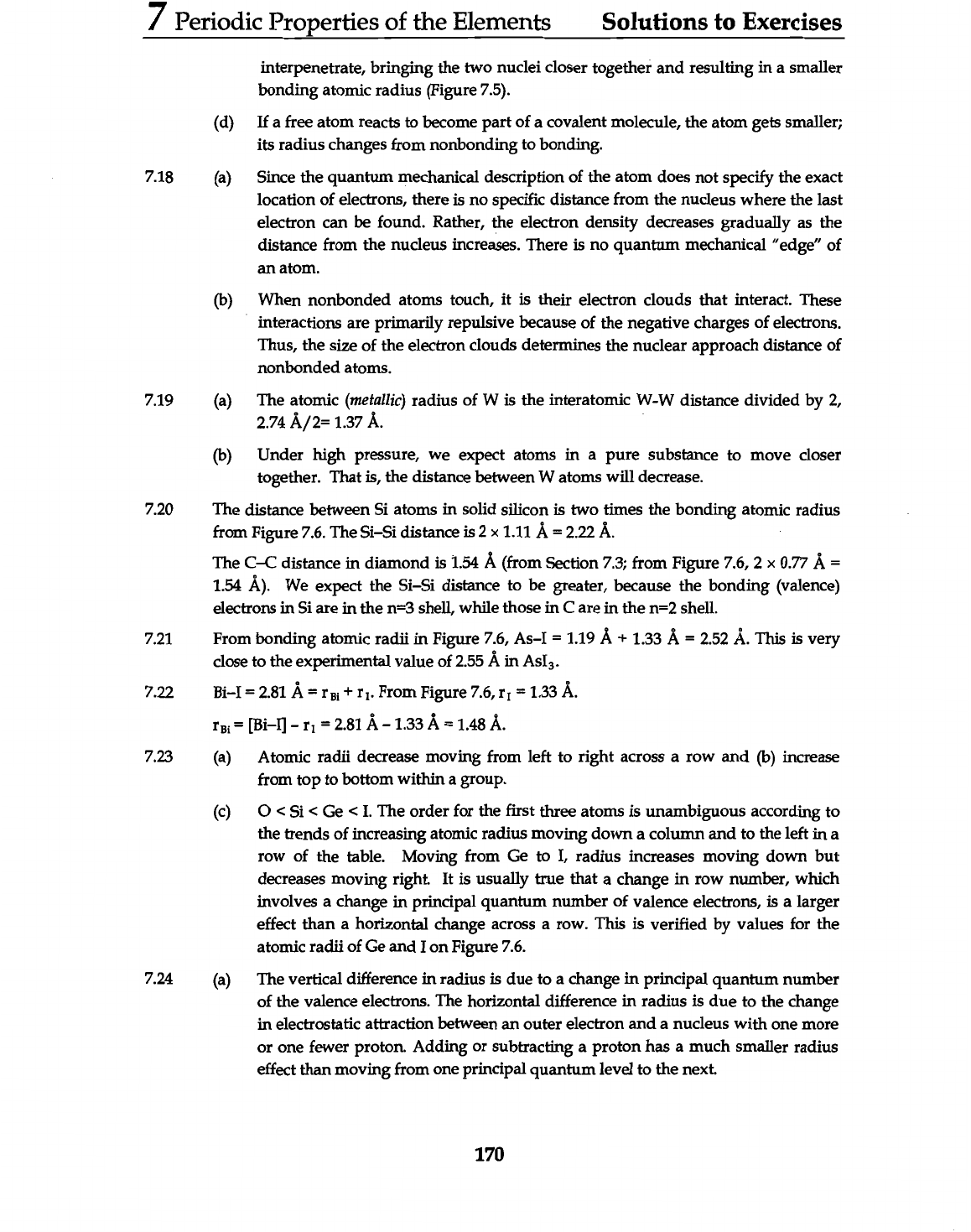7 Periodic Properties of the Elements Solutions to Exercises interpenetrate, bringing the two nuclei closer together and resulting in a smaller bonding atomic radius (Figure 7.5). (d) If a free atom reacts to become part of a covalent molecule, the atom gets smaller; its radius changes from nonbonding to bonding. 7.18 (a) Since the quantum mechanical description of the atom does not specify the exact location of electrons, there is no specific distance from the nucleus where the last electron can be found. Rather, the electron density decreases gradually as the distance from the nucleus increases. There is no quantum mechanical "edge" of an atom. (b) When nonbonded atoms touch, it is their electron clouds that interact. These interactions are primarily repulsive because of the negative charges of electrons. Thus, the size of the electron clouds determines the nuclear approach distance of nonbonded atoms. 7.19 (a) The atomic (metallic) radius of W is the interatomic W-W distance divided by 2, 2.74 Å/2= 1.37 Å. (b) Under high pressure, we expect atoms in a pure substance to move closer together. That is, the distance between W atoms will decrease. 7.20 The distance between Si atoms in solid silicon is two times the bonding atomic radius from Figure 7.6. The Si-Si distance is 2 1.11 Å = 2.22 Å. The C-C distance in diamond is 1.54 Å (from Section 7.3; from Figure 7.6, 2 X 0.77 Å = 1.54 Å). We expect the Si-Si distance to be greater, because the bonding (valence) electrons in Si are in the n=3 shell, while those in C are in the n=2 shell. 7.21 From bonding atomic radii in Figure 7.6, As-I = 1.19 Å + 1.33 Å = 2.52 Å. This is very close to the experimental value of 2.55 Å in AsI₃. 7.22 Bi-I = 2.81 Å = + r₁. From Figure 7.6, = 1.33 Å. = - r₁ = 2.81 Å - 1.33 Å = 1.48 Å. 7.23 (a) Atomic radii decrease moving from left to right across a row and (b) increase from top to bottom within a group. (c)