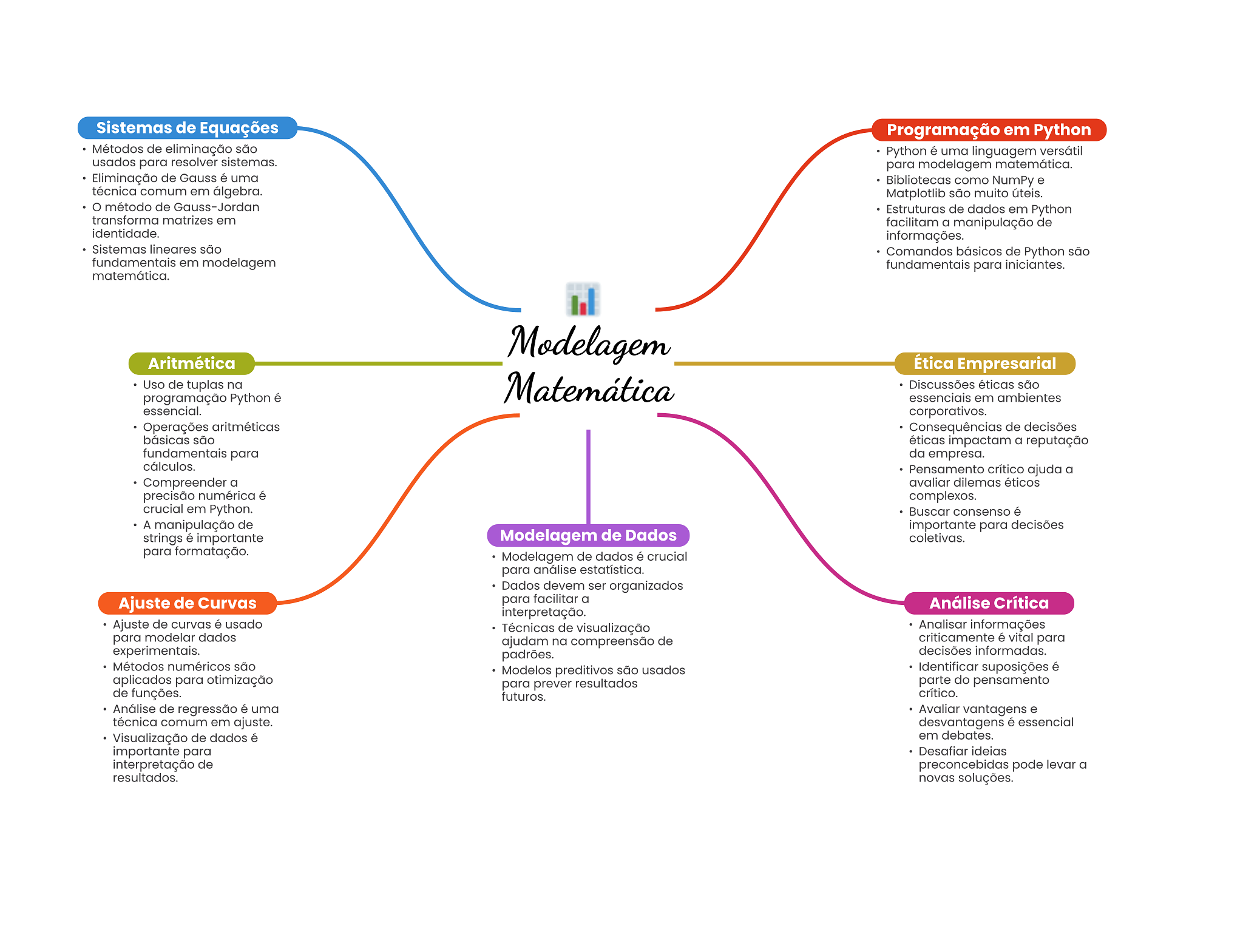 Sistemas de Equações Programação em Python Métodos de eliminação são Python é uma linguagem versátil usados para resolver sistemas. para modelagem matemática. Eliminação de Gauss é uma Bibliotecas como NumPy e técnica comum em álgebra. Matplotlib são muito úteis. método de Gauss-Jordan Estruturas de dados em Python transforma matrizes em facilitam a manipulação de identidade. informações. Sistemas lineares são Comandos básicos de Python são fundamentais em modelagem fundamentais para iniciantes. matemática. Modelagem Aritmética Ética Empresarial Uso de tuplas na Matemática Discussões éticas são programação Python é essenciais em ambientes essencial. corporativos. Operações aritméticas Consequências de decisões básicas são éticas impactam a reputação fundamentais para da empresa. cálculos. Pensamento crítico ajuda a Compreender a avaliar dilemas éticos precisão numérica é complexos. crucial em Python. Buscar consenso é A manipulação de importante para decisões strings é importante Modelagem de Dados coletivas. para formatação. Modelagem de dados é crucial para análise estatística. Dados devem ser organizados Ajuste de Curvas para facilitar a Análise Crítica interpretação. Ajuste de curvas é usado Técnicas de visualização Analisar informações para modelar dados ajudam na compreensão de criticamente é vital para experimentais. padrões. decisões informadas. Métodos numéricos são Modelos preditivos são usados Identificar suposições é aplicados para otimização para prever resultados parte do pensamento de funções. futuros. crítico. Análise de regressão é uma Avaliar vantagens e técnica comum em ajuste. desvantagens é essencial Visualização de dados é em debates. importante para Desafiar ideias interpretação de preconcebidas pode levar a resultados. novas soluções.