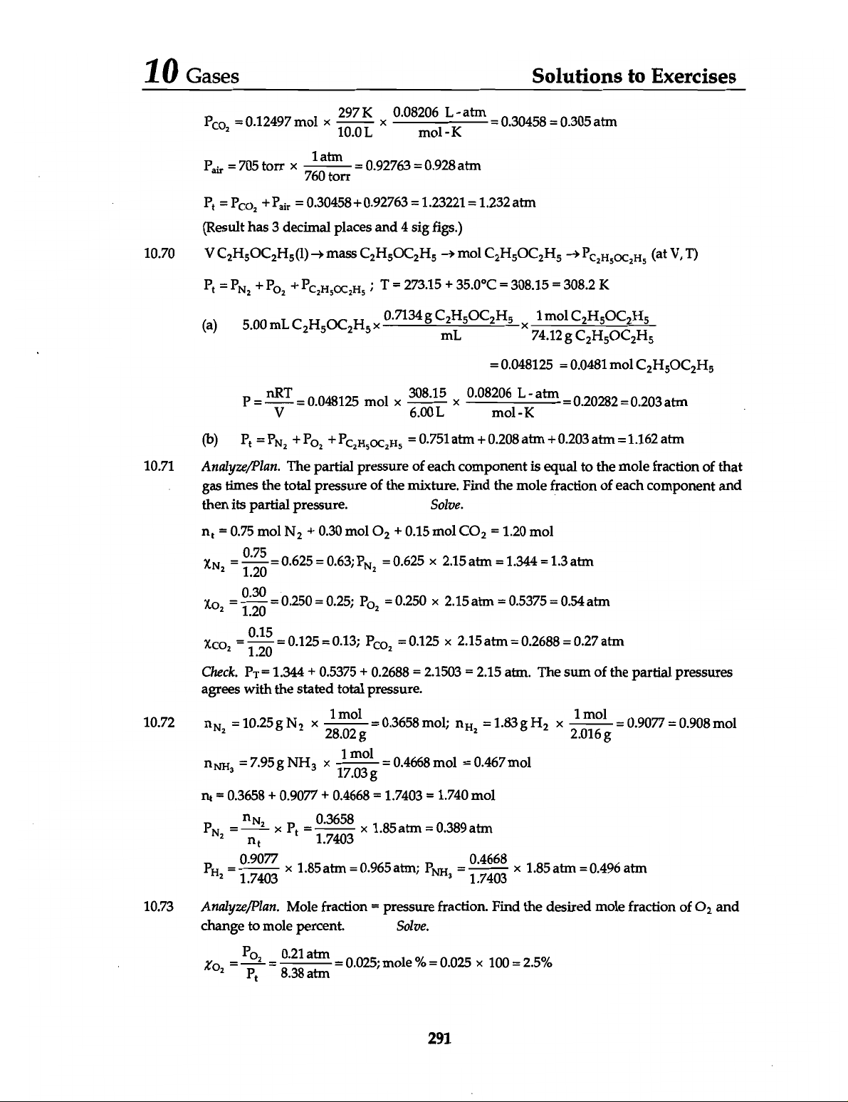 10 Gases Solutions to Exercises Pco₂ = 0.12497 mol 297 0.08206 mol L K atm = 0.30458 = 0.305 atm = = 0.928 atm 760 Pₜ = Pco₂ + Pair = 0.30458 + 0.92763 = 1.23221 = 1.232 atm (Result has 3 decimal places and 4 sig figs.) 10.70 V mass C₂H₅OC₂H₅ mol C₂H₅OC₂H₅ Pₜ = + ; T = 273.15 + 35.0°C = 308.15 = 308.2 K (a) 5.00 mL 1 mol C₂H₅OC₂H₅ = 0.048125 = 0.0481 mol C₂H₅OC₂H₅ P = nRT V = 0.048125 mol 308.15 0.08206 atm = 0.20282 = 0.203 atm (b) Pₜ = + + PC₂H₅OC₂H₅ = 0.751 atm + 0.208 atm + 0.203 atm = 1.162 atm 10.71 Analyze/Plan. The partial pressure of each component is equal to the mole fraction of that gas times the total pressure of the mixture. Find the mole fraction of each component and then its partial pressure. Solve. = 0.75 mol N₂ + 0.30 mol O₂ + 0.15 mol CO₂ = 1.20 mol = 1.20 0.75 = = = 0.625 2.15 atm = 1.344 = 1.3 atm = 0.30 1.20 = = 0.25; = 0.250 2.15 atm = 0.5375 = 0.54 atm = 1.20 0.15 = 0.125 = 0.13; = 0.125 2.15 atm = 0.2688 = 0.27 atm Check. = 1.344 + 0.5375 + 0.2688 = 2.1503 = 2.15 atm. The sum of the partial pressures agrees with the stated total pressure. 10.72 = 10.25 N₂ = 0.3658 mol; = 1.83 H₂ 2.016g 1 mol = 0.9077 = 0.908 mol = 17.03 1 mol = 0.4668 mol = 0.467 mol nt = 0.3658 + 0.9077 + 0.4668 = 1.7403 = 1.740 mol 1.7403 1.85 atm = 0.389 atm = 0.9077 1.7403 1.85 atm = 0.965 atm; = 0.4668 1.7403 1.85 atm = 0.496 atm 10.73 Analyze/Plan. Mole fraction = pressure fraction. Find the desired mole fraction of O₂ and change to mole percent. Solve. = = 8.38 0.21 atm atm = 0.025; mole % = 0.025 100 = 2.5% 291