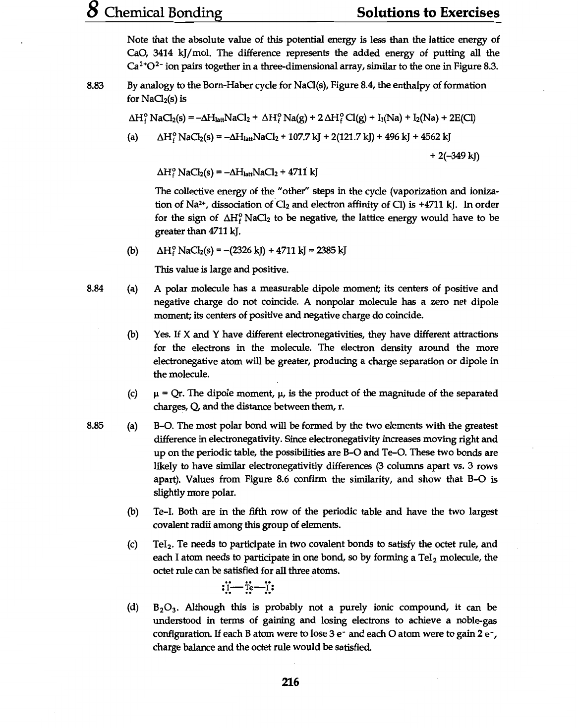 8 Chemical Bonding Solutions to Exercises Note that the absolute value of this potential energy is less than the lattice energy of CaO, 3414 kJ/mol. The difference represents the added energy of putting all the ion pairs together in a three-dimensional array, similar to the one in Figure 8.3. 8.83 By analogy to the Born-Haber cycle for NaCl(s), Figure 8.4, the enthalpy of formation for NaCl₂(s) is NaCl₂(s) = + Na(g) + 2 Cl(g) + + I₂(Na) + 2E(CI) (a) NaCl₂(s) = + 107.7 kJ + 2(121.7 kJ) + 496 kJ + 4562 kJ + 2(-349 NaCl₂(s) = + 4711 kJ The collective energy of the "other" steps in the cycle (vaporization and ioniza- tion of Na²⁺, dissociation of Cl₂ and electron affinity of is +4711 kJ. In order for the sign of NaCl₂ to be negative, the lattice energy would have to be greater than 4711 kJ. (b) NaCl₂(s) = -(2326 kJ) + 4711 kJ = 2385 kJ This value is large and positive. 8.84 (a) A polar molecule has a measurable dipole moment; its centers of positive and negative charge do not coincide. A nonpolar molecule has a zero net dipole moment; its centers of positive and negative charge do coincide. (b) Yes. If X and Y have different electronegativities, they have different attractions for the electrons in the molecule. The electron density around the more electronegative atom will be greater, producing a charge separation or dipole in the molecule. (c) µ = Qr. The dipole moment, µ, is the product of the magnitude of the separated charges, Q and the distance between them, r. 8.85 (a) B-O. The most polar bond will be formed by the two elements with the greatest difference in electronegativity. Since electronegativity increases moving right and up on the periodic table, the possibilities are B-O and Te-O. These two bonds are likely to have similar electronegativitiy differences (3 columns apart 3 rows apart). Values from Figure 8.6 confirm the similarity, and show that B-O is slightly more polar. (b) Te-I. Both are in the fifth row of the periodic table and have the two largest covalent radii among this group of elements. (c) Te needs to participate in two covalent bonds to satisfy the octet rule, and each I atom needs to participate in one bond, so by forming a molecule, the octet rule can be satisfied for all three atoms. (d) B₂O₃. Although this is probably not a purely ionic compound, it can be understood in terms of gaining and losing electrons to achieve a noble-gas configuration. If each B atom were to lose 3 and each o atom were to gain 2 charge balance and the octet rule would be satisfied. 216