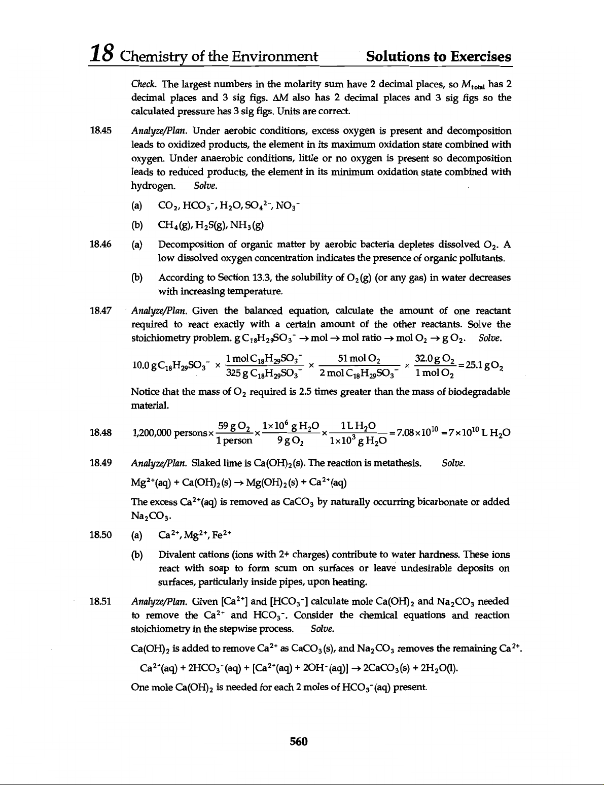 18 Chemistry of the Environment Solutions to Exercises Check. The largest numbers in the molarity sum have 2 decimal places, so has 2 decimal places and 3 sig figs. AM also has 2 decimal places and 3 sig figs so the calculated pressure has 3 sig figs. Units are correct. 18.45 Analyze/Plan. Under aerobic conditions, excess oxygen is present and decomposition leads to oxidized products, the element in its maximum oxidation state combined with oxygen. Under anaerobic conditions, little or no oxygen is present so decomposition leads to reduced products, the element in its minimum oxidation state combined with hydrogen. Solve. (a) (b) 18.46 (a) Decomposition of organic matter by aerobic bacteria depletes dissolved A low dissolved oxygen concentration indicates the presence of organic pollutants. (b) According to Section 13.3, the solubility of O₂(g) (or any gas) in water decreases with increasing temperature. 18.47 Analyze/Plan. Given the balanced equation, calculate the amount of one reactant required to react exactly with a certain amount of the other reactants. Solve the stoichiometry problem. g mol mol ratio mol O₂ g Solve. Notice that the mass of O₂ required is 2.5 times greater than the mass of biodegradable material. 18.48 1,200,000 persons 1 person = = x10¹⁰ 18.49 Analyze/Plan. Slaked lime is Ca(OH)₂(s). The reaction is metathesis. Solve. + Ca(OH)₂(s) Mg(OH)₂(s) + The excess is removed as CaCO₃ by naturally occurring bicarbonate or added Na₂CO₃. 18.50 (a) Mg²⁺, (b) Divalent cations (ions with 2+ charges) contribute to water hardness. These ions react with soap to form scum on surfaces or leave undesirable deposits on surfaces, particularly inside pipes, upon heating. 18.51 Analyze/Plan. Given [Ca²⁺] and [HCO₃⁻] calculate mole Ca(OH)₂ and Na₂CO₃ needed to remove the Ca²⁺ and Consider the chemical equations and reaction stoichiometry in the stepwise process. Solve. Ca(OH)₂ is added to remove as CaCO₃(s), and Na₂CO₃ removes the remaining Ca²⁺. Ca + (aq) + + One mole Ca(OH)₂ is needed for each 2 moles of (aq) present. 560