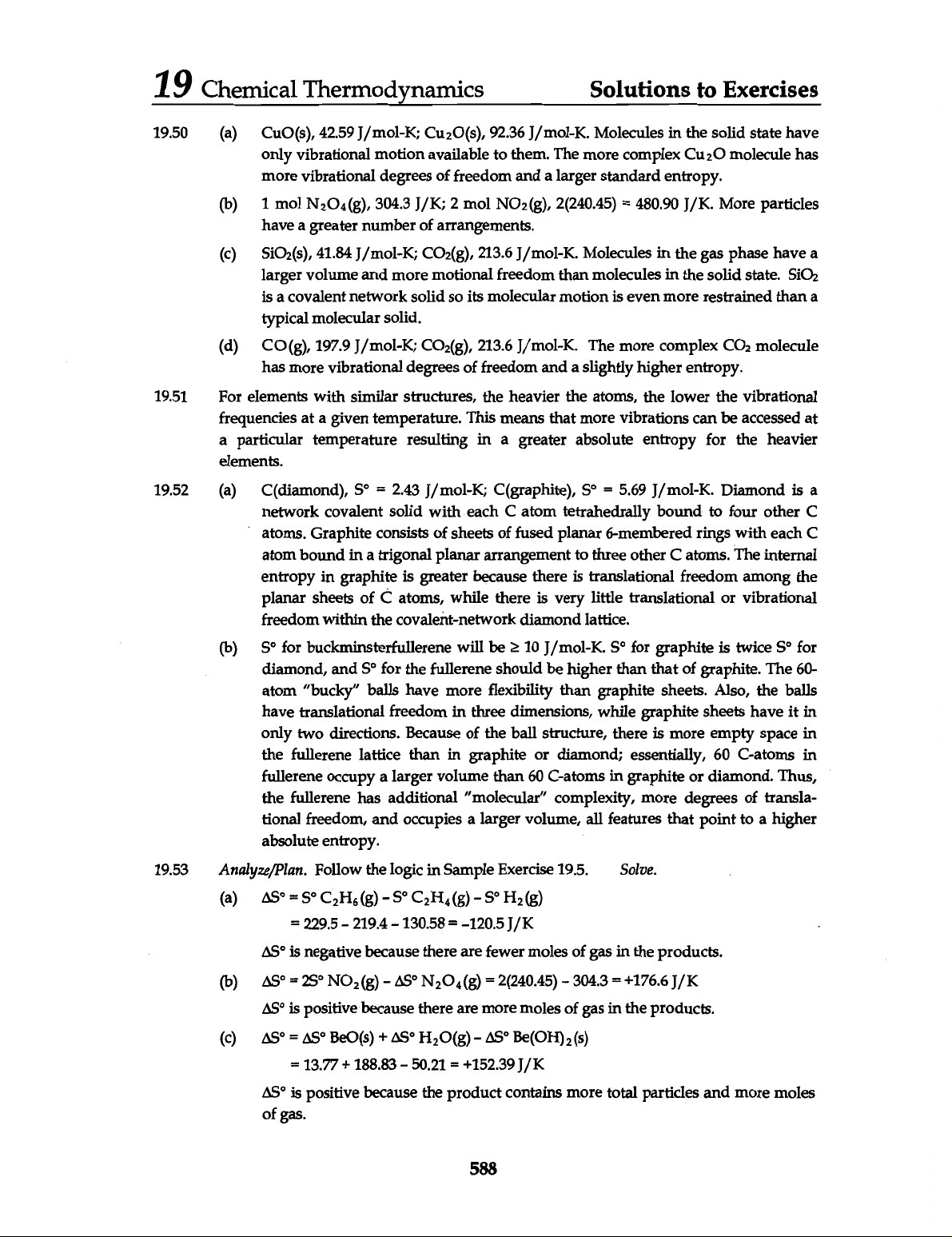 19 Chemical Thermodynamics Solutions to Exercises 19.50 (a) CuO(s), 42.59 J/mol-K; Cu₂O(s), Molecules in the solid state have only vibrational motion available to them. The more complex molecule has more vibrational degrees of freedom and a larger standard entropy. (b) 1 mol N₂O₄(g), 304.3 J/K; 2 mol 2(240.45) = 480.90 J/K. More particles have a greater number of arrangements. (c) SiO₂(s), Molecules in the gas phase have a larger volume and more motional freedom than molecules in the solid state. SiO₂ is a covalent network solid so its molecular motion is even more restrained than a typical molecular solid. (d) CO(g), The more complex molecule has more vibrational degrees of freedom and a slightly higher entropy. 19.51 For elements with similar structures, the heavier the atoms, the lower the vibrational frequencies at a given temperature. This means that more vibrations can be accessed at a particular temperature resulting in a greater absolute entropy for the heavier elements. 19.52 (a) C(diamond), S° = 2.43 J/mol-K; C(graphite), S° = 5.69 J/mol-K. Diamond is a network covalent solid with each C atom tetrahedrally bound to four other C atoms. Graphite consists of sheets of fused planar 6-membered rings with each C atom bound in a trigonal planar arrangement to three other C atoms. The internal entropy in graphite is greater because there is translational freedom among the planar sheets of C atoms, while there is very little translational or vibrational freedom within the covalent-network diamond lattice. (b) S° for will be ≥ 10 J/mol-K. S° for graphite is twice S° for diamond, and S° for the fullerene should be higher than that of graphite. The 60- atom "bucky" balls have more flexibility than graphite sheets. Also, the balls have translational freedom in three dimensions, while graphite sheets have it in only two directions. Because of the ball structure, there is more empty space in the fullerene lattice than in graphite or diamond; essentially, 60 C-atoms in fullerene occupy a larger volume than 60 C-atoms in graphite or diamond. Thus, the fullerene has additional "molecular" complexity, more degrees of transla- tional freedom, and occupies a larger volume, all features that point to a higher absolute entropy. 19.53 Analyze/Plan. Follow the logic in Sample Exercise 19.5. Solve. (a) = S° - C₂H₄(g) - = 229.5 - 219.4 - 130.58 = is negative because there are fewer moles of gas in the products. (b) = 2S° - = 2(240.45) - 304.3 = +176.6J/K is positive because there are more moles of gas in the products. (c) = BeO(s) + H₂O(g) - Be(OH)₂(s) = 13.77 + 188.83 - 50.21 = +152.39 is positive because the product contains more total particles and more moles of gas. 588