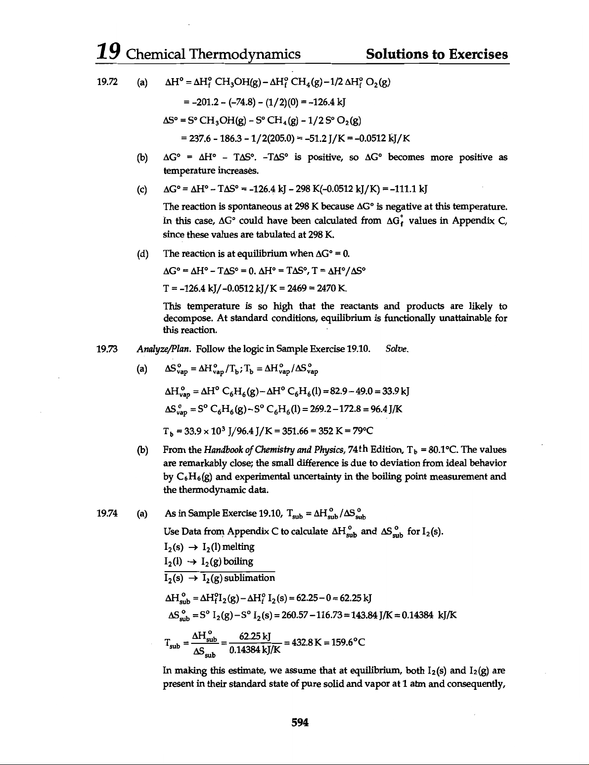 19 Chemical Thermodynamics Solutions to Exercises 19.72 (a) = 1/2 O₂(g) = = 237.6 - 186.3 1/2(205.0) = = -0.0512 kJ/K (b) = - -TAS° is positive, so becomes more positive as temperature (c) = - TAS° = -126.4 K(-0.0512 kJ/K) = -111.1 kJ The reaction is spontaneous at 298 K because is negative at this temperature. In this case, could have been calculated from values in Appendix C, since these values are tabulated at 298 K. (d) The reaction is at equilibrium when = 0. = - = 0. = T = T = -126.4 kJ/K = = 2470 K. This temperature is so high that the reactants and products are likely to decompose. At standard conditions, equilibrium is functionally unattainable for this reaction. 19.73 Analyze/Plan. Follow the logic in Sample Exercise 19.10. Solve. (a) = = Tb = 33.9 10³ J/96.4J/K = 351.66 = 352 K = 79°C (b) From the Handbook of Chemistry and Physics, 74th Edition, Tb = 80.1°C. The values are remarkably close; the small difference is due to deviation from ideal behavior by and experimental uncertainty in the boiling point measurement and the thermodynamic data. 19.74 (a) As in Sample Exercise 19.10, = Use Data from Appendix C to calculate and for I₂(s). I₂(s) I₂(1) melting I₂(g) boiling I₂(s) sublimation = = = = In making this estimate, we assume that at equilibrium, both I₂ (s) and I₂(g) are present in their standard state of pure solid and vapor at 1 atm and consequently, 594