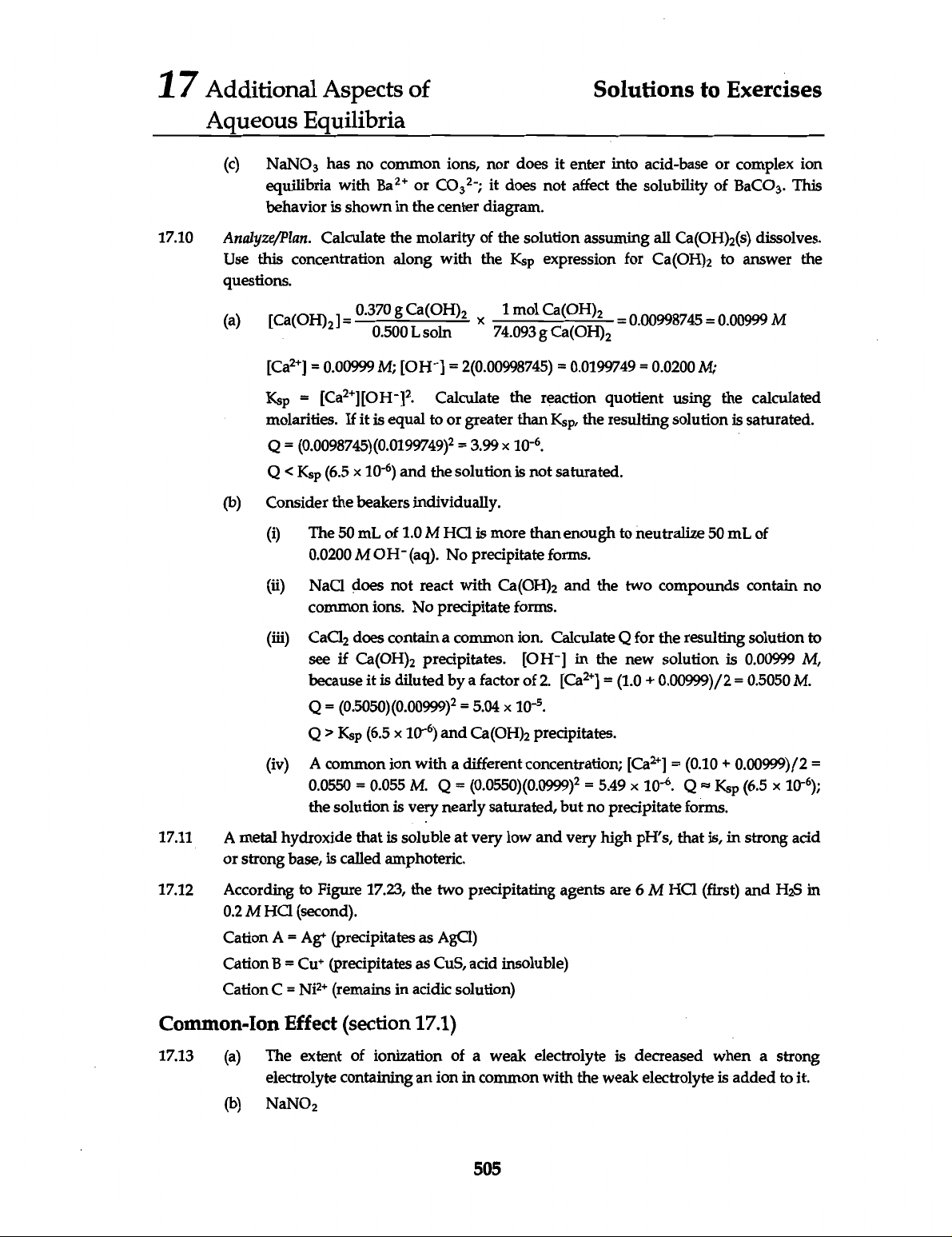 17 Additional Aspects of Solutions to Exercises Aqueous Equilibria (c) NaNO₃ has no common ions, nor does it enter into acid-base or complex ion equilibria with or it does not affect the solubility of BaCO₃. This behavior is shown in the center diagram. 17.10 Analyze/Plan. Calculate the molarity of the solution assuming all Ca(OH)₂(s) dissolves. Use this concentration along with the Ksp expression for Ca(OH)₂ to answer the questions. (a) = 0.370 0.500 Ca(OH)₂ L soln 74.093 1 mol g Ca(OH)₂ Ca(OH)₂ = 0.00998745 = 0.00999 M [Ca²⁺] = 0.00999 M; [OH⁻] = 2(0.00998745) = 0.0199749 = 0.0200 M; Ksp = Calculate the reaction quotient using the calculated molarities. If it is equal to or greater than Ksp, the resulting solution is saturated. Q = = 3.99 10⁻⁶. Q Ksp (6.5 10⁻⁶) and Ca(OH)₂ precipitates. (iv) A common ion with a different concentration; [Ca²⁺] = (0.10 + 0.00999)/2 = 0.0550 = 0.055 M. Q = = 5.49 10⁻⁶. Q ≈ Ksp (6.5 the solution is very nearly saturated, but no precipitate forms. 17.11 A metal hydroxide that is soluble at very low and very high pH's, that is, in strong acid or strong base, is called amphoteric. 17.12 According to Figure 17.23, the two precipitating agents are 6 M (first) and in 0.2 M (second). Cation A = Ag+ (precipitates as Cation B = Cu+ (precipitates as CuS, acid insoluble) Cation = Ni²⁺ (remains in acidic solution) Common-Ion Effect (section 17.1) 17.13 (a) The extent of ionization of a weak electrolyte is decreased when a strong electrolyte containing an ion in common with the weak electrolyte is added to it. (b) NaNO₂ 505