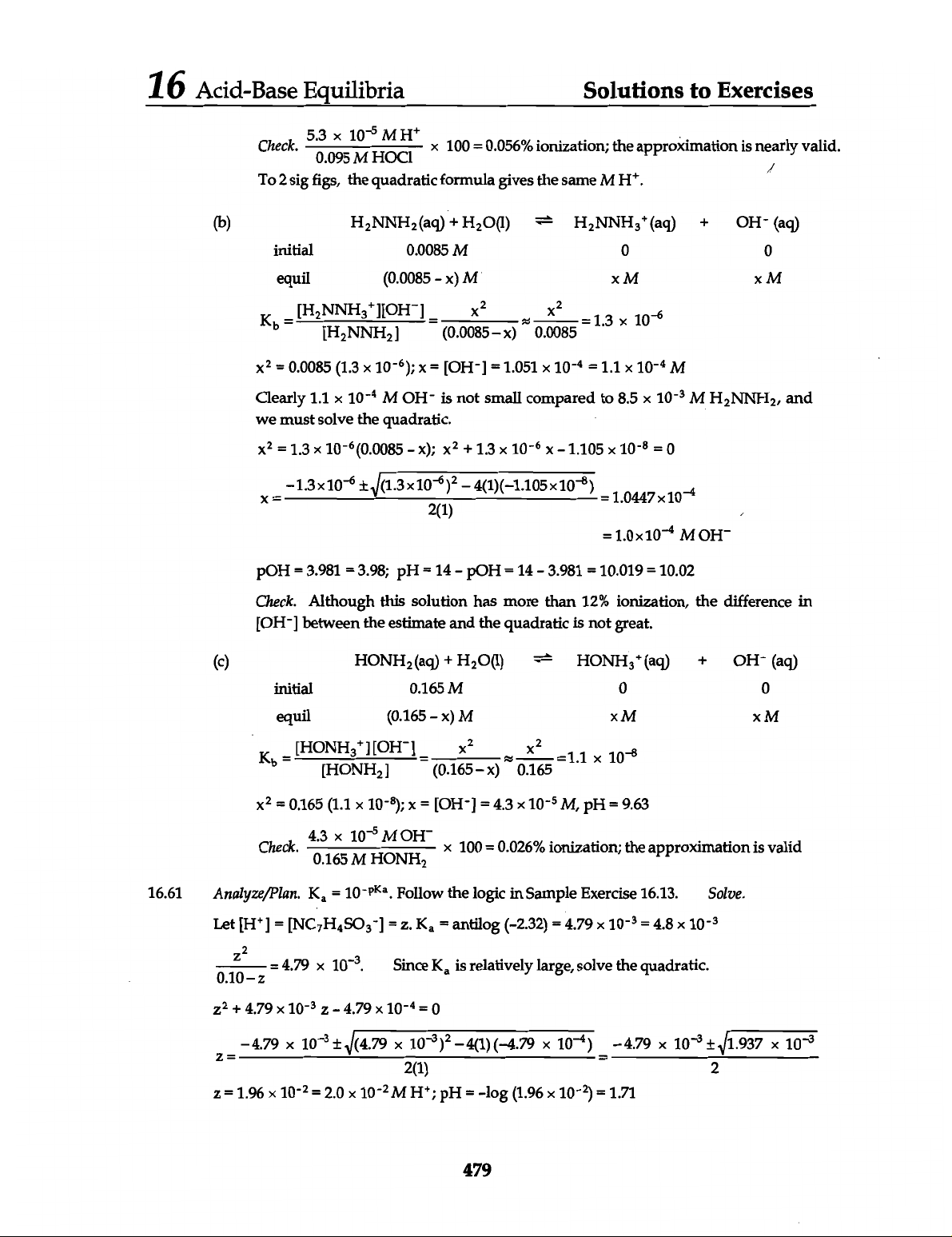 16 Acid-Base Equilibria Solutions to Exercises Check. 5.3 X 10⁻⁵ M X 100 = 0.056% ionization; the approximation is nearly valid. 0.095 M HOCI To 2 sig figs, the quadratic formula gives the same M (b) 1L (aq) + OH- (aq) initial 0.0085 M 0 0 equil (0.0085 x) M X M X M ≈ = 0.0085 (1.3 = = 1.051 10⁻⁴ = 1.1 10⁻⁴ M Clearly 1.1 X 10⁻⁴ M OH- is not small compared to 8.5 10⁻³ M and we must solve the quadratic. = 1.3 (0.0085 x); + 1.3 10⁻⁶ 1.105 = 0 X = 2(1) = M OH⁻ pOH = 3.981 = 3.98; pH = pOH = 14 3.981 = 10.019 = 10.02 Check. Although this solution has more than 12% ionization, the difference in [OH⁻] between the estimate and the quadratic is not great. (c) 1L (aq) + OH- (aq) initial 0.165 M 0 0 equil X M X M ≈ Check. 4.3 0.165 X 10⁻⁵ M OH⁻ X 100 = 0.026% ionization; the approximation is valid M 16.61 Analyze/Plan. = Follow the logic in Sample Exercise 16.13. Solve. Let = [NC₇H₄SO₃⁻] = = antilog (-2.32) = 4.79 10⁻³ = 4.8 z² = 4.79 10⁻³. Since is relatively large, solve the quadratic. 0.10-z -4.79 10⁻³ ± 4(1) (-4.79 -4.79 10⁻³ 10⁻³ = = 2(1) 2 Z = 1.96 X = 2.0 X 10⁻² pH = -log (1.96 = 1.71 479