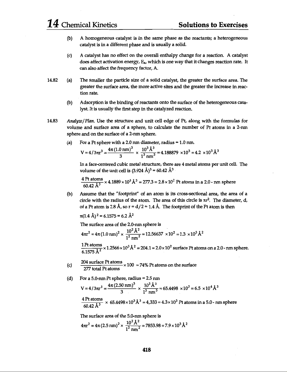 14 Chemical Kinetics Solutions to Exercises (b) A homogeneous catalyst is in the same phase as the reactants; a heterogeneous catalyst is in a different phase and is usually a solid. (c) A catalyst has no effect on the overall enthalpy change for a reaction. A catalyst does affect activation energy, Ea, which is one way that it changes reaction rate. It can also affect the frequency factor, A. 14.82 (a) The smaller the particle size of a solid catalyst, the greater the surface area. The greater the surface area, the more active sites and the greater the increase in reac- tion rate. (b) Adsorption is the binding of reactants onto the surface of the heterogeneous cata- lyst. It is usually the first step in the catalyzed reaction. 14.83 Analyze/Plan. Use the structure and unit cell edge of Pt, along with the formulas for volume and surface area of a sphere, to calculate the number of Pt atoms in a 2-nm sphere and on the surface of a 2-nm sphere. (a) For a Pt sphere with a 2.0 nm diameter, radius = 1.0 nm. V = =4/3πr³ = 3 1³ = 4.188879 10³ = 4.2 10³ ų In a face-centered cubic metal structure, there are 4 metal atoms per unit cell. The volume of the unit cell is (3.924 Å)³ = 60.42 ų 4 Pt atoms 60.42 ų X 4.1889 10³ = 277.3 = 2.8 Pt atoms in a 2.0 - nm sphere (b) Assume that the "footprint" of an atom is its cross-sectional area, the area of a circle with the radius of the atom. The area of this circle is The diameter, d, of a Pt atom is 2.8 Å, so r = d/2 = 1.4 Å. The footprint of the Pt atom is then The surface area of the 2.0-nm sphere is = = 12.56637 10² = 1.3 10³ 1 Pt atoms 6.1575 Å 1.2566 X = 204.1 = surface Pt atoms on a 2.0 nm sphere. (c) 204 surface Pt atoms 100 = 74% Pt atoms on the surface 277 total Pt atoms (d) For a 5.0-nm Pt sphere, radius = 2.5 nm V = 3 = 3 = 65.4498 10³ = 6.5 10⁴ 4 Pt atoms 60.42 ų 65.4498 10³ ų = 4,333 = Pt atoms in a 5.0 nm sphere The surface area of the 5.0-nm sphere is 418