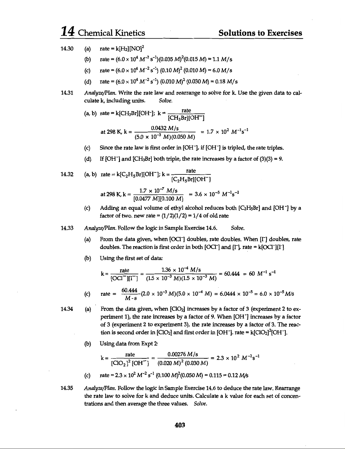 14 Chemical Kinetics Solutions to Exercises 14.30 (a) rate = k[H₂][NO]² (b) rate = (6.0 X 10⁴ s⁻¹)(0.035 M)²(0.015 M) = 1.1 M/s (c) rate = (6.0 10⁴ (0.10 (0.010 M) = 6.0 M/s (d) rate = (6.0 X 10⁴ (0.010 M)² (0.030 M) = 0.18 M/s 14.31 Analyze/Plan. Write the rate law and rearrange to solve for k. Use the given data to cal- culate k, including units. Solve. (a, b) rate = k[CH₃Br][OH⁻]; k = [CH₃Br][OH⁻] rate 0.0432 M/s at 298 K, k = (5.0 10⁻³ M)(0.050 M) = 1.7 X 10² (c) Since the rate law is first order in if [OH⁻] is tripled, the rate triples. (d) If [OH⁻] and [CH₃Br] both triple, the rate increases by a factor of (3)(3) = 9. rate 14.32 (a, b) rate = k = at 298 K, k = [0.0477 1.7 M][0.100 10⁻⁷ M/s M] = 3.6 X 10⁻⁵ (c) Adding an equal volume of ethyl alcohol reduces both and by a factor of two. new rate = (1/2)(1/2) = 1/4 of old rate 14.33 Analyze/Plan. Follow the logic in Sample Exercise 14.6. Solve. (a) From the data given, when doubles, rate doubles. When [Γ] doubles, rate doubles. The reaction is first order in both and rate = (b) Using the first set of data: 1.36 10⁻⁴ M/s k = rate = (1.5 10⁻³ X X 10⁻³ M) = 60.444 = 60 (c) rate = 60.444 M-s (2.0 X 10⁻³ M)(5.0 X 10⁻⁴ M) = 6.0444 10⁻⁵ = 6.0 X 10⁻⁵ M/s 14.34 (a) From the data given, when increases by a factor of 3 (experiment 2 to ex- periment 1), the rate increases by a factor of 9. When increases by a factor of 3 (experiment 2 to experiment 3), the rate increases by a factor of 3. The reac- tion is second order in and first order in [OH⁻]. rate = (b) Using data from Expt 2: k = rate [OH⁻] = (0.020 0.00276 (0.030 M/s = 2.3 10² (c) rate = 2.3 10² (0.100 M) = 0.115 = 0.12 M/s 14.35 Analyze/Plan. Follow the logic in Sample Exercise 14.6 to deduce the rate law. Rearrange the rate law to solve for k and deduce units. Calculate a k value for each set of concen- trations and then average the three values. Solve. 403