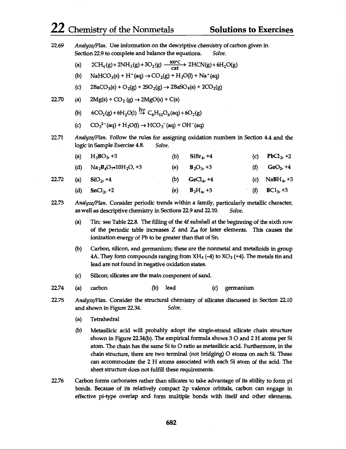 22 Chemistry of the Nonmetals Solutions to Exercises 22.69 Analyze/Plan. Use information on the descriptive chemistry of carbon given in Section 22.9 to complete and balance the equations. Solve. (a) 800°C 2HCN(g)+6H₂O(g) (b) NaHCO₃(s) + (c) 22.70 (a) 2Mg(s) + CO₂ (g) 2MgO(s) + C(s) (b) (c) + 22.71 Analyze/Plan. Follow the rules for assigning oxidation numbers in Section 4.4 and the logic in Sample Exercise 4.8. Solve. (a) (b) SiBr₄, +4 (c) +2 (d) (e) B₂O₃, +3 (f) +4 22.72 (a) SiO₂, +4 (b) GeCl₄, +4 (c) NaBH₄, +3 (d) SnCl₂, +2 (e) (f) BCl₃, +3 22.73 Analyze/Plan. Consider periodic trends within a family, particularly metallic character, as well as descriptive chemistry in Sections 22.9 and 22.10. Solve. (a) Tin; see Table 22.8. The filling of the 4f subshell at the beginning of the sixth row of the periodic table increases Z and Zeff for later elements. This causes the ionization energy of Pb to be greater than that of Sn. (b) Carbon, silicon, and germanium; these are the nonmetal and metalloids in group 4A. They form compounds ranging from XH₄ (-4) to XO₂ (+4). The metals tin and lead are not found in negative oxidation states. (c) Silicon; silicates are the main component of sand. 22.74 (a) carbon (b) lead (c) germanium 22.75 Analyze/Plan. Consider the structural chemistry of silicates discussed in Section 22.10 and shown in Figure 22.34. Solve. (a) Tetrahedral (b) Metasilicic acid will probably adopt the single-strand silicate chain structure shown in Figure 22.34(b). The empirical formula shows 3 o and 2 H atoms per Si atom. The chain has the same Si to o ratio as metasilicic acid. Furthermore, in the chain structure, there are two terminal (not bridging) o atoms on each Si. These can accommodate the 2 H atoms associated with each Si atom of the acid. The sheet structure does not fulfill these requirements. 22.76 Carbon forms carbonates rather than silicates to take advantage of its ability to form pi bonds. Because of its relatively compact 2p valence orbitals, carbon can engage in effective pi-type overlap and form multiple bonds with itself and other elements. 682