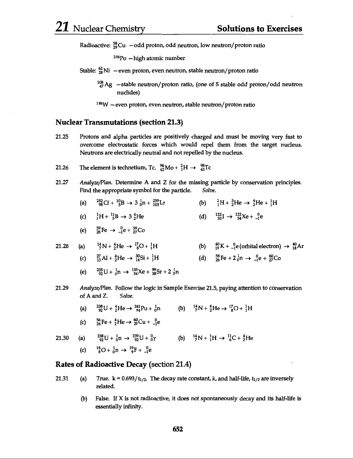 21 Nuclear Chemistry Solutions to Exercises Radioactive: Cu -odd proton, odd neutron, low neutron/proton ratio high atomic number Stable: 28 Ni - even proton, even neutron, stable neutron/proton ratio stable neutron/proton ratio, (one of 5 stable odd proton/odd neutron nuclides) even proton, even neutron, stable neutron/proton ratio Nuclear Transmutations (section 21.3) 21.25 Protons and alpha particles are positively charged and must be moving very fast to overcome electrostatic forces which would repel them from the target nucleus. Neutrons are electrically neutral and not repelled by the nucleus. 21.26 The element is technetium, Tc. 21.27 Analyze/Plan. Determine A and Z for the missing particle by conservation principles. Find the appropriate symbol for the particle. Solve. (a) (b) + (c) 3 (d) 1321 (e) 21.28 (a) (b) + (orbital electron) (c) (d) + Co (e) 21.29 Analyze/Plan. Follow the logic in Sample Exercise 21.5, paying attention to conservation of A and Z. Solve. (a) (b) (c) 21.30 (a) (b) + (c) Rates of Radioactive Decay (section 21.4) 21.31 (a) True. k = The decay rate constant, k, and half-life, t1/2 are inversely related. (b) False. If X is not radioactive, it does not spontaneously decay and its half-life is essentially infinity. 652