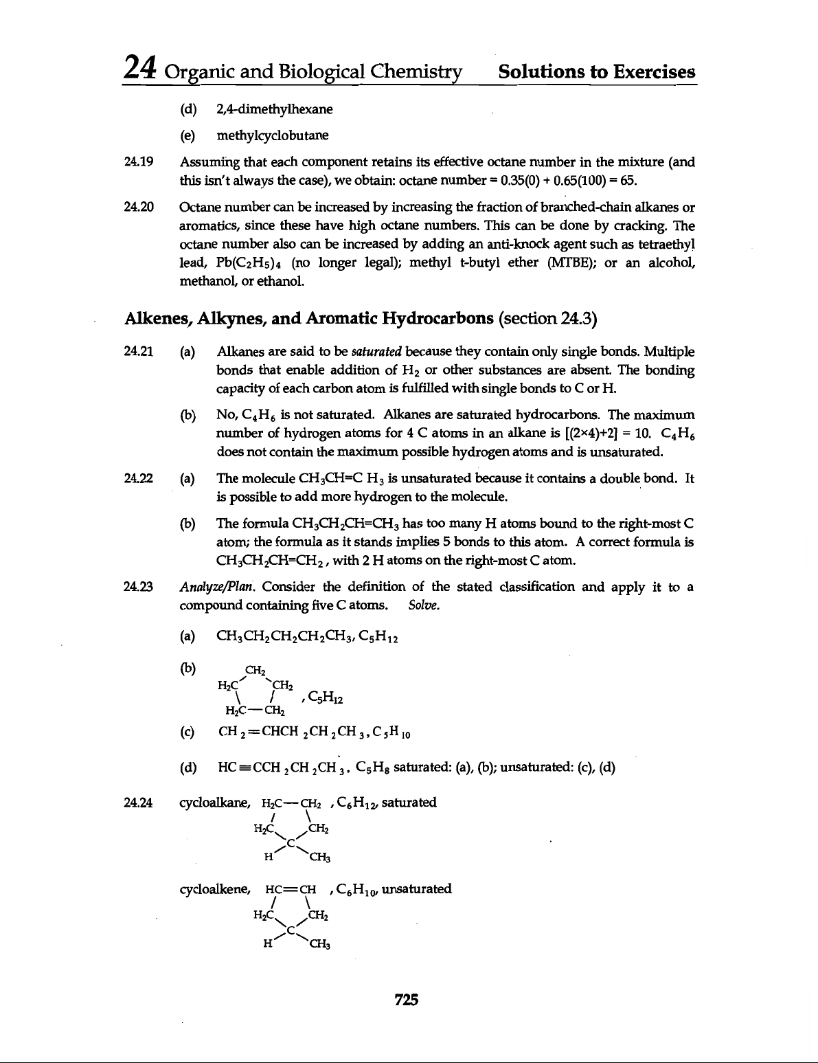 24 Organic and Biological Chemistry Solutions to Exercises (d) 2,4-dimethylhexane (e) methylcyclobutane 24.19 Assuming that each component retains its effective octane number in the mixture (and this isn't always the case), we obtain: octane number = 0.35(0) + 0.65(100) = 65. 24.20 Octane number can be increased by increasing the fraction of branched-chain alkanes or aromatics, since these have high octane numbers. This can be done by cracking. The octane number also can be increased by adding an anti-knock agent such as tetraethyl lead, Pb(C₂H₅)₄ (no longer legal); methyl t-butyl ether (MTBE); or an alcohol, methanol, or ethanol. Alkenes, Alkynes, and Aromatic Hydrocarbons (section 24.3) 24.21 (a) Alkanes are said to be saturated because they contain only single bonds. Multiple bonds that enable addition of H₂ or other substances are absent. The bonding capacity of each carbon atom is fulfilled with single bonds to C or H. (b) No, C₄H₆ is not saturated. Alkanes are saturated hydrocarbons. The maximum number of hydrogen atoms for 4 C atoms in an alkane is [(2x4)+2] = 10. C₄H₆ does not contain the maximum possible hydrogen atoms and is unsaturated. 24.22 (a) The molecule is unsaturated because it contains a double bond. It is possible to add more hydrogen to the molecule. (b) The formula has too many H atoms bound to the right-most C atom; the formula as it stands implies 5 bonds to this atom. A correct formula is with 2 H atoms on the right-most C atom. 24.23 Analyze/Plan. Consider the definition of the stated classification and apply it to a compound containing five atoms. Solve. (a) (b) CH₂ CH₂ / , (c) (d) C₅H₈ saturated: (a), (b); unsaturated: (c), (d) 24.24 cycloalkane, ,C₆H₁₂ saturated CH₂ C H CH₃ cycloalkene, HC=CH ,C₆H₁₀, unsaturated CH₂ C H CH₃ 725