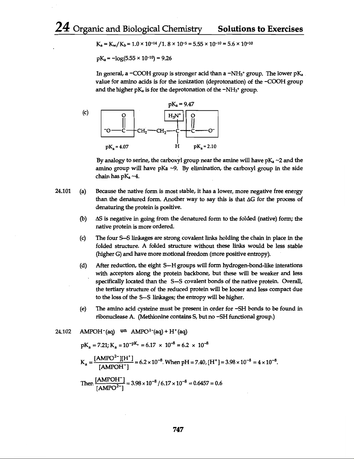 24 Organic and Biological Chemistry Solutions to Exercises = Kw/Kb = 1.0 10⁻¹⁴ 8 10⁻⁵ = 5.55 10⁻¹⁰ = 5.6 10⁻¹⁰ In general, a -COOH group is stronger acid than a group. The lower value for amino acids is for the ionization (deprotonation) of the -COOH group and the higher is for the deprotonation of the group. = 9.47 (c) C C C = 4.07 H By analogy to serine, the carboxyl group near the amine will have ~2 and the amino group will have pKa ~9. By elimination, the carboxyl group in the side chain has ~4. 24.101 (a) Because the native form is most stable, it has a lower, more negative free energy than the denatured form. Another way to say this is that G for the process of denaturing the protein is positive. (b) is negative in going from the denatured form to the folded (native) form; the native protein is more ordered. (c) The four S-S linkages are strong covalent links holding the chain in place in the folded structure. A folded structure without these links would be less stable (higher G) and have more motional freedom (more positive entropy). (d) After reduction, the eight S-H groups will form hydrogen-bond-like interations with acceptors along the protein backbone, but these will be weaker and less specifically located than the S-S covalent bonds of the native protein. Overall, the tertiary structure of the reduced protein will be looser and less compact due to the loss of the S-S linkages; the entropy will be higher. (e) The amino acid cysteine must be present in order for -SH bonds to be found in ribonuclease A. (Methionine contains S, but no -SH functional group.) 24.102 = = 6.2 747