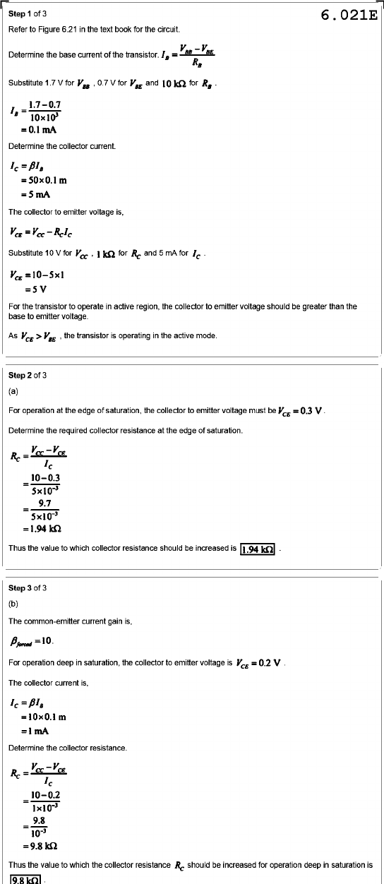 Step 1 of 3 6.021E Refer to Figure 6.21 in the text book for the circuit. Determine the base current of the transistor. Substitute 1.7 V for , 0.7 V for and 10 kΩ for Determine the collector current. The collector to emitter voltage is, Substitute 10 V for for Rc and 5 mA for =5V For the transistor to operate in active region, the collector to emitter voltage should be greater than the base to emitter voltage. As > the transistor is operating in the active mode. Step 2 of 3 (a) For operation at the edge of saturation, the collector to emitter voltage must be = 0.3 V. Determine the required collector resistance at the edge of saturation. 10-0.3 = = 5x10⁻³ Thus the value to which collector resistance should be increased is Step 3 of 3 (b) The common-emitter current gain is, For operation deep in saturation, the collector to emitter voltage is The collector current is, =10x0.1m Determine the collector resistance. 10-0.2 = 9.8 = Thus the value to which the collector resistance should be increased for operation deep in saturation is
