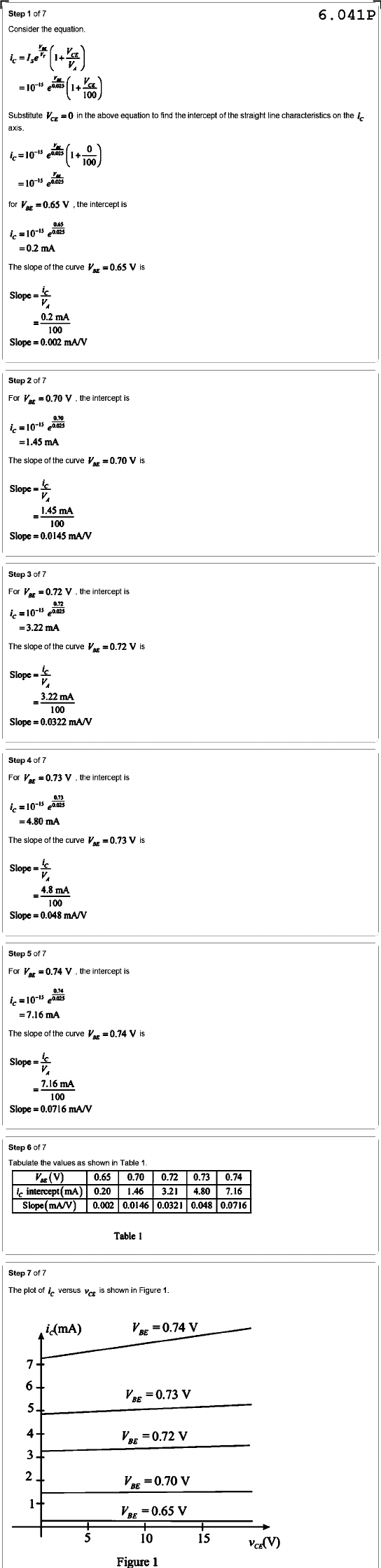 Step of 7 6.041P Consider the equation. = 100 Substitute =0 in the above equation to find the intercept of the straight line characteristics on the ic axis. 100 = 10 for = 0.65 V the intercept is 0.65 = 0.2 mA The slope of the curve = 0.65 V is Slope = ic = 0.2 mA 100 Slope 0.002 mA/V Step of 7 For = 0.70 V the intercept is ic 10⁻¹⁵ 0.70 = 1.45 mA The slope of the curve = 0.70 V is Slope = ic 1.45 mA = 100 Slope 0.0145 mA/V Step 3 of 7 For 0.72 V the intercept is ic 0.72 3.22 mA The slope of the curve = 0.72 V is Slope = ic 3.22 mA = 100 Slope 0.0322 mA/V Step of 7 For V the intercept is 0.73 ic 4.80 mA The slope of the curve =0.73 V is Slope = ic 4.8 mA = 100 Slope 0.048 mA/V Step of 7 For =0.74 V V the intercept is 0.74 ic 10⁻¹⁵ = 7.16 mA The slope of the curve = 0.74 V is Slope 7.16 mA = 100 Slope 0.0716 mA/V Step of 7 Tabulate the values as shown in Table 1 0.65 0.70 0.72 0.73 0.74 intercept (mA) 0.20 1.46 3.21 4.80 7.16 Slope (mA/V) 0.002 0.0146 0.0321 0.048 0.0716 Table Step of 7 The plot of ic versus is shown in Figure 1. 0.74 V 7 6 0.73 V 5 4 =0.72 V 3 2 0.70 V 1 0.65 V 5 10 15 Figure 1