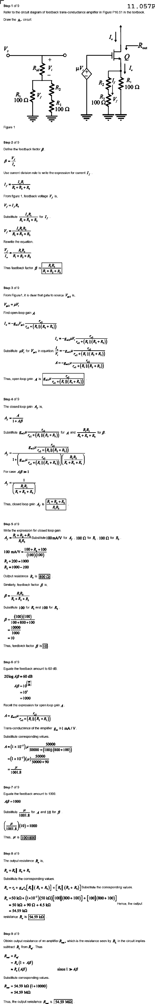 Step 1 of 9 11.057P Refer circuit diagram feedback trans conductance amplifier in Figure .51 textbook Draw circuit R out + R 100 Ω V, 100 Ω 100 Ω . . . Figure 1 Step Define the feedback Use current division rule to write the expression for current From figure feedback voltage is, Substitute for Rewrite R,R, R,R, Thus feedback factor Step 3 of 9 From Figure1 clear that gate source Substitute for V, Thus, open Step A 1+AB R,R, Substitute for and for B 1+ For case R,R, Thus, R,R, Step Write expression for closed loop gain R,R, Substitute 100mA/V for A, for for R, 100 mA/V +100 (100)(100) R2 200=1000 Output resistance feedback factor is R,R, Substitute 100 and 100 for R, (100)(100) 100+800+100 10000 1000 Thus, feedback Step Equate feedback amount dB 20log dB =1000 Recall the expression for Trans amplifier 8. is mA Substitute corresponding values 50000 10" 50000 50000 90 1001.8 Step Equate feedback amount to 1000 Substitute 1001.8 B (10)=1000 1001.8 Thus, 1001800 Step The resistance is Substitute the corresponding values Hence output resistance Step Obtain output resistance amplifier which the resistance seer by in the circui implies subtract Thus since Substitute values. 10000) Thus the output resistance