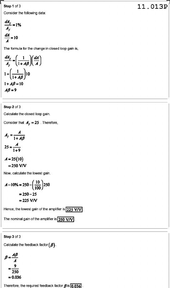 Step 1 of 3 11.013P Consider the following data: 1% The formula for the change in closed loop gain is, 1 = 1 10 = 9 Step 2 of 3 Calculate the closed loop gain. Consider that = Therefore, A=25(10) = 250 V/V Now, calculate the lowest gain. 10% = 25 = 225 V/V Hence, the lowest gain of the amplifier is 225 V/V The nominal gain of the amplifier is 250 V/V Step 3 of 3 Calculate the feedback factor (B). 9 = 250 =0.036 Therefore, the required feedback factor is 0.036