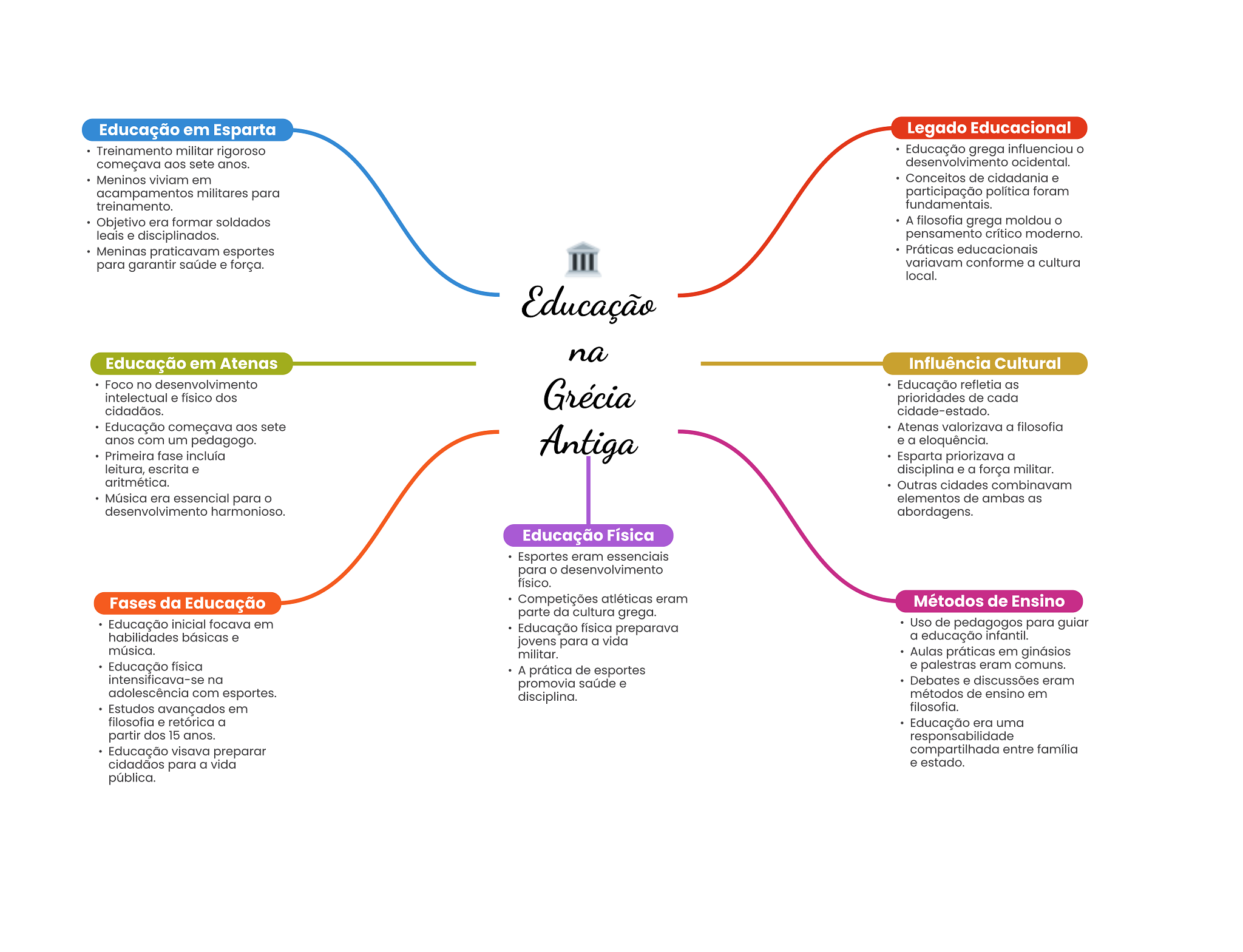 Educação em Esparta Legado Educacional Treinamento militar rigoroso Educação grega influenciou começava aos sete anos. desenvolvimento ocidental. Meninos viviam em Conceitos de cidadania e acampamentos militares para participação política foram treinamento. fundamentais. Objetivo era formar soldados A filosofia grega moldou leais e disciplinados. pensamento crítico moderno. Meninas praticavam esportes Práticas educacionais para garantir saúde e força. variavam conforme a cultura local. Educação na Educação em Atenas Influência Cultural Foco no desenvolvimento Grécia Educação refletia as intelectual e físico dos prioridades de cada cidadãos. cidade-estado. Educação começava aos sete Atenas valorizava a filosofia anos com um pedagogo. Primeira fase incluía Antiga e a eloquência. Esparta priorizava a leitura, escrita e disciplina e a força militar. aritmética. Outras cidades combinavam Música era essencial para elementos de ambas as desenvolvimento harmonioso. abordagens. Educação Física Esportes eram essenciais para desenvolvimento físico. Fases da Educação Competições atléticas eram Métodos de Ensino parte da cultura grega. Educação inicial focava em Educação física preparava Uso de pedagogos para guiar habilidades básicas e jovens para a vida a educação infantil. música. militar. Aulas práticas em ginásios Educação física A prática de esportes e palestras eram comuns. intensificava-se na promovia saúde e Debates e discussões eram adolescência com esportes. disciplina. métodos de ensino em Estudos avançados em filosofia. filosofia e retórica a Educação era uma partir dos 15 anos. responsabilidade Educação visava preparar compartilhada entre família cidadãos para a vida e estado. pública.