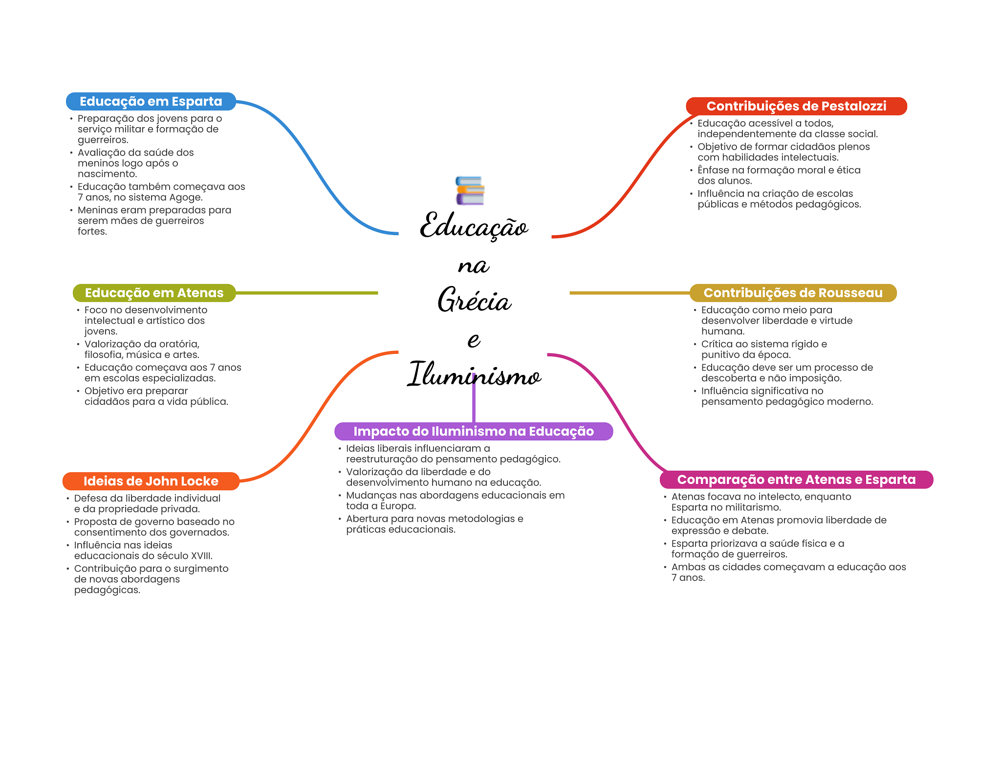 Educação em Esparta Contribuições de Pestalozzi Preparação dos jovens para Educação acessível a todos, serviço militar e formação de independentemente da classe social. guerreiros. Objetivo de formar cidadãos plenos Avaliação da saúde dos com habilidades intelectuais. meninos logo após nascimento. Ênfase na formação moral e ética dos alunos. Educação também começava aos 7 anos, no sistema Agoge. Influência na criação de escolas Meninas eram preparadas para públicas e métodos pedagógicos. serem mães de guerreiros fortes. Educação na Educação em Atenas Grécia Contribuições de Rousseau Foco no desenvolvimento Educação como meio para intelectual e artístico dos desenvolver liberdade e virtude jovens. humana. Valorização da oratória, e Crítica ao sistema rígido e filosofia, música e artes. punitivo da época. Educação começava aos 7 anos Iluminismo Educação deve ser um processo de em escolas especializadas. descoberta e não imposição. Objetivo era preparar Influência significativa no cidadãos para a vida pública. pensamento pedagógico moderno. Impacto do na Educação Ideias liberais influenciaram a reestruturação do pensamento pedagógico. Valorização da liberdade e do Ideias de John Locke desenvolvimento humano na educação. Comparação entre Atenas e Esparta Defesa da liberdade individual Mudanças nas abordagens educacionais em Atenas focava no intelecto, enquanto e da propriedade privada. toda a Europa. Esparta no militarismo. Proposta de governo baseado no Abertura para novas metodologias e Educação em Atenas promovia liberdade de consentimento dos governados. práticas educacionais. expressão e debate. Influência nas ideias Esparta priorizava a saúde física e a educacionais do século XVIII. formação de guerreiros. Contribuição para O surgimento Ambas as cidades começavam a educação aos de novas abordagens 7 anos. pedagógicas.