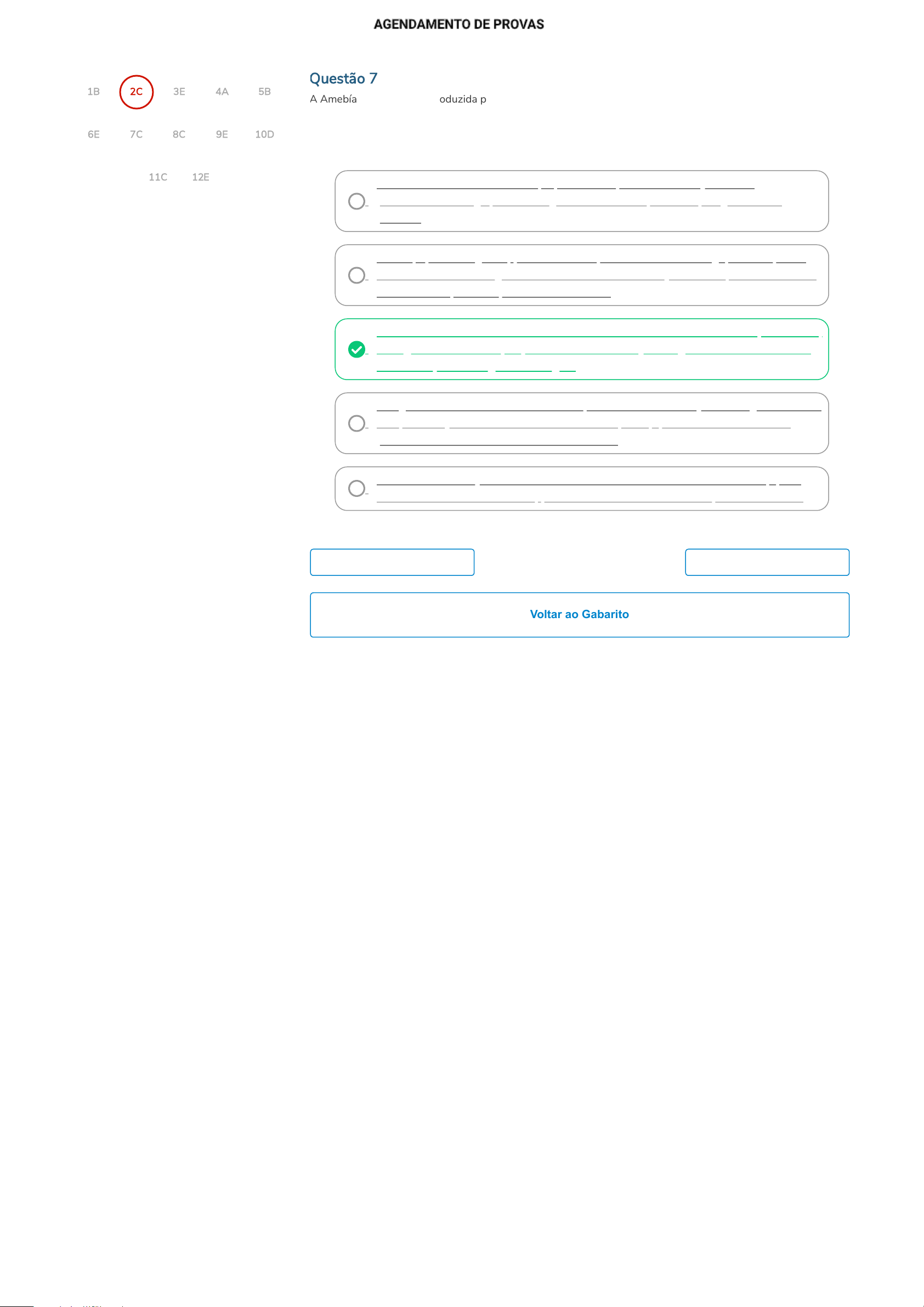1B 2C 3E 4A 5B 6E 7C 8C 9E 10D 11C 12E Voltar ao Gabarito Questão 7 A Amebíase é a infecção produzida por Entamoeba histolytica. Sua importância decorre de ter uma distribuição geográfica de amplitude mundial, elevada incidência, e acompanhar-se, em certa proporção dos casos, de quadros patológicos graves, eventualmente fatais. Acerca da Amebíase, assinale a alternativa incorreta. A. Na maioria dos casos humanos, o parasitismo por essa E.histolytica na~o produz sintomatologia, sendo em geral devida a estirpes na~o-patoge^nicas do parasito. B. O cisto, após ser ingerido, passa incólume pela acidez do estômago, e muda para a forma trofozoíta ao chegar nos intestinos. Quando alcançam o cólon, os trofozoítas se aderem a sua parede e passam a colonizá-la. C. Como os cistos e trofozoítos não são eliminados de forma constante pelas fezes, o diagnóstico da infecção por Entamoeba histolytica é geralmente feito através do exame parasitológico do sangue. D. O órgão extra-intestinal mais acometido pela Entamoeba histolytica é o fígado. A forma de apresentação mais comum é o abscesso hepático, que ocorre em até 5% dos pacientes com amebíase intestinal sintomática. E. A Entamoeba histolytica eliminada nas fezes encontra-se na forma de cistos, que é muito resistente a meios hostis, podendo sobreviver no ambiente por vários meses. Anterior Próxima