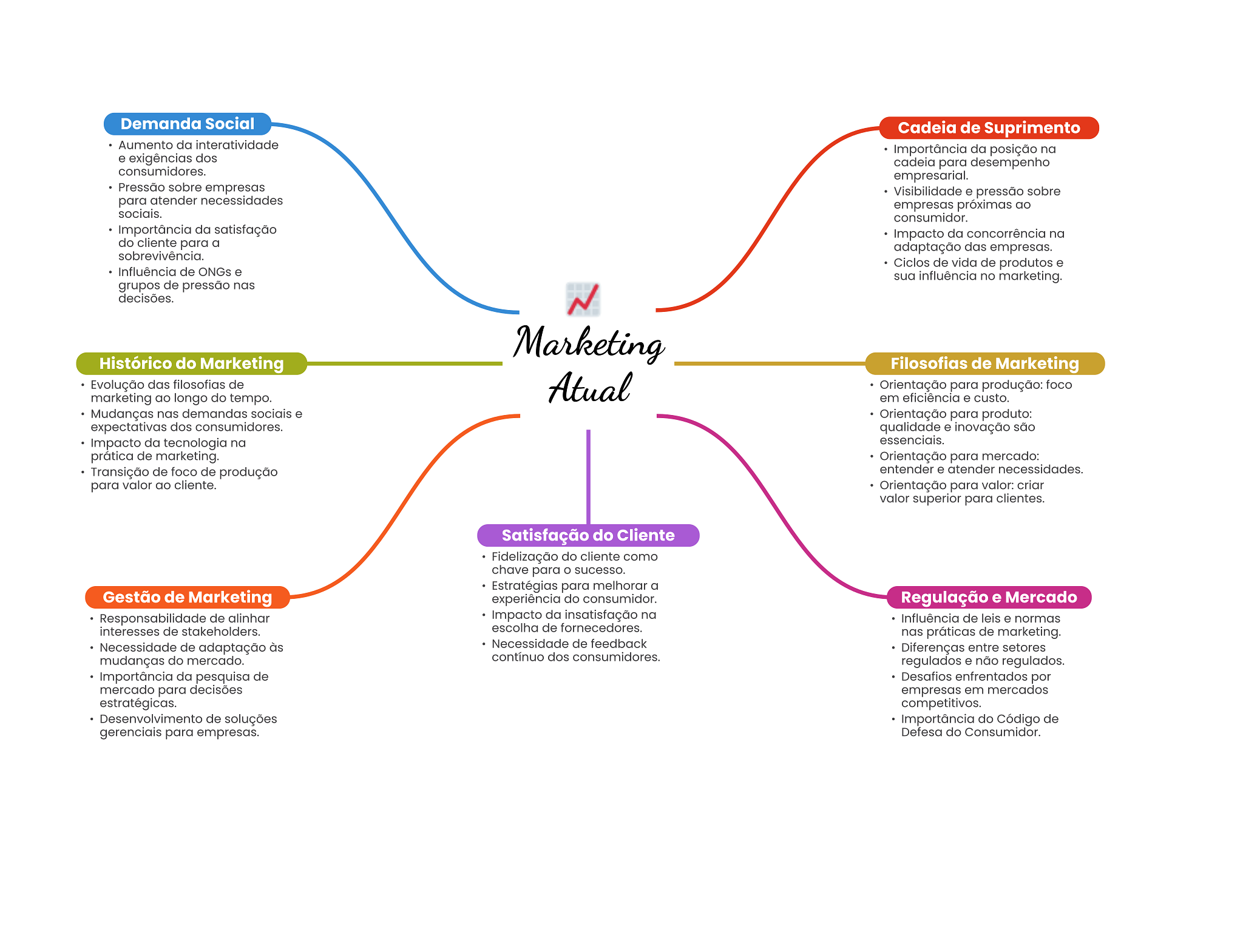 Demanda Social Cadeia de Suprimento Aumento da interatividade Importância da posição na e exigências dos cadeia para desempenho consumidores. empresarial. Pressão sobre empresas Visibilidade e pressão sobre para atender necessidades empresas próximas ao sociais. consumidor. Importância da satisfação Impacto da concorrência na do cliente para a adaptação das empresas. sobrevivência. Ciclos de vida de produtos e Influência de ONGs e sua influência no marketing. grupos de pressão nas decisões. Marketing Histórico do Marketing Filosofias de Marketing Evolução das filosofias de Atual Orientação para produção: foco marketing ao longo do tempo. em eficiência e custo. Mudanças nas demandas sociais e Orientação para produto: expectativas dos consumidores. qualidade e inovação são Impacto da tecnologia na essenciais. prática de marketing. Orientação para mercado: Transição de foco de produção entender e atender necessidades. para valor ao cliente. Orientação para valor: criar valor superior para clientes. Satisfação do Cliente Fidelização do cliente como chave para O sucesso. Estratégias para melhorar a Gestão de Marketing experiência do consumidor. Regulação e Mercado Responsabilidade de alinhar Impacto da insatisfação na Influência de leis e normas interesses de stakeholders. escolha de fornecedores. nas práticas de marketing. Necessidade de adaptação às Necessidade de feedback Diferenças entre setores mudanças do mercado. contínuo dos consumidores. regulados e não regulados. Importância da pesquisa de Desafios enfrentados por mercado para decisões empresas em mercados estratégicas. competitivos. Desenvolvimento de soluções Importância do Código de gerenciais para empresas. Defesa do Consumidor.