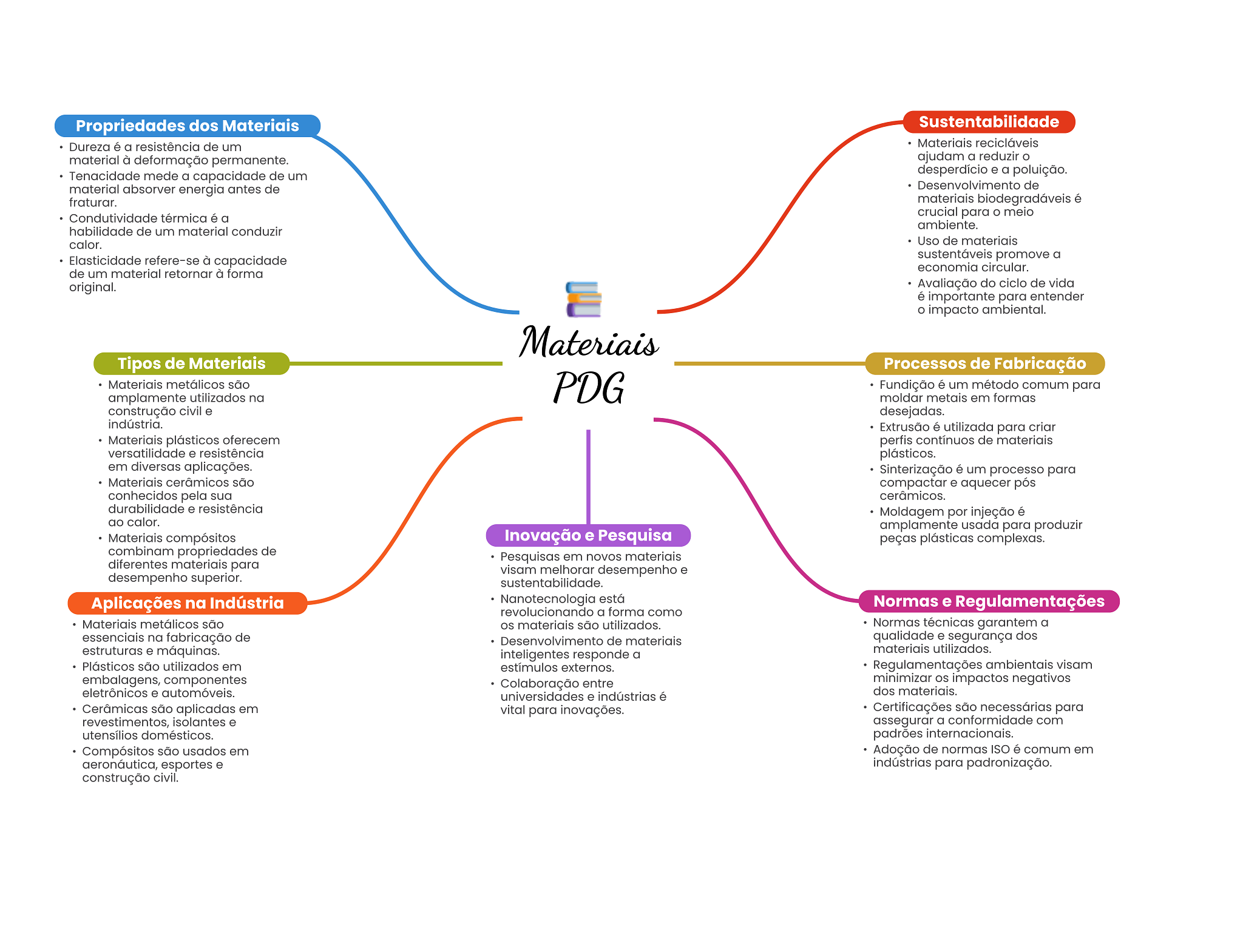 Propriedades dos Materiais Sustentabilidade Dureza é a resistência de um Materiais recicláveis material à deformação permanente. ajudam a reduzir Tenacidade mede a capacidade de um desperdício e a poluição. material absorver energia antes de Desenvolvimento de fraturar. materiais biodegradáveis é Condutividade térmica é a crucial para meio ambiente. habilidade de um material conduzir calor. Uso de materiais Elasticidade refere-se à capacidade sustentáveis promove a economia circular. de um material retornar à forma original. Avaliação do ciclo de vida é importante para entender impacto ambiental. Materiais Tipos de Materiais Processos de Fabricação Materiais metálicos são amplamente utilizados na PDG Fundição é um método comum para moldar metais em formas construção civil e desejadas. indústria. Extrusão é utilizada para criar Materiais plásticos oferecem perfis contínuos de materiais versatilidade e resistência plásticos. em diversas aplicações. Sinterização é um processo para Materiais cerâmicos são compactar e aquecer pós conhecidos pela sua cerâmicos. durabilidade e resistência Moldagem por injeção é ao calor. amplamente usada para produzir Materiais compósitos Inovação e Pesquisa peças plásticas complexas. combinam propriedades de Pesquisas em novos materiais diferentes materiais para visam melhorar desempenho e desempenho superior. sustentabilidade. Aplicações na Indústria Nanotecnologia está Normas e Regulamentações revolucionando a forma como Materiais metálicos são OS materiais são utilizados. Normas técnicas garantem a essenciais na fabricação de Desenvolvimento de materiais qualidade e segurança dos estruturas e máquinas. materiais utilizados. inteligentes responde a Plásticos são utilizados em estímulos externos. Regulamentações ambientais visam embalagens, componentes Colaboração entre minimizar impactos negativos eletrônicos e automóveis. universidades e indústrias é dos materiais. Cerâmicas são aplicadas em vital para inovações. Certificações são necessárias para revestimentos, isolantes e assegurar a conformidade com utensílios domésticos. padrões internacionais. Compósitos são usados em Adoção de normas ISO é comum em aeronáutica, esportes e indústrias para padronização. construção civil.