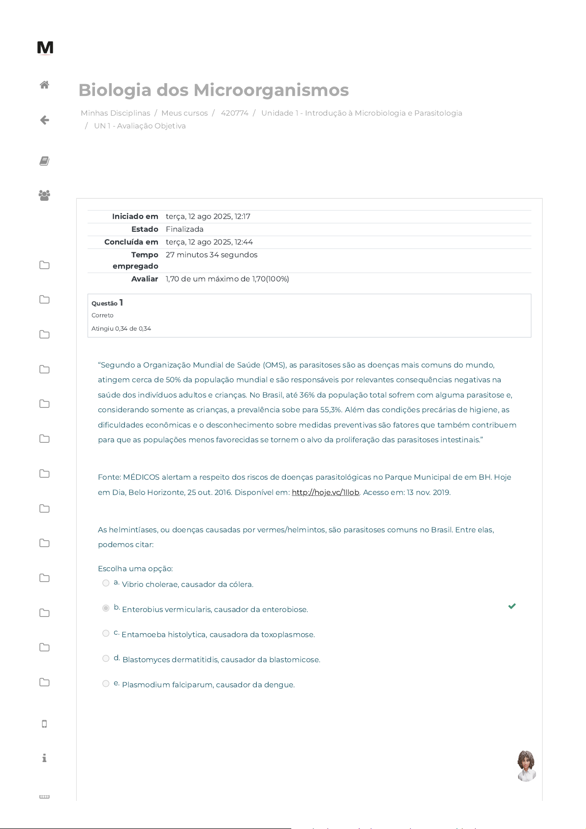 Minhas Disciplinas / Meus cursos / 420774 / Unidade 1 - Introdução à Microbiologia e Parasitologia / UN 1 - Avaliação Objetiva Biologia dos Microorganismos Iniciado em terça, 12 ago 2025, 12:17 Estado Finalizada Concluída em terça, 12 ago 2025, 12:44 Tempo empregado 27 minutos 34 segundos Avaliar 1,70 de um máximo de 1,70(100%) Questão 1 Correto Atingiu 0,34 de 0,34 “Segundo a Organização Mundial de Saúde (OMS), as parasitoses são as doenças mais comuns do mundo, atingem cerca de 50% da população mundial e são responsáveis por relevantes consequências negativas na saúde dos indivíduos adultos e crianças. No Brasil, até 36% da população total sofrem com alguma parasitose e, considerando somente as crianças, a prevalência sobe para 55,3%. Além das condições precárias de higiene, as dificuldades econômicas e o desconhecimento sobre medidas preventivas são fatores que também contribuem para que as populações menos favorecidas se tornem o alvo da proliferação das parasitoses intestinais.” Fonte: MÉDICOS alertam a respeito dos riscos de doenças parasitológicas no Parque Municipal de em BH. Hoje em Dia, Belo Horizonte, 25 out. 2016. Disponível em: http://hoje.vc/1llob. Acesso em: 13 nov. 2019. As helmintíases, ou doenças causadas por vermes/helmintos, são parasitoses comuns no Brasil. Entre elas, podemos citar: Escolha uma opção: a. Vibrio cholerae, causador da cólera. b. Enterobius vermicularis, causador da enterobiose. c. Entamoeba histolytica, causadora da toxoplasmose. d. Blastomyces dermatitidis, causador da blastomicose. e. Plasmodium falciparum, causador da dengue. https://avap.multivix.edu.br/my/ https://avap.multivix.edu.br/course/view.php?id=36084 https://avap.multivix.edu.br/course/view.php?id=36084§ion=2 https://avap.multivix.edu.br/mod/quiz/view.php?id=1956906 http://hoje.vc/1llob https://avap.multivix.edu.br/my/ https://avap.multivix.edu.br/course/view.php?id=36084 https://avap.multivix.edu.br/user/index.php?id=36084 https://avap.multivix.edu.br/course/view.php?id=36084§ion=1 https://avap.multivix.edu.br/course/view.php?id=36084§ion=2 https://avap.multivix.edu.br/course/view.php?id=36084§ion=3 https://avap.multivix.edu.br/course/view.php?id=36084§ion=4 https://avap.multivix.edu.br/course/view.php?id=36084§ion=5 https://avap.multivix.edu.br/course/view.php?id=36084§ion=6 https://avap.multivix.edu.br/course/view.php?id=36084§ion=7 https://avap.multivix.edu.br/course/view.php?id=36084§ion=8 https://avap.multivix.edu.br/course/view.php?id=36084§ion=9 https://avap.multivix.edu.br/course/view.php?id=36084§ion=10 https://avap.multivix.edu.br/course/view.php?id=36084§ion=11 https://avap.multivix.edu.br/course/view.php?id=36084§ion=12 https://avap.multivix.edu.br/course/view.php?id=36084§ion=13 https://avap.multivix.edu.br/hooks/portal/ https://avap.multivix.edu.br/mod/page/view.php?id=1252%2F%22%20target%3D%22_blank https://avap.multivix.edu.br/calendar/view.php/ https://avap.multivix.edu.br/ https://avap.multivix.edu.br/ https://avap.multivix.edu.br/ https://avap.multivix.edu.br/ https://avap.multivix.edu.br/ Questão 2 Correto Atingiu 0,34 de 0,34 Questão 3 Correto Atingiu 0,34 de 0,34 A descoberta dos microrganismos se deu no fim do século XVII, com as primeiras observações de Leeuwenhoek, o criador do primeiro microscópio. Ele observava amostras de fluidos e conseguia visualizar e descrever diferentes formas de vida. Outro importante cientista, Pasteur, conseguiu pela primeira vez atribuir vida e função biológica a esses organismos. Porém, somente no século XIX um pesquisador provou a associação entre microrganismos e doenças. Estamos falando de: Escolha uma opção: a. Darwin, e a sua teoria da evolução. b. Koch, com sua teoria microbiana da doença. c. Tyndall, com suas teorias de desinfecção. d. Fleming, por meio da teoria biogênica dos protozoários. e. Bary, com experimentos realizados com plantas e fungos. “Em 2017, o número de casos de malária subiu 50% no país, chegando a 194 mil ocorrências. O crescimento ocorreu depois de seis anos de queda – em 2016, o Brasil registrou o menor número de casos em 37 anos, o que foi visto como um grande sucesso no combate à doença. A malária é uma doença febril, transmitida pela picada de um mosquito infectado pelo Plasmodium, um parasita. No Brasil, a principal forma da doença é a vivax, mais branda, que oferece pouco risco de morte, ao contrário da forma mais comum nos países africanos. Por aqui, 99% dos casos são registrados na Amazônia.” Fonte: ROSSI, A. Por que os casos de malária cresceram 50% no Brasil após 6 anos de queda. BBC Brasil, São Paulo, 4 maio 2018. Disponível em: https://www.bbc.com/portuguese/brasil-43998843. Acesso em: 13 nov. 2019. O Plasmodium spp., protozoário intracelular, é o agente etiológico da malária. A respeito dos protozoários patogênicos, é correto afirmar que: Escolha uma opção: a. são unicelulares, procariontes e podem formar colônias. b. são compostos por RNA ou DNA e recobertos por uma cápsula de proteína. c. são unicelulares e se locomovem por cílios, flagelos e pseudópodes. d. são multicelulares, com sistema digestivo incompleto e ventosas. e. são dioicos (sexos separados) e possuem sistema digestório completo. https://www.bbc.com/portuguese/brasil-43998843 https://avap.multivix.edu.br/my/ https://avap.multivix.edu.br/course/view.php?id=36084 https://avap.multivix.edu.br/user/index.php?id=36084 https://avap.multivix.edu.br/course/view.php?id=36084§ion=1 https://avap.multivix.edu.br/course/view.php?id=36084§ion=2 https://avap.multivix.edu.br/course/view.php?id=36084§ion=3 https://avap.multivix.edu.br/course/view.php?id=36084§ion=4 https://avap.multivix.edu.br/course/view.php?id=36084§ion=5 https://avap.multivix.edu.br/course/view.php?id=36084§ion=6 https://avap.multivix.edu.br/course/view.php?id=36084§ion=7 https://avap.multivix.edu.br/course/view.php?id=36084§ion=8 htt
