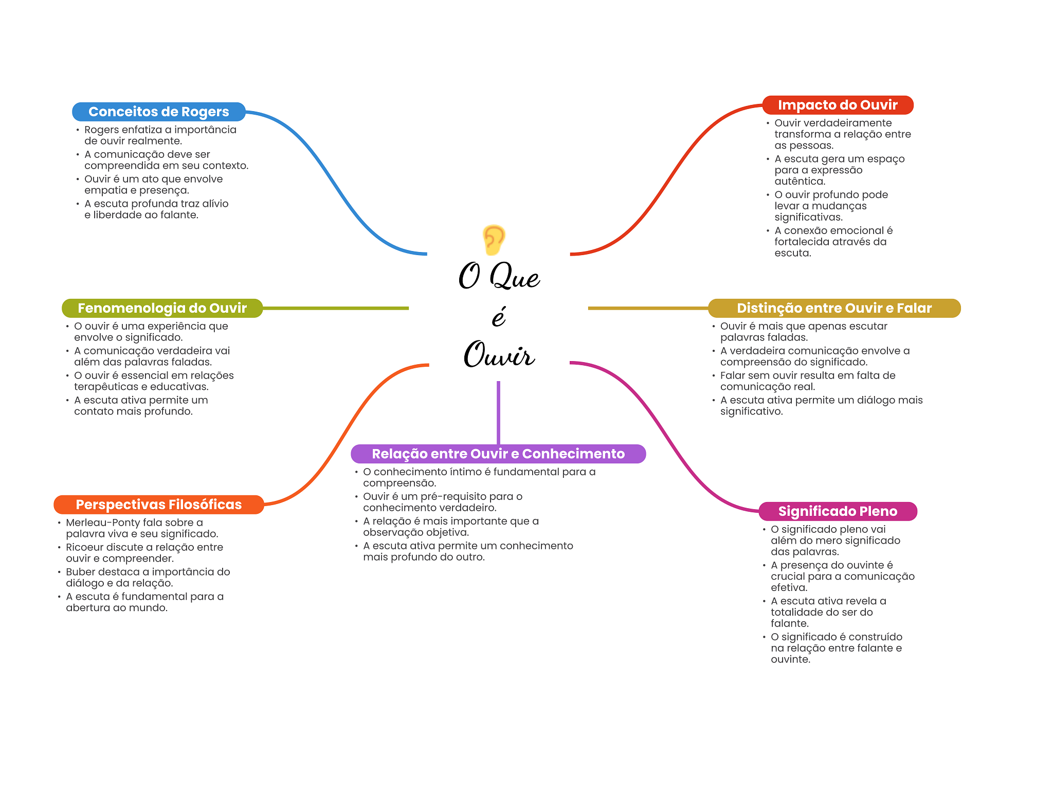 Conceitos de Rogers Impacto do Ouvir Ouvir verdadeiramente Rogers enfatiza a importância transforma a relação entre de ouvir realmente. as pessoas. A comunicação deve ser A escuta gera um espaço compreendida em seu contexto. para a expressão Ouvir é um ato que envolve autêntica. empatia e presença. ouvir profundo pode A escuta profunda traz alívio levar a mudanças e liberdade ao falante. significativas. ? A conexão emocional é fortalecida através da escuta. Que Fenomenologia do Ouvir é Distinção entre Ouvir e Falar ouvir é uma experiência que Ouvir é mais que apenas escutar envolve O significado. palavras faladas. A comunicação verdadeira vai além das palavras faladas. Ouvir A verdadeira comunicação envolve a compreensão do significado. ouvir é essencial em relações Falar sem ouvir resulta em falta de terapêuticas e educativas. comunicação real. A escuta ativa permite um A escuta ativa permite um diálogo mais contato mais profundo. significativo. Relação entre Ouvir e Conhecimento conhecimento íntimo é fundamental para a compreensão. Ouvir é um pré-requisito para Perspectivas Filosóficas conhecimento verdadeiro. Significado Pleno Merleau-Ponty fala sobre a A relação é mais importante que a palavra viva e seu significado. observação objetiva. significado pleno vai Ricoeur discute a relação entre A escuta ativa permite um conhecimento além do mero significado mais profundo do outro. das palavras. ouvir e compreender. A presença do ouvinte é Buber destaca a importância do crucial para a comunicação diálogo e da relação. efetiva. A escuta é fundamental para a A escuta ativa revela a abertura ao mundo. totalidade do ser do falante. significado é construído na relação entre falante e ouvinte.