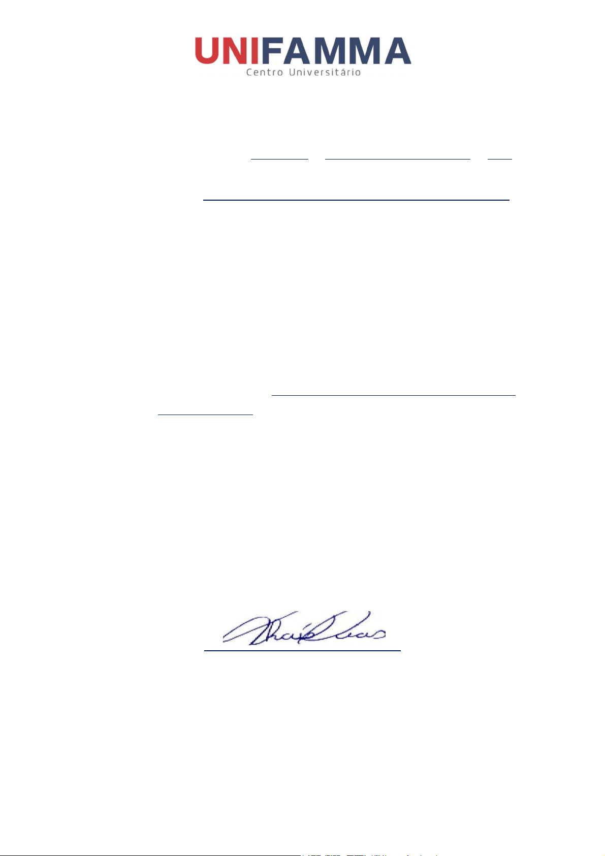 CARTA DE APRESENTAÇÃO DO(A) ESTAGIÁRIO(A) Maringá, de de . Senhor (a) Diretor(a) . O Curso de Licenciatura em Pedagogia do Centro Universitário Metropolitano de Maringá–UNIFAMMA, na modalidade EAD, tem oferecido ao futuro licenciado do Curso de Pedagogia a disciplina de Estágio Supervisionado em Pedagogia com o objetivo de contribuir para a formação de professores, tendo como ponto de inserção profissional da docência o momento do estágio para vivenciar a dinâmica do processo pedagógico na perspectiva teórica e prática. Este Termo de Compromisso de estágio está fundamentado na Lei Federal Nº 11.788, de 25 de setembro de 2008. Apresentamos o (a) acadêmico (a) , R.A/Matrícula , do 9º Módulo, do Curso de Pedagogia, da UNIFAMMA de Maringá, e solicitamos a colaboração de Vª.Sª. no sentido de recebê- lo(a), a fim de realizar o Estágio Supervisionado em Educação Infantil - Fase I e II. Compreendemos que o contato direto de nossos(as) acadêmicos(as) com professores(as), alunos(as) e outros(as) profissionais envolvidos(as) no processo ensino e aprendizagem possibilita a percepção de diferentes aspectos da realidade escolar e permite, também, a reflexão sobre como se deve dar o envolvimento prático no planejamento de ações e intervenções a partir de uma experiência concreta. Certo de sua valiosa colaboração, aproveitamos a oportunidade para manifestar nossos agradecimentos. Coordenadora do Curso de Pedagogia Centro Universitário Metropolitano de Maringá UNIFAMMA - CENTRO UNIVERSITÁRIO METROPOLITANO DE MARINGÁ Avenida Virgílio Manília, nº 22260, Jardim Ouro Cola, Maringá, Paraná. 44 2101-5550 | www.unifamma.edu.br