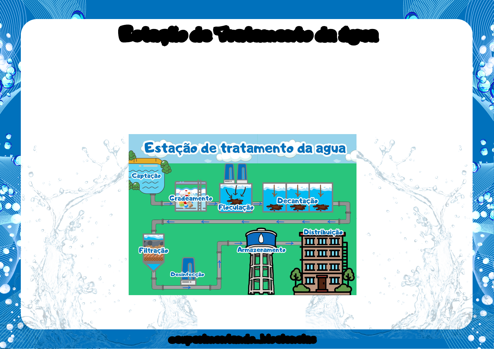 Estação de Tratamento da águaEstação de Tratamento da água @experimentando_biociencias@experimentando_biociencias Para esta atividade prática o professor deverá solicitar antecipadamente que alunos façam uma pesquisa sobre o assunto ou já tenha visto o assunto de forma teórica com eles . No dia da aplicação os alunos deverão levar lápis de cor ou giz de cera (caso opte pela versão preto e branco), tesoura sem ponta caneta permanente e cola. Professor, a atividade pode ser realizada de forma individual ou em equipes de no máximo 3 alunos, oriente que os alunos iniciem colorindo, depois recortando, colocando os recortes . Espero que goste da atividade e ficarei muito agradecida se postar no Instagram e marcar @experimentando_biociencias Professor, você poderá utilizar este material com seus alunos neste e nos próximos anos, porém não é permitido compartilhar com outros professores pessoalmente ou através de grupos de redes sociais e não poderá ser comercializado A violação é dos direitos autorais é CRIME, previsto no artigo 184 do Código Penal 3 Este material foi produzido por @experimentando-biociencias Estação de tratamento da águaEstação de tratamento da água ColarColar ColarColar ColarColar ColarColar ColarColarColarColar @experimentando_biociencias Material de recorteMaterial de recorte Carvão CascalhoCascalho PedregulhoPedregulho AreiaAreia FiltraçãoFiltração DesinfecçãoDesinfecção ArmazenamentoArmazenamento DistribuiçãoDistribuição GradeamentoGradeamento FloculaçãoFloculação CaptaçãoCaptação DecantaçãoDecantação @experimentando_biociencias ColarColar ColarColar ColarColar ColarColar ColarColarColarColarColarColar ColarColar ColarColar ColarColar Estação de tratamento da águaEstação de tratamento da água @experimentando_biociencias Material de recorteMaterial de recorte Carvão CascalhoCascalho PedregulhoPedregulho AreiaAreia FiltraçãoFiltração DesinfecçãoDesinfecção ArmazenamentoArmazenamento DistribuiçãoDistribuição GradeamentoGradeamento FloculaçãoFloculação CaptaçãoCaptação DecantaçãoDecantação @experimentando_biociencias