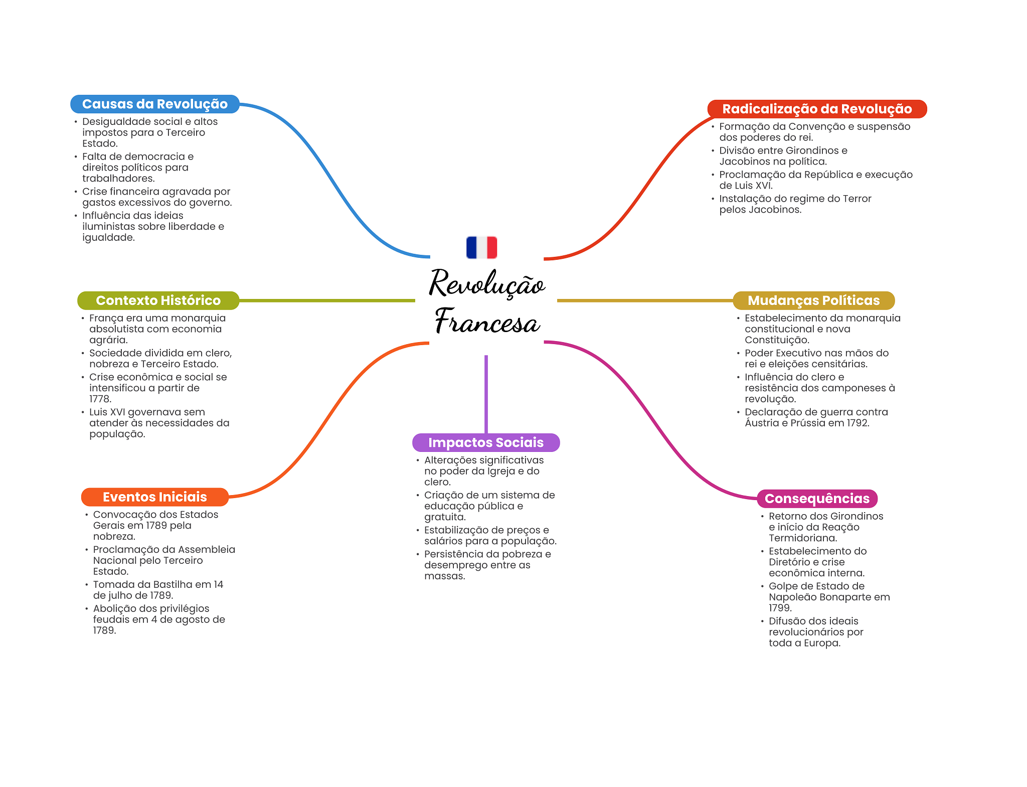Causas da Revolução Radicalização da Revolução Desigualdade social e altos Formação da Convenção e suspensão impostos para Terceiro Estado. dos poderes do rei. Divisão entre Girondinos e Falta de democracia e Jacobinos na política. direitos políticos para trabalhadores. Proclamação da República e execução de Luis XVI. Crise financeira agravada por gastos excessivos do governo. Instalação do regime do Terror Influência das ideias pelos Jacobinos. iluministas sobre liberdade e igualdade. Revolução Contexto Histórico Mudanças Políticas França era uma monarquia Francesa Estabelecimento da monarquia absolutista com economia constitucional e nova agrária. Constituição. Sociedade dividida em clero, Poder Executivo nas mãos do nobreza e Terceiro Estado. rei e eleições censitárias. Crise econômica e social se Influência do clero e intensificou a partir de resistência dos camponeses à 1778. revolução. Luis XVI governava sem Declaração de guerra contra atender às necessidades da Áustria e Prússia em 1792. população. Impactos Sociais Alterações significativas no poder da Igreja e do clero. Eventos Iniciais Criação de um sistema de Consequências educação pública e Convocação dos Estados gratuita. Retorno dos Girondinos Gerais em 1789 pela Estabilização de preços e e início da Reação nobreza. salários para a população. Termidoriana. Proclamação da Assembleia Persistência da pobreza e Estabelecimento do Nacional pelo Terceiro desemprego entre as Diretório e crise Estado. massas. econômica interna. Tomada da Bastilha em 14 Golpe de Estado de de julho de 1789. Napoleão Bonaparte em Abolição dos privilégios 1799. feudais em 4 de agosto de Difusão dos ideais 1789. revolucionários por toda a Europa.