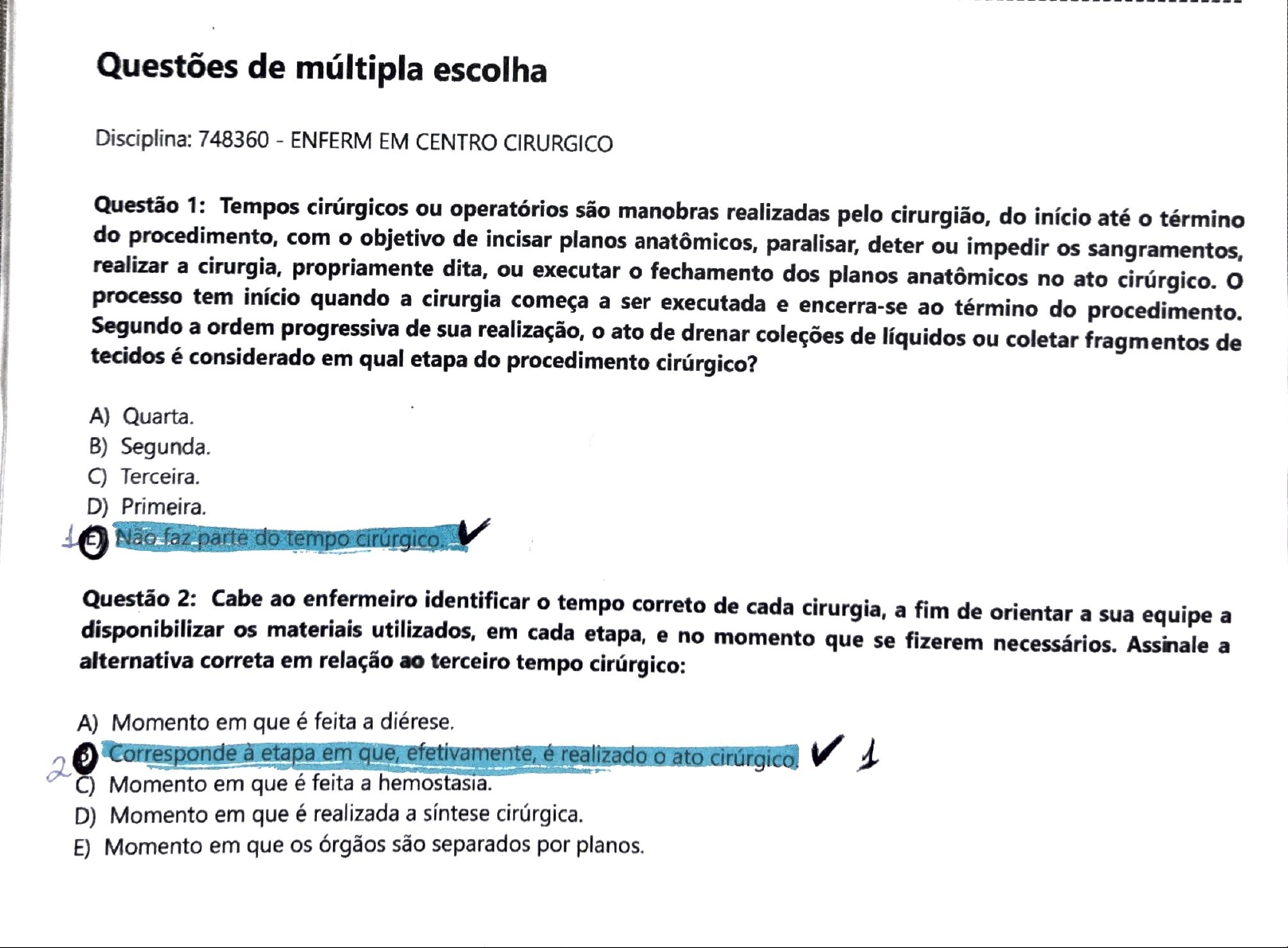 Questões de múltipla escolha Disciplina: 748360 ENFERM EM CENTRO CIRURGICO Questão 1: Tempos cirúrgicos ou operatórios são manobras realizadas pelo cirurgião, do início até o término do procedimento, com objetivo de incisar planos anatômicos, paralisar, deter ou impedir os sangramentos, realizar a cirurgia, propriamente dita, ou executar o fechamento dos planos anatômicos no ato cirúrgico. processo tem início quando a cirurgia começa a ser executada e encerra-se ao término do procedimento. Segundo a ordem progressiva de sua realização, o ato de drenar coleções de líquidos ou coletar fragmentos de tecidos é considerado em qual etapa do procedimento cirúrgico? A) Quarta. B) Segunda. C) Terceira. D) Primeira. Não faz parte do tempo cirúrgico Questão 2: Cabe ao enfermeiro identificar tempo correto de cada cirurgia, a fim de orientar a sua equipe a disponibilizar os materiais utilizados, em cada etapa, e no momento que se fizerem necessários. Assinale a alternativa correta em relação ao terceiro tempo cirúrgico: A) Momento em que é feita a diérese. Corresponde à etapa em que, efetivamente, é realizado ato C) Momento em que é feita a hemostasia. D) Momento em que é realizada a síntese cirúrgica. E) Momento em que os órgãos são separados por planos.Questão 3: Fases cirúrgicas são as etapas de preparo do paciente que irá se submeter a um procedimento leia as cirúrgico. As fases cirúrgicas seguem uma ordem e compõem o período perioperatório. Neste contexto, assertivas a seguir e assinale a alternativa correta: pré-operatório termina quando paciente é recebido no centro cirúrgico. É, nesse momento, que são introduzidas as orientações do preparo cirúrgico, de acordo com cada tipo de cirurgia. Essa fase é dividida em pré- operatório mediato e pré-operatório imediato; II. Na fase de pré-operatório mediato, o paciente é orientado quanto aos exames e às avaliações clínicas, que devem ser feitos antes da internação para o procedimento cirúrgico; pré-operatório mediato é o período que antecede a internação, momento em que é aberto o documento em de que constarão todas as informações cirúrgicas do paciente, chamado de Sistematização da Assistência Enfermagem Perioperatória (Saep). I, II e III. B) e C) e III. D) III. E) Questão 4: histórico de enfermagem compreende uma avaliação de uma ampla variedade de fatores físicos e psicológicos, tendo por finalidade buscar conhecer e conseguir as informações. Desta maneira, uma série de problemas do paciente ou diagnósticos de enfermagem, podem ser previstos ou identificados com base nos dados coletados. Ao solicitar a uma paciente informações sobre a história de doenças e cirurgias em sua família, o enfermeiro obteve as seguintes respostas: a mãe retirou os ovários, as trompas de Falópio e o útero, pois estava com mioma e não sabe porque tirou os outros órgãos, e uma irmã fez plástica de nariz e nas pálpebras. Assinale a alternativa correta que corresponde, respectivamente, ao momento operatório dos procedimentos realizados pelos familiares da paciente: A) Emergência e eletiva. B) Urgência e emergência. Eletiva e eletiva Urgência e eletiva. E) Eletiva e emergência. Questão 5: A síntese cirúrgica (cuja etimologia remonta às ideias de junção e união) ou a sutura consiste em aproximar ou coaptar as bordas de uma lesão, com a finalidade de estabelecer a contiguidade do processo de cicatrização. Assinale a alternativa correta, em relação à síntese cirúrgica, quando é classificada como completa: A) Trata-se da aproximação ou da coaptação das bordas da incisão feita, imediatamente, após o término da cirurgia. B) Corresponde à aproximação das bordas feita algum tempo após a cirurgia. C) Aproximação dos tecidos em quase toda a extensão da incisão, mantendo-se nesse caso uma pequena abertura para a colocação do dreno. D) Aproximação ou união dos tecidos com auxílio de materiais que não fios cirúrgicos, como: gesso, cola cirúrgica, ataduras e adesivos cirúrgicos. Aproximação dos tecidos em toda a extensão da incisão cirúrgica, unindo toda a borda da lesão, de uma 3 extremidade outra. Questão 6: A infecção do sítio cirúrgico (ISC) é considerada um importante indicador de qualidade do centro cirúrgico e da estrutura hospitalar. Recomenda-se um sistema de vigilância epidemiológica realizado por médicos e enfermeiros, que analisarão as taxas, a partir de técnicas epidemiológicas. Em relação às infecções de sítio cirúrgico, assinale a alternativa correta: A) A infecção do sítio cirúrgico pode se desenvolver no intervalo de 40 dias a 18 meses (como no caso de uma implantação de prótese). B) ISC incisional superficial não apresenta uma presença de secreção purulenta da incisão, dor, hiperemia, edema,calor, tumefação localizada, organismos isolados em cultura. ISC incisional profunda existe a presença de drenagem de secreção purulenta, febre, dor, rubor, hiperemia, abscessos, deiscência, mas não tem a cultura positiva de fluido colhido da incisão. D) ISC de órgão/cavidade não apresenta uma cultura positiva dos fluidos, drenagem purulenta pelo dreno da cavidade, abscesso ou outra evidência de infecção, envolvendo um órgão ou uma cavidade. E) ISC incisional pode ser superficial, quando envolve a pele e tecido subcutâneo, ou profunda, quando compreende os planos profundos, como O músculo e a fáscia) Questão 7: o centro cirúrgico deve possuir uma área que seja isolada da circulação geral, e onde o trânsito de pessoas e materiais seja controlado, evitando-se, assim, a propagação de microrganismos (possíveis causadores de infecção). A unidade deve possuir, ainda, um acesso facilitado para as unidades emergenciais, como as UTIs e os prontos-socorros. Em relação as áreas obrigatórias que compõem o centro cirúrgico, assinale a alternativa incorreta: A) Vestiári