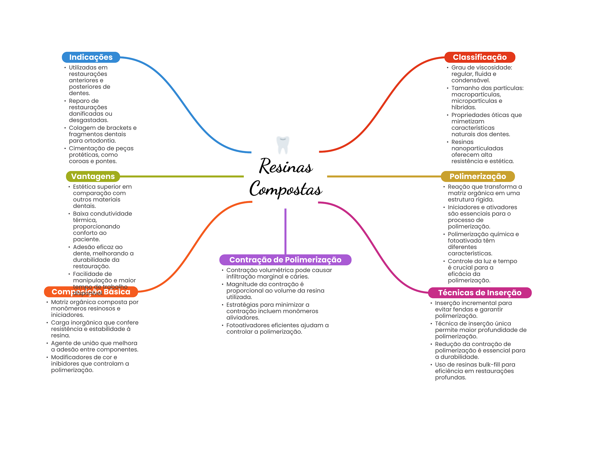 Indicações Classificação Utilizadas em Grau de viscosidade: restaurações regular, fluida e anteriores e condensável. posteriores de Tamanho das partículas: dentes. macropartículas, Reparo de micropartículas e restaurações híbridas. danificadas ou Propriedades óticas que desgastadas. mimetizam Colagem de brackets e características fragmentos dentais naturais dos dentes. para ortodontia. Resinas Cimentação de peças nanoparticuladas protéticas, como oferecem alta coroas e pontes. Resinas resistência e estética. Vantagens Polimerização Estética superior em Compostas Reação que transforma a comparação com matriz orgânica em uma outros materiais estrutura rígida. dentais. Iniciadores e ativadores Baixa condutividade são essenciais para O térmica, processo de proporcionando polimerização. conforto ao Polimerização química e paciente. fotoativada têm Adesão eficaz ao diferentes dente, melhorando a características. durabilidade da Contração de Polimerização Controle da luz e tempo restauração. Contração volumétrica pode causar é crucial para a Facilidade de eficácia da infiltração marginal e cáries. manipulação e maior polimerização. tempo de trabalho Magnitude da contração é Básica proporcional ao volume da resina utilizada. Técnicas de Inserção Matriz orgânica composta por Estratégias para minimizar a Inserção incremental para monômeros resinosos e contração incluem monômeros evitar fendas e garantir iniciadores. aliviadores. polimerização. Carga inorgânica que confere resistência e estabilidade à Fotoativadores eficientes ajudam a Técnica de inserção única resina. controlar a polimerização. permite maior profundidade de polimerização. Agente de união que melhora Redução da contração de a adesão entre componentes. polimerização é essencial para Modificadores de cor e a durabilidade. inibidores que controlam a Uso de resinas bulk-fill para polimerização. eficiência em restaurações profundas.