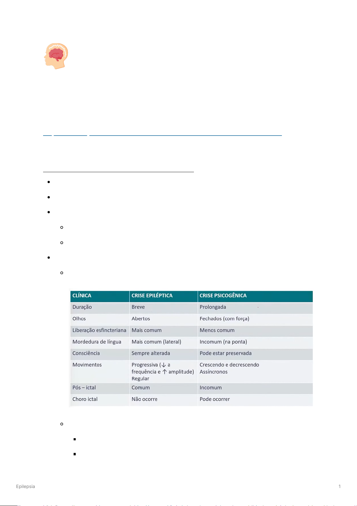Epilepsia 1 Epilepsia https://www.youtube.com/live/1afYoo55AW0?si=aXXoDuO7z3A5AOtO > DEFINIÇÃO DE CRISE EPILÉPTICA sinais e sintomas que decorrem do excesso de atividade neuronal origem pode ser: unilateral, bilateral ou multifocal sintomas dependem do local lobo occipital: alteração visual lobo temporal: alteração da linguagem diagnósticos diferenciais: origem psicogênica origem neurológica aura migranosa - aura visual AIT fraqueza de Todd https://www.youtube.com/live/1afYoo55AW0?si=aXXoDuO7z3A5AOtO Epilepsia 2 distúrbios do movimento - tremor origem não neurológica síncope EEG pode ser normal cardiogênica vaso-vagal/disautonômica “convulsiva :ˮ assimétrico > TIPOS DE CRISE Epilepsia 3 tônico-clônica bilateral = iniciou como focal e evoluiu para generalizada Preto = esquerdo | Azul = direito Epilepsia 4 “crise de ausência do adulto :ˮ crise focal disperceptiva > DESENCADEANTES trata a causa: NÃO precisa de anticonvulsivante > DEFINIÇÃO DE EPILEPSIA estado de propensão de recorrer crises epilépticas não-provocadas focal ou generalizadas CRITÉRIOS 2 crises com intervalo de 24h entre elas OU 1 crise com “FR :ˮ lesão estrutural cerebral Epilepsia 5 alteração do EEG crise que desperta o paciente (período noturno) > CAUSAS estrutural: AVC genéticas: alteração dos canais de Na infecciosa metabólica imune desconhecida > SÍNDROMES EPILÉPTICAS WEST encefalopatia: regressão dos marcos do desenvolvimento atraso cognitivo predomínio da crise: espasmos (ˮchoquinhoˮ) EEG hipsarritmia TTO corticoide, vigabatrina AUSÊNCIA recorrentes cognição preservada hiperventilação como gatilho EEG espícula-onda generalizada 3 Hz TTO ácido valproico ou etossuximida BENIGNA DA INFÂNCIA Epilepsia 6 ocorrem no período noturno envolve boca, face e braço idade dependente - “someˮ quando cresce TTO AV carbamazepina PIORA! LOBO TEMPORAL mais comum do adulto cognição normal FOCAL pode evoluir para TC TC/RM alteração estrutural do lobo temporal causa multifatorial: injúrias na infância TCE, meningite, trabalho de parto complicado TTO lamotrigina ou carbamazepina abordagem cirúrgica MIOCLÔNICA JUVENIL generalizada do adulto mioclônica = “choqueˮ ou CTCG TTO AV MULHER levetiracetam > TTO MEDICAMENTOSO Epilepsia 7 em idoso = lamotrigina carbamazepina faz hiponatremia > ESTADO DE MAL EPILÉPTICO CTC 5 min 2 crises sem recuperar consciência CONDUTA geral monitorização ABC HGT TC crânio labs BDZ diazepam 10 mg EV midazolam 15 mg IM pode repetir até 3x com um intervalo de 5 min escolher 1 e NÃO FICAR TROCANDO DE MEDICAÇÃO! Epilepsia 8 fenitoína 20 mg/kg EV BIC 50 mg/min fenobarbital 1520 mg/kg EV BIC 100 mg/min ESTADO DE MAL EPILÉPTICO REFRATÁRIO encefalite autoimune IOT UTI midazolam 0,2 mg/kg em bolus + manutenção 0,12 mg/kg/h sem resposta propofol 12 mg/kg EV em 5 min + manutenção 1012 mg/kg/h OU quetamina 2 mg/kg + manutenção 1,510 mg/kg/h sem resposta tiopental 5mg/kg EV em 10 min 15mg/kg/h ANOTAÇÕES DE AULA CRISES EPILÉPTICAS hiperexcitabilidade ou descarga anormal > manifestação clínica privação de sono, uso de drogas, menstruação = desencadeantes início e fim caracterizados > QC variável pode ter mais de 1 tipo de crise na mesma pessoa, e variar ao longo do tempo crises esteriotipadas: SEMPRE do mesmo jeito perceptiva: mantêm consciência (epigastralgia) > pode evoluir para disperceptiva: RNC duração de no MÁXIMO 5 min 5m: estado de mal epiléptico Epilepsia 9 FOCAL motora: repete movimento GENERALIZADA tônico-clônico bilateral = convulsão (começou focal > generalizou) principal causa: genética ausência: normalmente não tem pós-ictal típica da INFÂNCIA mioclonia: “tipo de choqueˮ fisiológica no sono > DIAGNÓSTICO clínico síncope pressão, glicemia = não tem pós-ictal PÓSICTAL “onde acordou?ˮ lobo frontal pode ser mais rápido lobo temporal: automatismos confusão, sonolência, agressiva EEG classificação das crises alterado ou artefato? 20 min lesão: descargas ˮmínimasˮ - área cerebral que Epilepsia 10 “descarregaˮ (atividade epileptiforme) inter-ictal neuroimagem RM padrão-ouro se 1º crise em PS TC descartar AVC, neoplasia > TTO inicia medicação NÃO precisa esperar exames MONOTERAPIA poli se refratária mínimo de 2 anos titulação variável FOCAL � Levetiracetam 500 mg 2x/dia (máx. 1g/dia) � Lacosamida � Lamotrigina Oxcarbamazepina e Carbamazepina GENERALIZADA Valproato Ác. Valproato CONTRAINDICAÇÃO EM GESTANTE TERATOGÊNICO idem ˮ3 Lˮ Topiramato = maior dose = efeito colateral cognitivo Clobazam BDZ (receita azul) - para associação gabaérgico: aumenta inibição; menos sedativo Etossuximida = ausência da infância Epilepsia 11 > ESTADO DE MAL EPILÉPTICO 5 minutos � DIAZEPAM 1 ampola IV repetido a� midazo IM menor tempo de ação � FENITOÍNA EM BIC a� bolus causa bloqueio da condução AV (bloqueador do canal de Na) b� OU levetiracetam c� OU lacosamida � [refratário] IOT VM UTI a� midazo BIC b� fenobarbital � anestésicos: propofol, quetamina, MANUTENÇÃO mantêm IV até recobrar consciência e passar para VO