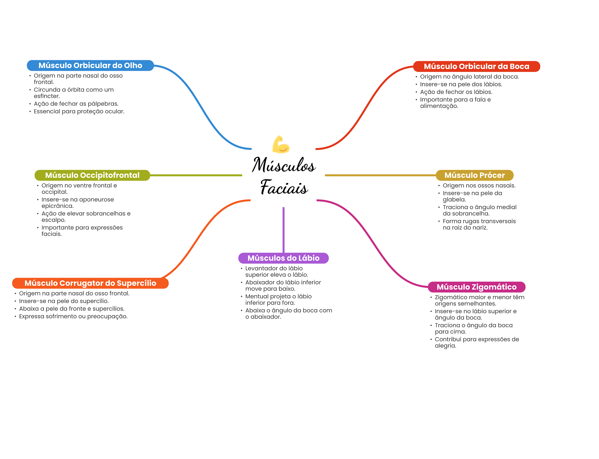 Músculo Orbicular do Olho Músculo Orbicular da Boca Origem na parte nasal do Origem no ângulo lateral da boca. frontal. Insere-se na pele dos lábios. Circunda a órbita como um Ação de fechar lábios. esfíncter. Importante para a fala e Ação de fechar as pálpebras. alimentação. Essencial para proteção ocular. Músculos Músculo Occipitofrontal Músculo Prócer Origem no ventre frontal e occipital. Faciais Origem nos nasais. Insere-se na pele da Insere-se na aponeurose glabela. epicrânica. Traciona ângulo medial Ação de elevar sobrancelhas e da sobrancelha. escalpo. Forma rugas transversais Importante para expressões na raiz do nariz. faciais. Músculos do Lábio Levantador do lábio superior eleva O lábio. Músculo Corrugator do Supercílio Abaixador do lábio inferior move para baixo. Músculo Zigomático Origem na parte nasal do frontal. Mentual projeta lábio Zigomático maior e menor têm Insere-se na pele do supercílio. inferior para fora. origens semelhantes. Abaixa a pele da fronte e supercílios. Abaixa ângulo da boca com Insere-se no lábio superior e Expressa sofrimento ou preocupação. abaixador. ângulo da boca. Traciona O ângulo da boca para cima. Contribui para expressões de alegria.