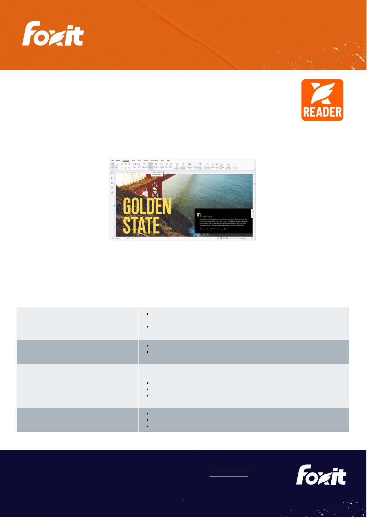 Foxit 39355 California Street, Suite 302 Fremont, CA 94538, EUA Vendas: 1-866-680-3668 Suporte: 1-866-693-6948 Ou 1-866-MYFOXIT Centro de Suporte www.foxit.com © Foxit Software Incorporated. Todos os direitos reservados. PDF READER GRATUITO, RÁPIDO E SEGURO O Foxit PDF Reader é o leitor de PDF mais poderoso do setor. É um Leitor de PDF pequeno, muito rápido e rico em recursos que permite aos usuários visualizar, anotar, preencher formulários e assinar documentos e formulários em PDF. Ele conta com uma barra de ferramentas de faixa de opções fácil de usar, no estilo do Microsoft Office, que facilita o aprendizado para usuários existentes do Office. O Foxit PDF Reader foi projetado para atender às necessidade de visualização de PDF de empresas e organizações governamentais. As suas opções de implantação em massa e a integração com os Sistemas de gerenciamento de conteúdo empresarial populares e serviços de armazenamento em nuvem tornam o leitor de PDF preferido para grandes grupos. A plataforma segura do Foxit PDF Reader garante operações seguras contra vírus mal intencionados. O Foxit PDF Reader está disponível para Windows, macOS, iOS, Android e nuvem. O Foxit PDF Reader fornece um conjunto completo de ferramentas de anotação para fazer comentários ou fazer anotações. LEITOR DE PDF REPLETO DE RECURSOS O Foxit PDF Reader é distribuído gratuitamente e amplamente disponível para download em sites de parceiros de todas as partes do mundo e permite que você visualize, imprima e colabore em documentos PDF profissionais. Os recursos de destaque do Foxit PDF Reader incluem: Visualização e impressão fáceis de documentos e formulários em PDF Abra e visualize todos os documentos PDF compatíveis, formulários PDF (Acroforms) e formulários XFA (XML Form Architecture). Conheça o produto rapidamente utilizando a barra de ferramentas ao estilo de faixa de opções do Microsoft Office, que fornece uma interface do usuário familiar. Ferramentas de colaboração fáceis de usar Adicione comentários ou sugestões usando notas. Destaque, sublinhe ou use uma das várias outras ferramentas para chamar atenção a um texto específico. Assinatura eletrônica de documentos em PDF Com o Foxit eSign integrado ao Foxit PDF Reader, é possível realizar as seguintes funções usando o PDF Reader: Cria uma conta Foxit eSign facilmente. Assinar eletronicamente documentos PDF. Coleta assinaturas de diversas pessoas e gerencia o fluxo de trabalho das assinaturas sem sair do PDF Reader. Assinar PDF Assine PDFs com assinaturas digitais. Assine usando a integração com o DocuSign. Assine com sua própria caligrafia ou aplique uma imagem salva como assinatura. https://kb.foxit.com/s/ http://www.foxit.com/ Foxit 39355 California Street, Suite 302 Fremont, CA 94538, EUA Vendas: 1-866-680-3668 Suporte: 1-866-693-6948 Ou 1-866-MYFOXIT Centro de Suporte www.foxit.com © Foxit Software Incorporated. Todos os direitos reservados. Preenchimento de formulários padrão, XFA e assinaturas digitais Suporte para formulários PDF interativos e não interativos. O preenchimento de formulários XFA (XML Form Architecture) permite aproveitar os formulários XFA existentes. Integração ao Microsoft SharePoint e Azure Information Protection (AIP) Criptografia e descriptografia de arquivos PDF com o AIP. Dá suporte a fluxos de trabalho do Microsoft Office. Descriptografa e abre arquivos protegidos por AIP em servidores SharePoint. Check-out/check-in uniforme de arquivos PDF localizados no SharePoint. Compatível com o suplemento da Microsoft Proteção por IRM para a Especificação PDF para o padrão ISO 32000. Suporte para multimídia: Adicione imagens, filmes, links e anexos de arquivos a qualquer documento PDF Adiciona/edita/reproduz multimídia em arquivos PDF. Adiciona uma imagem a um PDF, ajuste seu tamanho, sua posição e sua aparência. Anexe arquivos PDF e outros tipos de arquivos a um documento PDF. Configurações de modo de segurança Proteja-se contra vírus usando o modo de segurança. Aumente a proteção ao receber PDFs. Criação e inserção de carimbos Insira ou crie carimbos dinâmicos, predefinidos ou personalizados. Leitura e pesquisa de portfólios PDF Abra e leia os portfólios PDF e realize pesquisas em um único arquivo e/ou em todos os arquivos do portfólio. Fácil implementação em uma grande quantidade de usuários Suporte Group Policy (GPO), que padroniza o menu e as configurações em todos os usuários. Trabalhar em PRC 3D Renderize PDF PRC 3D. Meça objetos 3D. Comente em projetos 3D. Hardware mínimo recomendado para melhor desempenho Windows Processador de 1,3 GHz ou mais rápido (compatível com x86) ou processador ARM, Microsoft SQ1 ou melhor 512 MB de RAM (Recomendado: 1 GB de RAM ou mais) 1 GB de espaço disponível no disco rígido Resolução de tela de 1024*768 Com suporte para 4K e outras exibições de alta resolução macOS Processador Intel ou Apple 1 GB de memória RAM 1,2 GB de espaço disponível no disco rígido Resolução de tela de 1024*768 REQUISITOS DO SISTEMA Sistemas operacionais Windows Windows 11 ou Windows 10 macOS (consulte a Matriz de recursos da plataforma do sistema operacional para conhecer os recursos com suporte) macOS 12, macOS 13, macOS 14, macOS 15 ou macOS 26 iOS iOS 11 ou posterior Android Android 4.4 ou superior Navegadores (para o PDF Reader Online) Internet Explorer 9 ou superior, Microsoft Edge, Google Chrome, Mozilla Firefox, Safari e Opera Citrix Verificado como Citrix Ready com o Citrix XenApp 7.13 https://kb.foxit.com/s/ http://www.foxit.com/ https://www.foxit.com/pt-br/pdf-reader/comparison.html https://www.foxit.com/pt-br/pdf-reader/comparison.html