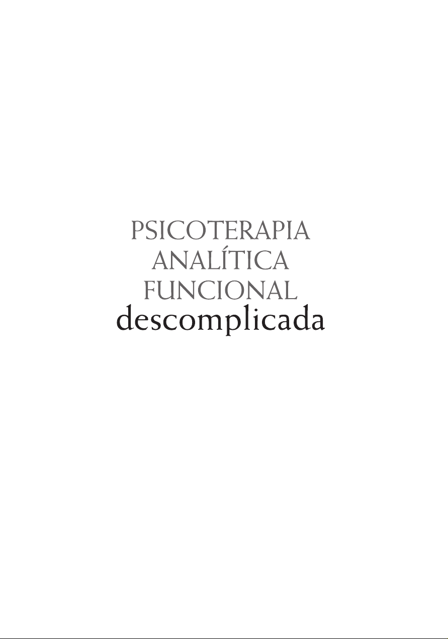 H747 Holman, Gareth. Psicoterapia analítica funcional descomplicada : guia prático para relações terapêuticas / Gareth Holman … [et al.] ; tradução de Alan Souza Aranha … [et al.] ; revisores técnicos Priscila Rolim de Moura … [et al.]. — Novo Hamburgo : Sinopsys Editora, 2022. 400 p. ; 23 cm. Tradução de: Functional Analytic Psychotherapy Made Simple: A Practical Guide to Therapeutic Relationships. ISBN 978-65-5571-088-5 1. Psicoterapia. 2. Psicoterapeuta e paciente. I. Aranha, Alan Souza. II. Título. CDD 616.891425 Catalogação na publicação: Vanessa Levati Biff — CRB 10/2454 DADOS INTERNACIONAIS DE CATALOGAÇÃO NA PUBLICAÇÃO (CIP) 2022 Revisão técnica Priscila Rolim de Moura Terapeuta, supervisora e treinadora em Psicoterapia Analítica Funcional certificada pela University of Washington. Mestra em Psicologia Clínica pela Leiden University (reconhecida pela Universidade de São Paulo). Fundadora da iMind – Psicologia e Mindfulness. Claudia Kami Bastos Oshiro Professora Doutora do Departamento de Psicologia Clínica do Instituto de Psicologia da Universidade de São Paulo. Cientista afiliada ao Center for the Science of Social Connection da University of Washington. Alessandra Villas-Bôas Doutora em Psicologia Clínica pela Universidade de São Paulo. Terapeuta e treinadora em Psicoterapia Analítica Funcional certificada pela University of Washington. Obra originalmente publicada sob o título Functional Analytic Psychotherapy Made Simple – A Practical Guide to Therapeutic Relationships Copyright © 2017 by Gareth Holman, Jonathan Kanter, Mavis Tsai and Robert Kohlenberg. New Harbinger Publications, Inc. 5674 Shattuck Avenue Oakland, CA 94609 www.newharbinger.com Supervisão editorial: Paola Araújo de Oliveira Assistente editorial: Vitória Duarte Martinez Tradução: Alan Souza Aranha, Amanda Raña Ferreira, Aline Redressa, Daniel Afonso Assaz, Elisângela Ferreira da Silva, Fernanda Moreira, Gabriela dos Santos, Gabriela de Oliveira Lima, Joana Figueiredo Vartanian, Mariana Salvadori Sartor, Renata da Conceição da Silva Pinheiro Capa: Márcio Monticelli Preparação de originais: Marquieli Oliveira Editoração: Ledur Serviços Editoriais Ltda. Todos os direitos reservados à Sinopsys Editora (51) 3066-3690 atendimento@sinopsyseditora.com.br www.sinopsyseditora.com.br Autores Gareth Holman, PhD, é psicólogo e terapeuta em Seattle. É sócio da OpenTeam, uma empresa de consultoria que ajuda as equipes de negó- cios e liderança a se comunicarem abertamente e a cooperarem de modo efetivo para alcançarem seus objetivos. Sua prática em consultório par- ticular se concentra em melhorar os relacionamentos e a comunicação. Ele treina e troca conhecimentos com terapeutas e treinadores que estão praticando psicoterapia analítica funcional (FAP, do inglês functional analytic psychotherapy) e terapias comportamentais relacionadas em todo o mundo. Jonathan Kanter, PhD, é doutor em Psicologia Clínica pela University of Washington e professor associado de pesquisa e de FAP no Departa- mento de Psicologia da University of Washington, onde dirige o Center for the Science of Social Connection. Sua pesquisa central se concentra na FAP e em outras intervenções baseadas em uma compreensão com- portamental e contextual da conexão social e das relações íntimas em áreas de importância para a saúde pública em que os relacionamentos importam, como a psicoterapia e o racismo. É considerado o líder de pesquisas sobre a FAP e é regularmente convidado para palestras, work- shops e supervisões sobre a abordagem em âmbito internacional. Mavis Tsai, PhD, é cofundadora da FAP e diretora da FAP Specialty Clinic da University of Washington. Tsai tem seguidores internacionais como instrutora, supervisora e clínica. vi Autores Robert Kohlenberg, PhD, é cofundador da FAP e professor de Psicolo- gia na University of Washington. Steven C. Hayes, PhD, escritor do Prefácio, é professor da Nevada Foundation e diretor da formação clínica no Departamento de Psicologia da University of Nevada. Autor de 41 livros e quase 600 artigos científicos, sua carreira se concentra na análise da natureza da linguagem e da cogni- ção humana e da sua aplicação à compreensão e ao alívio do sofrimento e à promoção da prosperidade. Entre outras associações, Hayes foi pre- sidente da Association for Behavioral and Cognitive Therapies (ABCT) e da Association for Contextual Behavioral Science (ACBS). Seu traba- lho recebeu vários prêmios, incluindo o Prêmio de Impacto da Ciência na Aplicação da Sociedade para o Avanço da Análise do Comportamento e o Prêmio pela Realização da Vida da ABCT. Para John Avery (avô): “Todo dia, faça alguém sorrir”. Consciência, coragem, amor e humor. Agradecimentos GARETH HOLMAN Há muitas pessoas que ajudaram a criar este livro, não apenas modelando as palavras e as ideias que estão nele, mas também me ajudando a crescer nos últimos anos. Compilando essa lista, sinto-me um homem de muita sorte: Jen Loser, por apresentar a ideia de que a criatividade é um ato de amor no momento certo. Jonathan Bricker, por oferecer segurança — quando eu estava decidindo se deveria ou não assumir este projeto — de que o livro poderia oferecer uma contribuição digna, apesar da ausência de uma forte base de evidências para a FAP. “Será lindo como um guia clínico.” Neil Kirkpatrick — o terapeuta comportamental mais eficaz (ou pelo menos opinativo) que conheço —, por organizar o pri- meiro rascunho cabeludo do Capítulo 1 de maneira profundamente útil. Yvonne Barnes-Holmes, Carmen Luciano, Niklas Törneke, Joe Oliver, John Boorman, Miles Thompson, Nic Hooper, Kelly Wilson e Louise McHugh, por me inspirarem com a clareza e a paixão do seu trabalho durante a conferência da ACBS em 2015, em Berlim. O livro se crista- lizou em grandes saltos durante aquela semana. Tien Mandell, pelo seu trabalho original e seu 