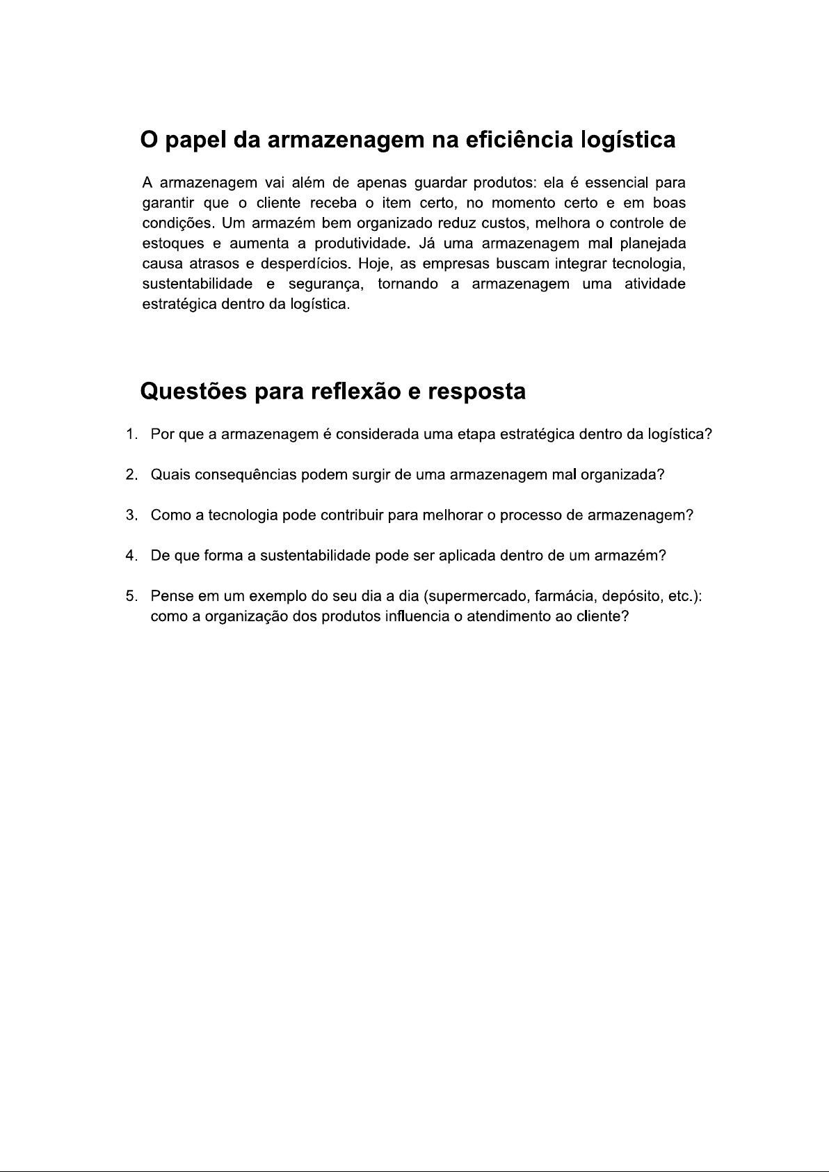 papel da armazenagem na eficiência logística A armazenagem vai além de apenas guardar produtos: ela é essencial para garantir que cliente receba o item certo, no momento certo e em boas condições. Um armazém bem organizado reduz custos, melhora controle de estoques e aumenta a produtividade. Já uma armazenagem mal planejada causa atrasos e desperdícios. Hoje, as empresas buscam integrar tecnologia, sustentabilidade e segurança, tornando a armazenagem uma atividade estratégica dentro da logística. Questões para reflexão e resposta 1. Por que a armazenagem é considerada uma etapa estratégica dentro da logística? 2. Quais consequências podem surgir de uma armazenagem mal organizada? 3. Como a tecnologia pode contribuir para melhorar o processo de armazenagem? 4. De que forma a sustentabilidade pode ser aplicada dentro de um armazém? 5. Pense em um exemplo do seu dia a dia (supermercado, farmácia, depósito, etc.): como a organização dos produtos influencia o atendimento ao cliente?