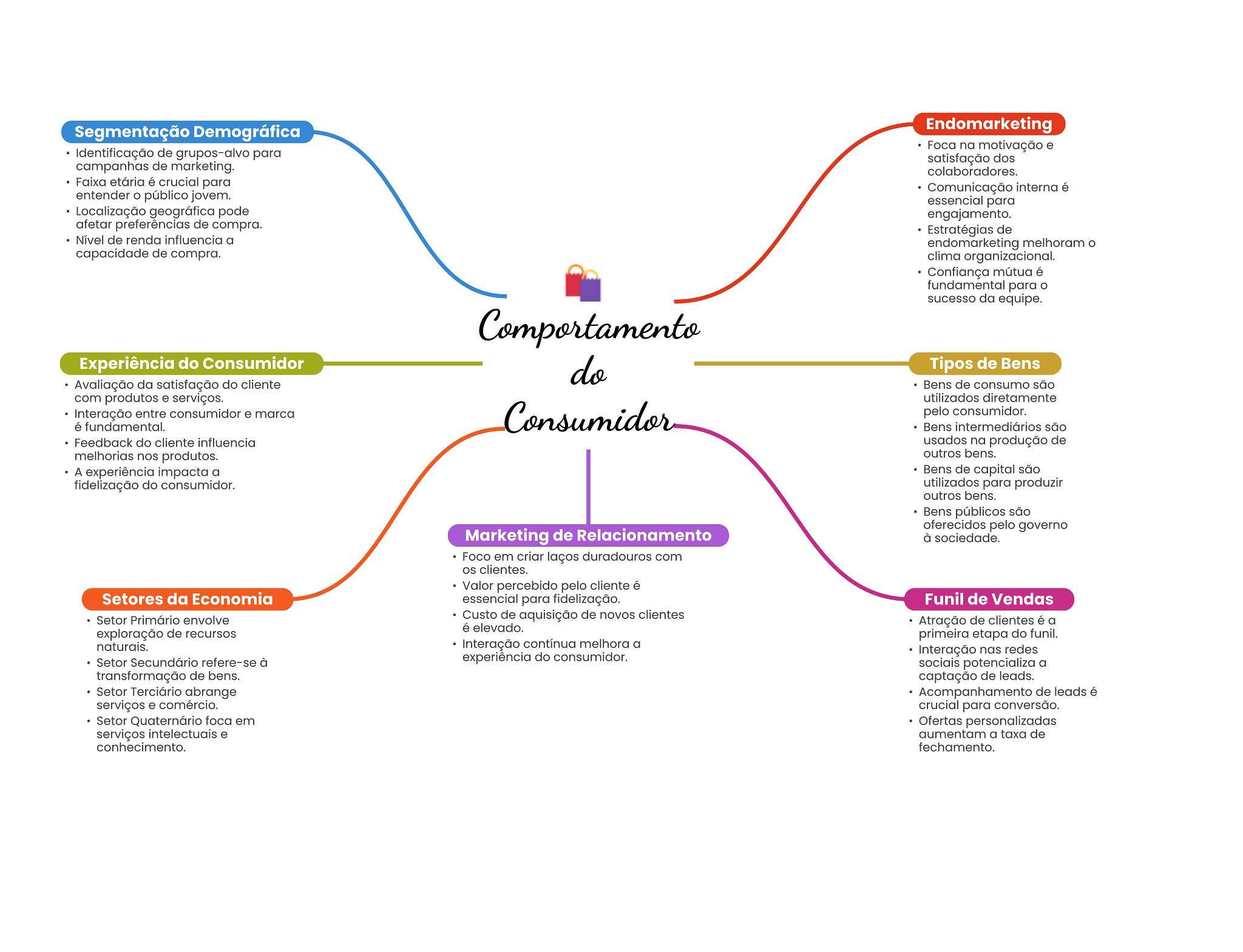 Segmentação Demográfica Endomarketing Foca na motivação e Identificação de grupos-alvo para satisfação dos campanhas de marketing. colaboradores. Faixa etária é crucial para Comunicação interna é entender público jovem. essencial para Localização geográfica pode engajamento. afetar preferências de compra. Estratégias de Nível de renda influencia a endomarketing melhoram capacidade de compra. clima organizacional. Confiança mútua é fundamental para sucesso da equipe. Comportamento Experiência do Consumidor do Tipos de Bens Avaliação da satisfação do cliente Bens de consumo são com produtos e serviços. utilizados diretamente Interação entre consumidor e marca Consumidor pelo consumidor. é fundamental. Bens intermediários são Feedback do cliente influencia usados na produção de melhorias nos produtos. outros bens. A experiência impacta a Bens de capital são fidelização do consumidor. utilizados para produzir outros bens. Bens públicos são oferecidos pelo, governo Marketing de Relacionamento à sociedade. Foco em criar laços duradouros com OS clientes. Valor percebido pelo cliente é Setores da Economia essencial para fidelização. Funil de Vendas Setor Primário envolve Custo de aquisição de novos clientes Atração de clientes é a é elevado. exploração de recursos primeira etapa do funil. naturais. Interação contínua melhora a Interação nas redes Setor Secundário refere-se à experiência do consumidor. sociais potencializa a transformação de bens. captação de leads. Setor Terciário abrange Acompanhamento de leads é serviços e comércio. crucial para conversão. Setor Quaternário foca em Ofertas personalizadas serviços intelectuais e aumentam a taxa de conhecimento. fechamento.