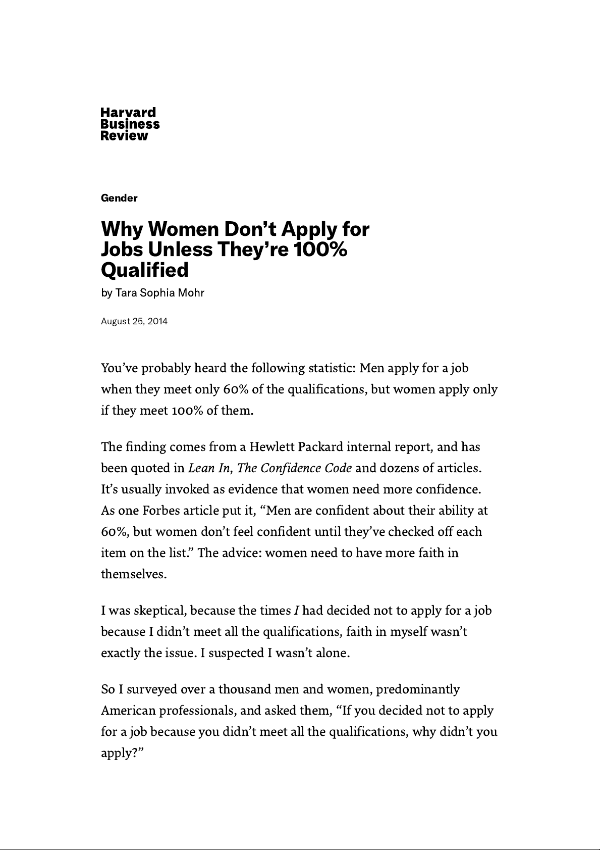 Gender Why Women Don’t Apply for Jobs Unless They’re 100% Qualified by Tara Sophia Mohr August 25, 2014 You’ve probably heard the following statistic: Men apply for a job when they meet only 60% of the qualifications, but women apply only if they meet 100% of them. The finding comes from a Hewlett Packard internal report, and has been quoted in Lean In, The Confidence Code and dozens of articles. It’s usually invoked as evidence that women need more confidence. As one Forbes article put it, “Men are confident about their ability at 60%, but women don’t feel confident until they’ve checked off each item on the list.” The advice: women need to have more faith in themselves. I was skeptical, because the times I had decided not to apply for a job because I didn’t meet all the qualifications, faith in myself wasn’t exactly the issue. I suspected I wasn’t alone. So I surveyed over a thousand men and women, predominantly American professionals, and asked them, “If you decided not to apply for a job because you didn’t meet all the qualifications, why didn’t you apply?” https://hbr.org/topic/gender https://hbr.org/search?term=tara%20sophia%20mohr http://www.forbes.com/sites/womensmedia/2014/04/28/act-now-to-shrink-the-confidence-gap/ According to the self-report of the respondents, the barrier to applying was not lack of confidence. In fact, for both men and women, “I didn’t think I could do the job well” was the least common of all the responses. Only about 10% of women and 12% of men indicated that this was their top reason for not applying. Men and women also gave the same most common reason for not applying, and it was by far the most popular, twice as common as any of the others, with 41% of women and 46% of men indicating it was their top reason: “I didn’t think they would hire me since I didn’t meet the qualifications, and I didn’t want to waste my time and energy.” In other words, people who weren’t applying believed they needed the qualifications not to do the job well, but to be hired in the first place. They thought that the required qualifications were…well, required qualifications. They didn’t see the hiring process as one where advocacy, relationships, or a creative approach to framing one’s expertise could overcome not having the skills and experiences outlined in the job qualifications. What held them back from applying was not a mistaken perception about themselves, but a mistaken perception about the hiring process. This is critical, because it suggests that if the HP finding speaks to a larger trend, women don’t need to try and find that elusive quality, “confidence,” they just need better information about how hiring processes really work. This is why, I think, the Hewlett Packard report finding is so often quoted, so eagerly shared amongst women, and so helpful. For those women who have not been applying for jobs because they believe the stated qualifications must be met, the statistic is a wake-up call that not everyone is playing the game that way. When those women know others are giving it a shot even when they don’t meet the job criteria, they feel free to do the same. Another 22% of women indicated their top reason was, “I didn’t think they would hire me since I didn’t meet the qualifications and I didn’t want to put myself out there if I was likely to fail.” These women also believed the on-paper “rules” about who the job was for, but for them, the cost of applying was the risk of failure – rather than the wasted time and energy. Notably, only 13% of men cited not wanting to try and fail as their top reason. Women may be wise to be more concerned with potential failure; there is some evidence that women’s failures are remembered longer than men’s. But that kind of bias may lead us to become too afraid of failure—avoiding it more than is needed, and in ways that don’t serve our career goals. The gender differences here suggest we need to expand the burgeoning conversation about women’s relationship with failure, and explore how bias, stereotype threat, the dearth of women leaders, and girls’ greater success in school all may contribute to our greater avoidance of failure. There was a sizable gender difference in the responses for one other reason: 15% of women indicated the top reason they didn’t apply was because “I was following the guidelines about who should apply.” Only 8% of men indicated this as their top answer. Unsurprisingly, given how much girls are socialized to follow the rules, a habit of “following the guidelines” was a more significant barrier to applying for women than men. All three of these barriers, which together account for 78% of women’s reasons for not applying, have to do with believing that the job qualifications are real requirements, and seeing the hiring process http://gender.stanford.edu/news/2014/what-works-women-work as more by-the-book and true to the on paper guidelines than it really is. It makes perfect sense that women take written job qualifications more seriously than men, for several reasons: First, it’s likely that due to bias in some work environments, women do need to meet more of the qualifications to be hired than do their male counterparts. For instance, a McKinsey report found that men are often hired or promoted based on their potential, women for their experience and track record. If women have watched that occur in their workplaces, it makes perfect sense they’d be less likely to apply for a job for which they didn’t meet the qualifications. Second, girls are strongly socialized to follow the rules and in school are rewarded, again and again, for doing so. In part, girls’ greater success in school (relative to boys) arguably can be attributed to their better rule following. Then in their careers, that rule-following habit has real costs, including when it comes to adhering to the guidelines about “who should app