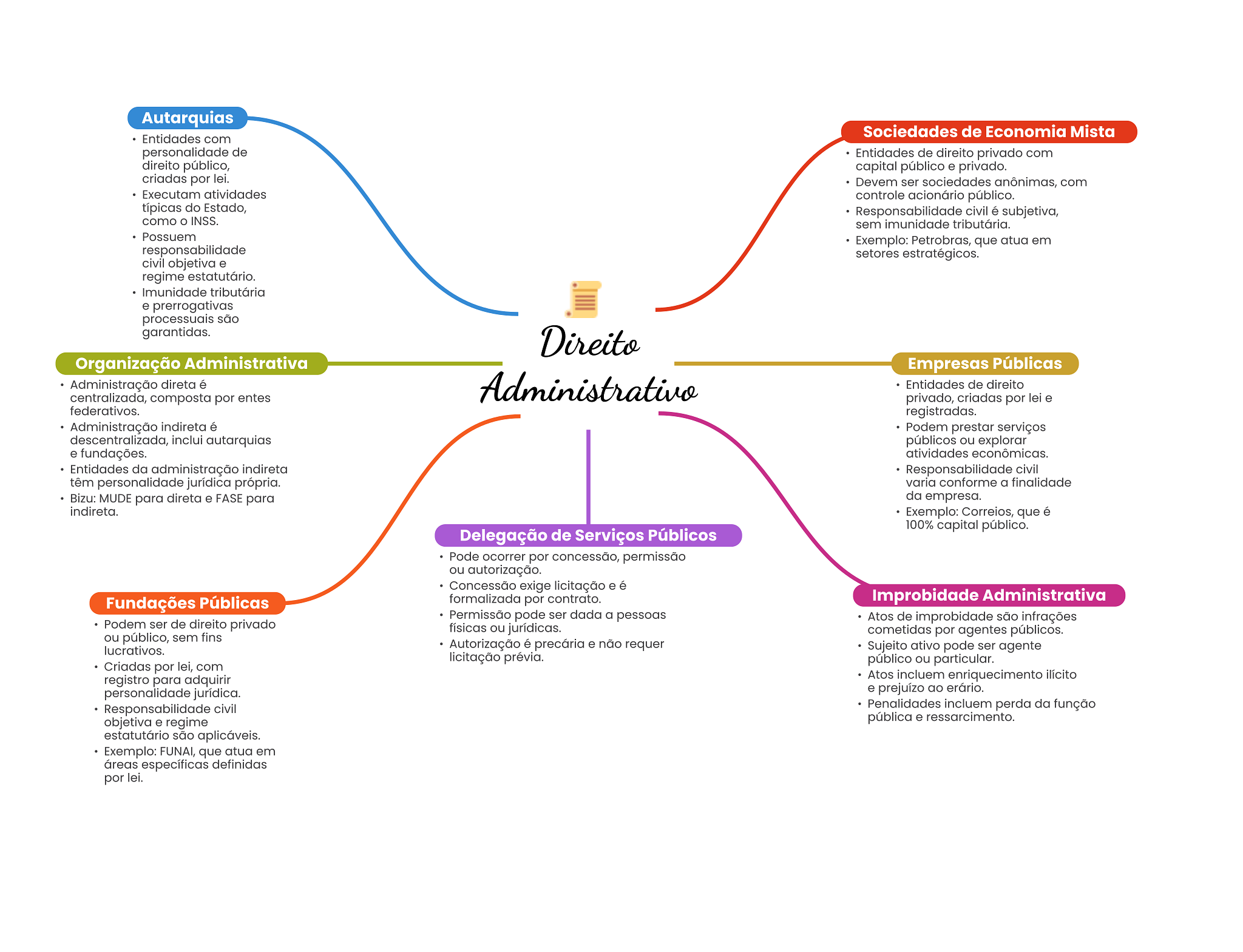 Autarquias Sociedades de Economia Mista Entidades com personalidade de Entidades de direito privado com direito público, capital público e privado. criadas por lei. Devem ser sociedades anônimas, com Executam atividades controle acionário público. típicas do Estado, Responsabilidade civil é subjetiva, como INSS. sem imunidade tributária. Possuem Exemplo: Petrobras, que atua em responsabilidade setores estratégicos. civil objetiva e regime estatutário. Imunidade tributária e prerrogativas processuais são garantidas. Direito Organização Administrativa Empresas Públicas Administração direta é centralizada, composta por entes Administrativo Entidades de direito privado, criadas por lei e federativos. registradas. Administração indireta é Podem prestar serviços descentralizada, inclui autarquias públicos ou explorar e fundações. atividades econômicas. Entidades da administração indireta Responsabilidade civil têm personalidade jurídica própria. varia conforme a finalidade Bizu: MUDE para direta e FASE para da empresa. indireta. Exemplo: Correios, que é 100% capital público. Delegação de Serviços Públicos Pode ocorrer por concessão, permissão ou autorização. Concessão exige licitação e é Fundações Públicas formalizada por contrato. Improbidade Administrativa Permissão pode ser dada a pessoas Atos de improbidade são infrações Podem ser de direito privado físicas ou jurídicas. cometidas por agentes públicos. ou público, sem fins lucrativos. Autorização é precária e não requer Sujeito ativo pode ser agente licitação prévia. público ou particular. Criadas por lei, com registro para adquirir Atos incluem enriquecimento ilícito personalidade jurídica. e prejuízo ao erário. Responsabilidade civil Penalidades incluem perda da função objetiva e regime pública e ressarcimento. estatutário são aplicáveis. Exemplo: FUNAI, que atua em áreas específicas definidas por lei.