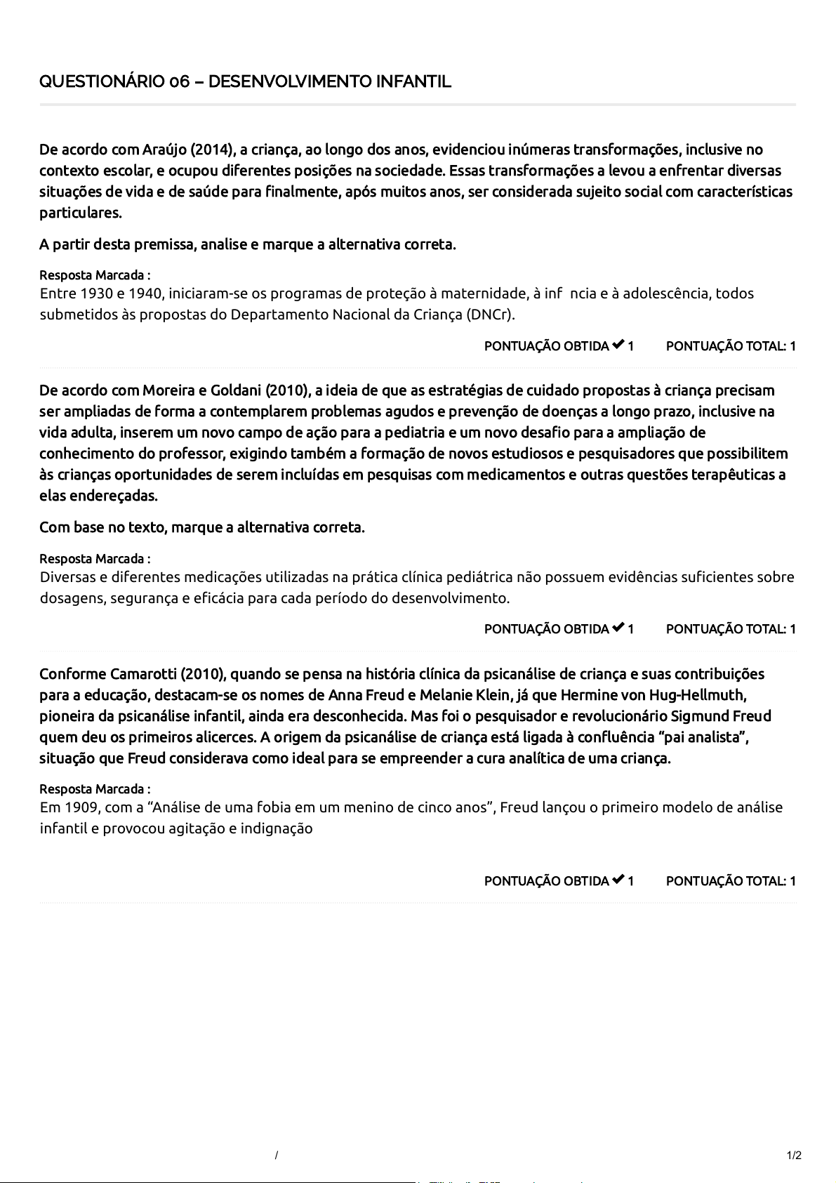 QUESTIONÁRIO 06 – DESENVOLVIMENTO INFANTIL PONTUAÇÃO TOTAL: 1PONTUAÇÃO OBTIDA 1 De acordo com Araújo (2014), a criança, ao longo dos anos, evidenciou inúmeras transformações, inclusive no contexto escolar, e ocupou diferentes posições na sociedade. Essas transformações a levou a enfrentar diversas situações de vida e de saúde para finalmente, após muitos anos, ser considerada sujeito social com características particulares. A partir desta premissa, analise e marque a alternativa correta. Resposta Marcada : Entre 1930 e 1940, iniciaram-se os programas de proteção à maternidade, à infância e à adolescência, todos submetidos às propostas do Departamento Nacional da Criança (DNCr). PONTUAÇÃO TOTAL: 1PONTUAÇÃO OBTIDA 1 De acordo com Moreira e Goldani (2010), a ideia de que as estratégias de cuidado propostas à criança precisam ser ampliadas de forma a contemplarem problemas agudos e prevenção de doenças a longo prazo, inclusive na vida adulta, inserem um novo campo de ação para a pediatria e um novo desafio para a ampliação de conhecimento do professor, exigindo também a formação de novos estudiosos e pesquisadores que possibilitem às crianças oportunidades de serem incluídas em pesquisas com medicamentos e outras questões terapêuticas a elas endereçadas. Com base no texto, marque a alternativa correta. Resposta Marcada : Diversas e diferentes medicações utilizadas na prática clínica pediátrica não possuem evidências suficientes sobre dosagens, segurança e eficácia para cada período do desenvolvimento. PONTUAÇÃO TOTAL: 1PONTUAÇÃO OBTIDA 1 Conforme Camarotti (2010), quando se pensa na história clínica da psicanálise de criança e suas contribuições para a educação, destacam-se os nomes de Anna Freud e Melanie Klein, já que Hermine von Hug-Hellmuth, pioneira da psicanálise infantil, ainda era desconhecida. Mas foi o pesquisador e revolucionário Sigmund Freud quem deu os primeiros alicerces. A origem da psicanálise de criança está ligada à confluência “pai analista”, situação que Freud considerava como ideal para se empreender a cura analítica de uma criança. Resposta Marcada : Em 1909, com a “Análise de uma fobia em um menino de cinco anos”, Freud lançou o primeiro modelo de análise infantil e provocou agitação e indignação na época, sendo a psicanálise acusada de roubar a inocência dessa criança. 31/08/2025, 00:17 Course Status – AVA Saúde Unifaveni https://ava.saude.unifaveni.com.br/course-status/ 1/2 5 / 5 PONTUAÇÃO TOTAL: 1PONTUAÇÃO OBTIDA 1 O atendimento clínico infantil está em uma crescente desde o seu surgimento e deve ocorrer em um espaço de acolhimento e escuta acerca das demandas emocionais apresentadas por uma criança. É um grande desafio, pois através de materiais lúdicos como brinquedos, livros e jogos é que vai surgindo a oportunidade de acessar o mundo da criança e sua singularidade, podendo assim auxiliá-la de forma gradativa e cuidadosa em seu processo terapêutico e de desenvolvimento. O papel dos pais é de extrema importância para a evolução adequada do processo, exigindo-se deles postura ativa e comunicativa. O texto se refere a qual atendimento clínico? Marque a alternativa correta. Resposta Marcada : Atendimento clínico de Psicoterapia Infantil. PONTUAÇÃO TOTAL: 1PONTUAÇÃO OBTIDA 1 A evolução histórica da participação da criança na sociedade, bem como do atendimento clínico infantil e os cuidados à saúde voltados a esta população, apresentou avanços, tendo como reflexo a redução da mortalidade infantil e implantação de diversas políticas públicas de saúde. Entretanto, como este fato é recente historicamente, muitas ações ainda precisam ser pontuadas, discutidas em profundidade, reorganizadas e pactuadas para que estes avanços possam realmente refletir as reais necessidades da população infantil. Com base no texto, analise e marque a alternativa correta. Resposta Marcada : A assistência à saúde da criança e o atendimento clínico infantil ainda se encontram em processo de construção, assim como a assistência à saúde em geral. Total de Pontos 31/08/2025, 00:17 Course Status – AVA Saúde Unifaveni https://ava.saude.unifaveni.com.br/course-status/ 2/2