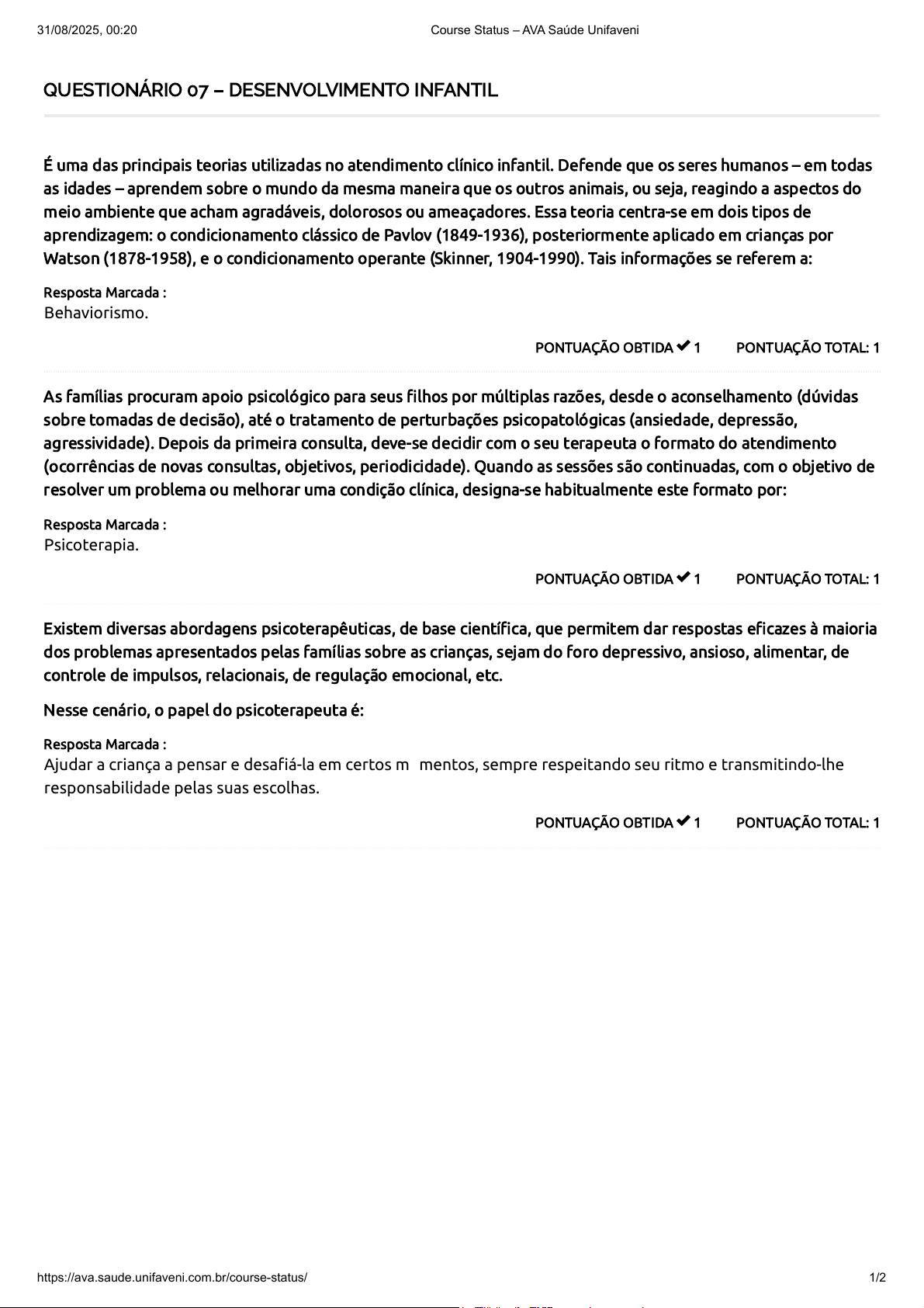 QUESTIONÁRIO 07 – DESENVOLVIMENTO INFANTIL PONTUAÇÃO TOTAL: 1PONTUAÇÃO OBTIDA 1 É uma das principais teorias utilizadas no atendimento clínico infantil. Defende que os seres humanos – em todas as idades – aprendem sobre o mundo da mesma maneira que os outros animais, ou seja, reagindo a aspectos do meio ambiente que acham agradáveis, dolorosos ou ameaçadores. Essa teoria centra-se em dois tipos de aprendizagem: o condicionamento clássico de Pavlov (1849-1936), posteriormente aplicado em crianças por Watson (1878-1958), e o condicionamento operante (Skinner, 1904-1990). Tais informações se referem a: Resposta Marcada : Behaviorismo. PONTUAÇÃO TOTAL: 1PONTUAÇÃO OBTIDA 1 As famílias procuram apoio psicológico para seus filhos por múltiplas razões, desde o aconselhamento (dúvidas sobre tomadas de decisão), até o tratamento de perturbações psicopatológicas (ansiedade, depressão, agressividade). Depois da primeira consulta, deve-se decidir com o seu terapeuta o formato do atendimento (ocorrências de novas consultas, objetivos, periodicidade). Quando as sessões são continuadas, com o objetivo de resolver um problema ou melhorar uma condição clínica, designa-se habitualmente este formato por: Resposta Marcada : Psicoterapia. PONTUAÇÃO TOTAL: 1PONTUAÇÃO OBTIDA 1 Existem diversas abordagens psicoterapêuticas, de base científica, que permitem dar respostas eficazes à maioria dos problemas apresentados pelas famílias sobre as crianças, sejam do foro depressivo, ansioso, alimentar, de controle de impulsos, relacionais, de regulação emocional, etc. Nesse cenário, o papel do psicoterapeuta é: Resposta Marcada : Ajudar a criança a pensar e desafiá-la em certos momentos, sempre respeitando seu ritmo e transmitindo-lhe responsabilidade pelas suas escolhas. 31/08/2025, 00:20 Course Status – AVA Saúde Unifaveni https://ava.saude.unifaveni.com.br/course-status/ 1/2 5 / 5 PONTUAÇÃO TOTAL: 1PONTUAÇÃO OBTIDA 1 A Psicologia dispõe de diferentes teorias do desenvolvimento infantil. Tais teorias, muitas vezes, servem de base para a compreensão do modo de ser da criança, por meio dos critérios de normalidade e de ajustamento, podendo-se assim prescrever os comportamentos inadequados, desajustados, enfim, fora dos padrões estabelecidos pelo numérico ou qualitativo. Na fenomenologia, adotar uma atitude fenomenológica na clínica psicológica implica em não fazer ou pensar o que naturalmente se faz ou se pensa. Nessa perspectiva, a postura fenomenológica implica em: Resposta Marcada : Deslocar-se das interpretações comumente atribuídas, assumindo uma atitude antinatural com relação à questão que se apresenta, ou seja, tomando o modo de ser da criança em sua expressão singular. PONTUAÇÃO TOTAL: 1PONTUAÇÃO OBTIDA 1 Técnica psicoterápica de abordagem infantil, que se baseia no fato de que brincar é um meio natural de autoexpressão da criança. O brincar terapêutico tem sido objeto de estudo nas diferentes linhas teóricas da Psicologia, tais como a Psicanálise, Cognitivo comportamental e o Humanismo, pois é considerada como mais uma possibilidade diagnóstica e/ou terapêutica nos atendimentos. Esta definição refere-se a: Resposta Marcada : Ludoterapia. Total de Pontos 31/08/2025, 00:20 Course Status – AVA Saúde Unifaveni https://ava.saude.unifaveni.com.br/course-status/ 2/2