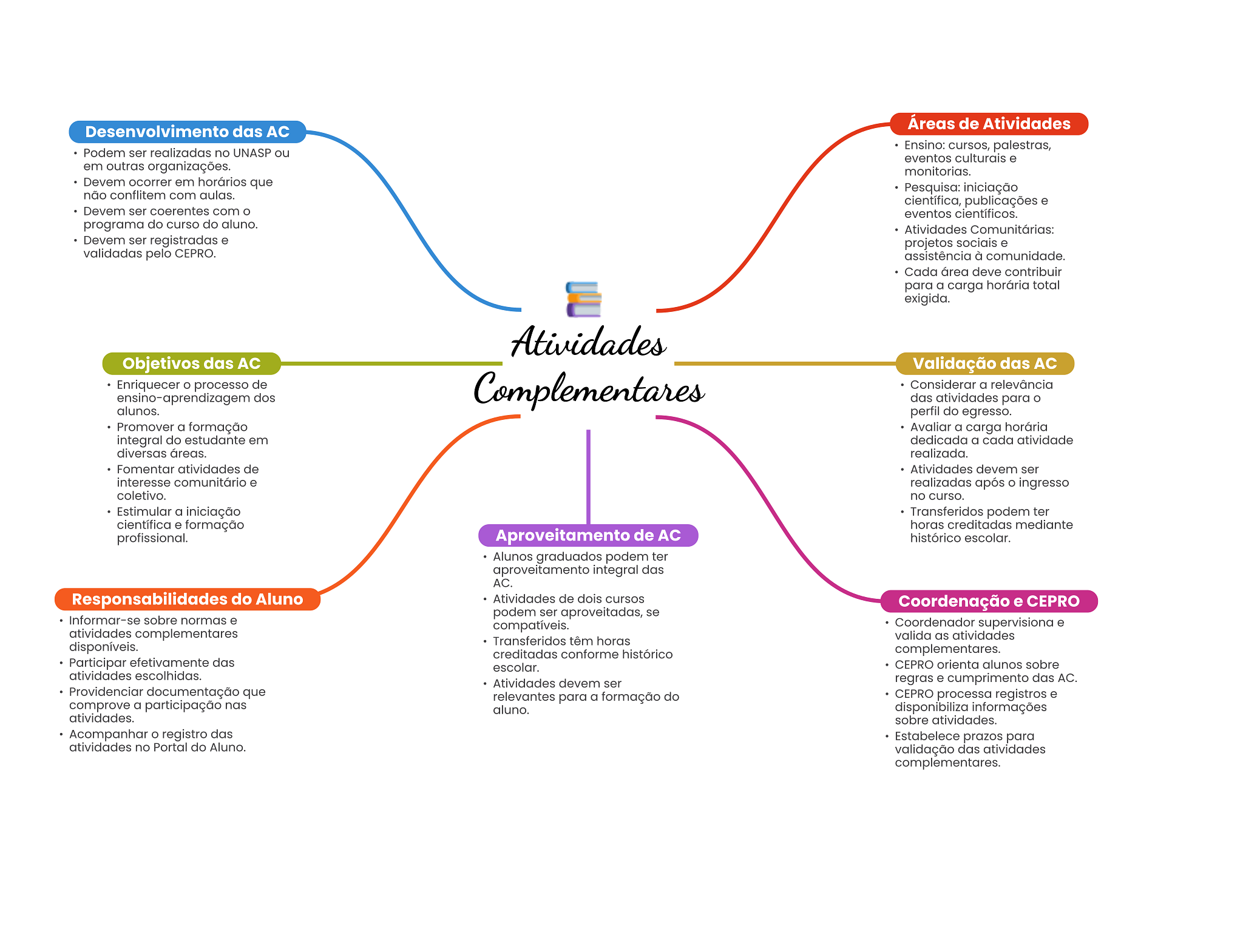Áreas de Atividades Desenvolvimento das Ensino: cursos, palestras, Podem ser realizadas no UNASP ou eventos culturais e em outras organizações. monitorias. Devem ocorrer em horários que Pesquisa: iniciação não conflitem com aulas. científica, publicações e Devem ser coerentes com eventos científicos. programa do curso do aluno. Atividades Comunitárias: Devem ser registradas e projetos sociais e validadas pelo CEPRO. assistência à comunidade. Cada área deve contribuir para a carga horária total exigida. Atividades Objetivos das Validação das Enriquecer processo de ensino-aprendizagem dos Complementares Considerar a relevância das atividades para alunos. perfil do egresso. Promover a formação Avaliar a carga horária integral do estudante em dedicada a cada atividade diversas áreas. realizada. Fomentar atividades de Atividades devem ser interesse comunitário e realizadas após ingresso coletivo. no curso. Estimular a iniciação Transferidos podem ter científica e formação horas creditadas mediante profissional. Aproveitamento de histórico escolar. Alunos graduados podem ter aproveitamento integral das AC. Responsabilidades do Aluno Atividades de dois cursos Coordenação e CEPRO podem ser aproveitadas, se Informar-se sobre normas e compatíveis. Coordenador supervisiona e atividades complementares Transferidos têm horas valida as atividades disponíveis. creditadas conforme histórico complementares. Participar efetivamente das escolar. CEPRO orienta alunos sobre atividades escolhidas. Atividades devem ser regras e cumprimento das Providenciar documentação que relevantes para a formação do CEPRO processa registros e comprove a participação nas aluno. disponibiliza informações atividades. sobre atividades. Acompanhar registro das Estabelece prazos para atividades no Portal do Aluno. validação das atividades complementares.