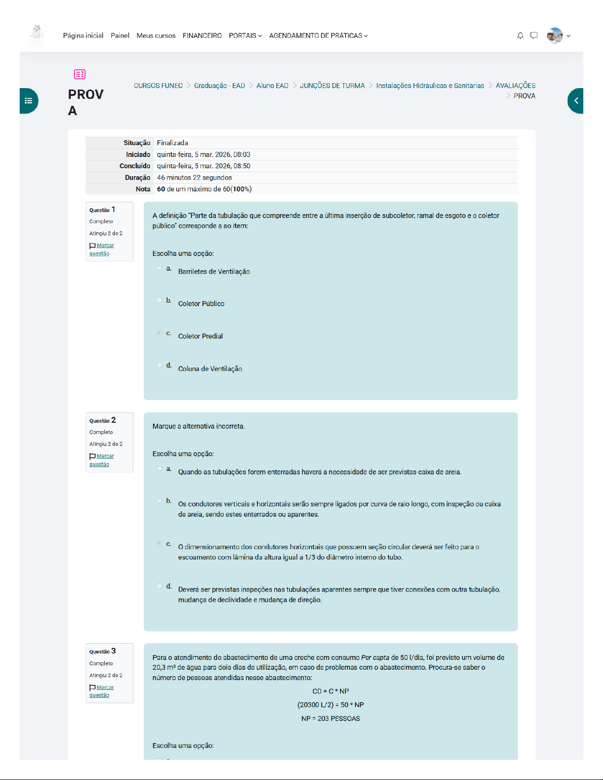 Página inicial Painel Meus cursos FINANCEIRO PORTAIS AGENDAMENTO DE PRÁTICAS CURSOS FUNEC Graduação EAD Aluno EAD JUNÇÕES DE TURMA Instalações Hidráulicas e Sanitárias AVALIAÇÕES PROV PROVA200 pessoas b. 255 pessoas 302 pessoas d. 203 pessoas Questão 4 Marque a alternativa que corresponde ao diâmetro interno e o diâmetro nominal da tubulação de saída da caixa de Completo gordura que atenda 1 cozinha. Atingiu de 2 Marcar questão Escolha uma opção: a. 60 cm e 75 mm b. 40 cm e 100 mm 50 cm e 100 mm d. 30 cm e 75 mm Questão 5 período de retorno é baseado nas características da área a ser drenada, com isso verifique as afirmações listadas Completo abaixo. Atingiu de 2 I) T = 1 ano para áreas pavimentadas em que empoçamentos possam ser tolerados. Marcar questão II) T = 5 anos para coberturas e áreas em que empoçamentos ou extravasamentos não possam ser tolerados. III) T = 25 anos para coberturas ou terraços. Escolha uma opção: a. e são verdadeiras e falsa. b. e III são verdadeiras e falsa. e III são falsas e verdadeira. d. le III são falsas e verdadeira. Questão 6 Leia as assertivas abaixo e marque a ERRADA. Completo Atingiu 2 de 2 Marcar Escolha uma opção: questão a. No caso de a edificação ser comercial e possuir lojas independentes e a porta principal não der acesso à circulação comum da edificação, no local em que estiver instalado o sistema de segurança contra incêndio, é necessário que haja no mínimo duas Capacidade Extintora para cada loja ou sala. b. emprego dos extintores manuais e sobre roda faz-se obrigatório para áreas maiores que 400 e que tenha risco de incêndio elevado.As edificações que tiverem uma diversificação de riscos, extintores precisam ser instalados de maneira adequada à natureza do fogo a ser eliminado dentro de sua área de proteção. d. A edificação que possuir extintores sobre rodas, será considerada, no máximo a metade da carga para efeito de cálculo da capacidade extintora. Questão 7 Em uma rede de esgoto sanitário foi instalada uma caixa sifonada com diâmetro nominal DN 150. A quantidade Completo máxima de Unidades Hunter de Contribuição de efluentes de aparelhos sanitários para essa caixa sifonada é de: Atingiu 2 de 2 Marcar questão Escolha uma opção: a. 10 UHC. b. 4 UHC. C. 6 UHC. d. 15 UHC. Questão 8 Um projetista foi solicitado para dimensionar uma instalação de águas pluviais. Sabe-se que, a intensidade Completo pluviométrica na região é de 235mm/h. A área de contribuição é de 5.000.000 A vazão de projeto é Atingiu 2 de 2 aproximadamente: Marcar Q A) /60] Q = [(235 mm/h* 500 /60] Q 1,958,30 L/min Escolha uma opção: a. 117,50 L/min b. 1.958,30 L/s C. 1.958,30 L/min d. 117,50 L/h Questão 9 Analise as afirmações a seguir e marque a correta no que diz respeito a subcoletor e coletor predial: Completo I) Os trechos devem apresentar traçados retilíneo, ou não havendo a necessidade deverá ser feito desvios Atingiu 2 de 2 com peças que possuem ângulo igual ou menor que Marcar questão II) Em tubulações enterradas as junções são feitas por caixa de inspeção ou poços de visitas. III) A declividade máxima que dever ser considerada nos trechos é de 2%. IV) Tubulações aparentes possuem as interligações de ramais de descarga, esgoto e subcoletores por junções a 45°. Escolha uma opção: a. V-V-F-Fb. V-F-F-V F-V-V-F d. F-V-F-V Questão 10 Das assertivas abaixo é CORRETO afirmar que: Completo Atingiu 2 de 2 Marcar Escolha uma opção: questão a. Se haver diversas instalações comerciais em uma mesma edificação, levar-se em consideração para cálculo de carga, a instalação que tiver uma maior área. b. Residencial, escolar, reunião de público, comercial, mista e pública são classificadas como edificações de risco leve. As edificações classificadas com industrial, garagens e depósitos de inflamáveis são consideradas de risco leve. d. São consideradas de risco leve as edificações comerciais quando esta não se encontrarem em um pavimento único. Questão 11 A seguinte definição: "Carecem ser em cor vermelha ou dotados de material transparente, dispondo de apoio ou Completo fixação própria, isto independente da tubulação que é responsável por abastecer hidrante ou mangotinho", se refere Atingiu de 2 a qual item. Marcar Escolha uma opção: a. Abrigos b. Tomada de água C. Hidrantes d. Mangueira de incêndio Questão 12 Dimensionar o consumo diário (em litros por dia) de um prédio de apartamentos com seguintes dados: Completo 10 pavimentos; Atingiu 2 de 2 Marcar 4 apartamentos por pavimento; questão 2 quartos por apartamento; Consumo Per capta tabela 2/dia (média de 200 I/dia) NP = [(2*ND+Nde) *Naptos*Npav] NP = [(2*2) *4*10] NP = 160 pessoas CD NP CD 200 * 160 CD = 32000 L/diaEscolha uma opção: a. 26000 L/ dia b. 32500 L/ dia 32000 L/dia d. 47500 L/ dia Questão 13 Com relação aos projetos de instalações prediais de águas pluviais, é correto afirmar: Completo Atingiu de 2 Marcar Escolha uma opção: questão a. No dimensionamento dos condutores verticais e horizontais, os diâmetros internos devem ser dimensionados a partir da vazão de projeto (L/min), da altura da lâmina de água na calha (mm) e do comprimento do condutor vertical (m), lembrando que diâmetro mínimo destes condutores é de 50mm. b. No dimensionamento de condutores horizontais sempre que haver conexões com outra tubulação, mudança de declividade, mudança de direção, deverá ser previstas inspeções nas tubulações aparentes, assim como a cada trecho de 20 metros nos percursos retilíneos. A intensidade de precipitação (I) varia de acordo com a área de projeção horizontal, sendo assim, quando está área for menor que a intensidade que deverá ser adotada é de 150mm/h. Se a área for maior que deve basear-se na Tabela 1 disposta na NBR 10844/1989. d. De acordo com a NBR 10844 (1989), o dimensionamento dos condutores horizontais 