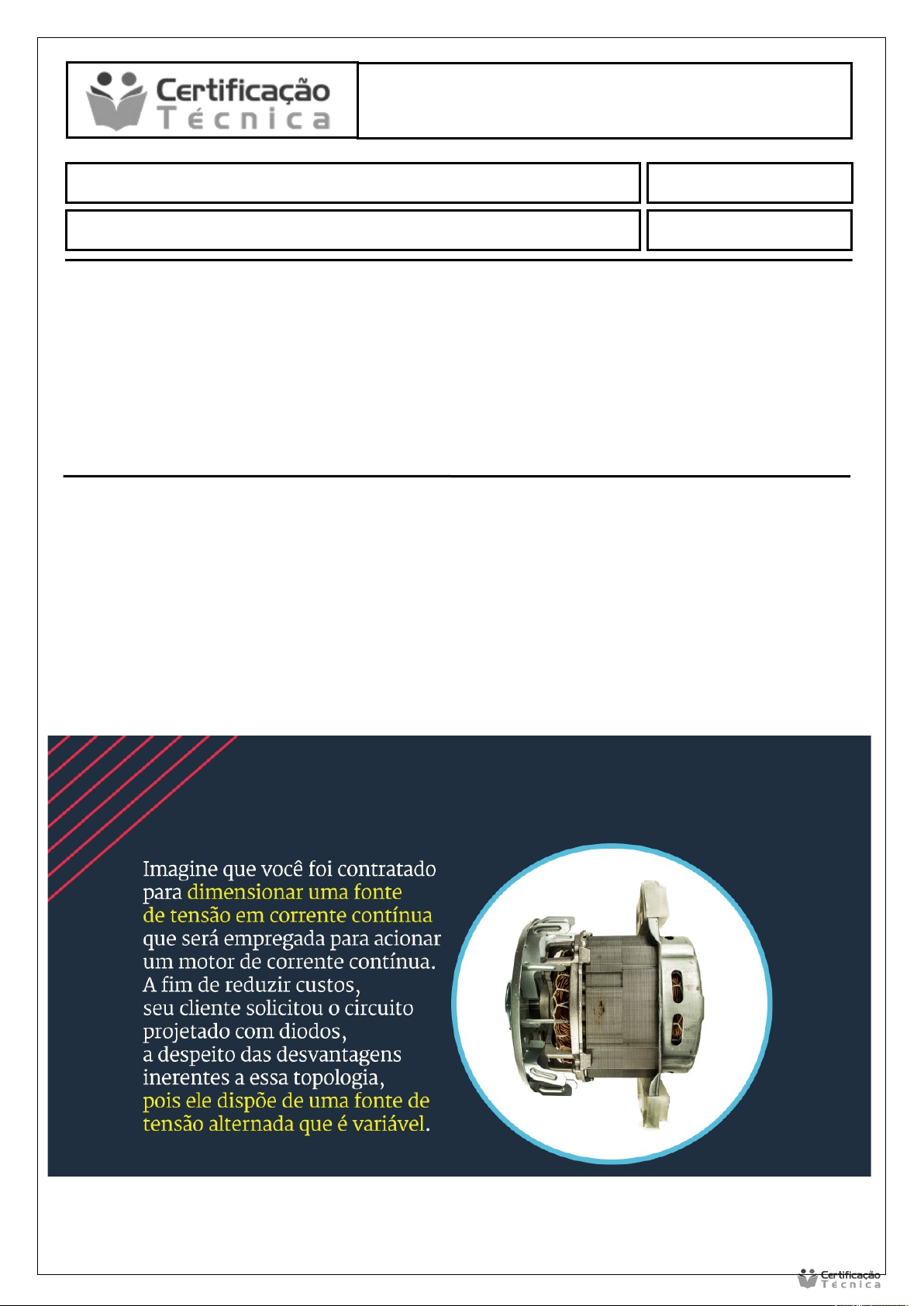 Princípios de Eletrônica Analógica Data: .24/02/2026 Aluno (a): Avaliação Pratica Instruções · Esta atividade é composta por questões que somam 10 (dez) pontos. · Preencha o cabeçalho com seus dados para identificação (Nome / Data de entrega); · Responda o questionário colocando as respostas logo abaixo de cada pergunta (não serão aceitos prints, cópias da internet ou uso de IA); · Em caso de dúvida, entre em contato com o tutor pelo sistema de tutoria, acessando provasct.com.br (Login e senha: seu CPF). O controle de velocidade de motores elétricos é uma das aplicações mais comuns dos circuitos de eletrônica de potência. Trata-se de inversores para motores de corrente alternada e retificadores – controlados e não controlados – para motores de corrente contínua. Em outras palavras, dada a saída do circuito de eletrônica de potência, você sabe em qual tipo de máquina ele se emprega. Porém, no caso dos retificadores a diodo, seu emprego é mais limitado, pois não é possível controlar diretamente no retificador o nível de tensão CC da saída. Isso implica a necessidade de fazer ajustes na tensão de forma externa ao circuito de retificação. Considere a situação a seguir: Com base nos dados de placa do respectivo motor, projete uma fonte de tensão em corrente contínua que utiliza um retificador monofásico de onda completa. Essa fonte deve ser projetada para suprir as demandas de tensão e corrente do motor e apresentar uma tensão de Ripple de 10V. Primeiramente, verifico os dados de placa do motor, como tensão nominal e corrente nominal. Supondo que o motor seja alimentado, por exemplo, com 220V em corrente contínua e consuma uma determinada corrente nominal (In), o projeto da fonte deve garantir essa mesma tensão média na saída do retificador. Para isso, utilizo um retificador monofásico de onda completa em ponte, pois ele aproveita os dois semiciclos da rede, aumentando a eficiência e reduzindo a ondulação em comparação ao retificador de meia onda. A tensão média na saída do retificador de onda completa é dada aproximadamente por: Vcc ≈ 0,9 × Vac (rms) Assim, escolho um transformador cuja tensão secundária, após a retificação e filtragem, forneça a tensão contínua necessária ao motor. Para limitar o Ripple a 10V, dimensiono o capacitor de filtro utilizando a relação: Vr ≈ I / (f × C) Onde: · Vr = 10V (Ripple desejado) · I = corrente do motor · f = 2 × frequência da rede (em 60Hz, fica 120Hz para onda completa) · C = capacitância do filtro Isolando C: C = I / (f × Vr) Substituo os valores da corrente nominal do motor e da frequência (120Hz), obtendo o valor mínimo do capacitor necessário para manter o Ripple em 10V. Por fim: · Escolho diodos da ponte retificadora com corrente nominal superior à corrente do motor. · Dimensiono o transformador com potência compatível (P = V × I). · Seleciono o capacitor com tensão de trabalho maior que a tensão de saída. Assim, a fonte projetada atende à tensão e corrente do motor e mantém a tensão de Ripple em 10V, conforme solicitado. image1.png image2.png
