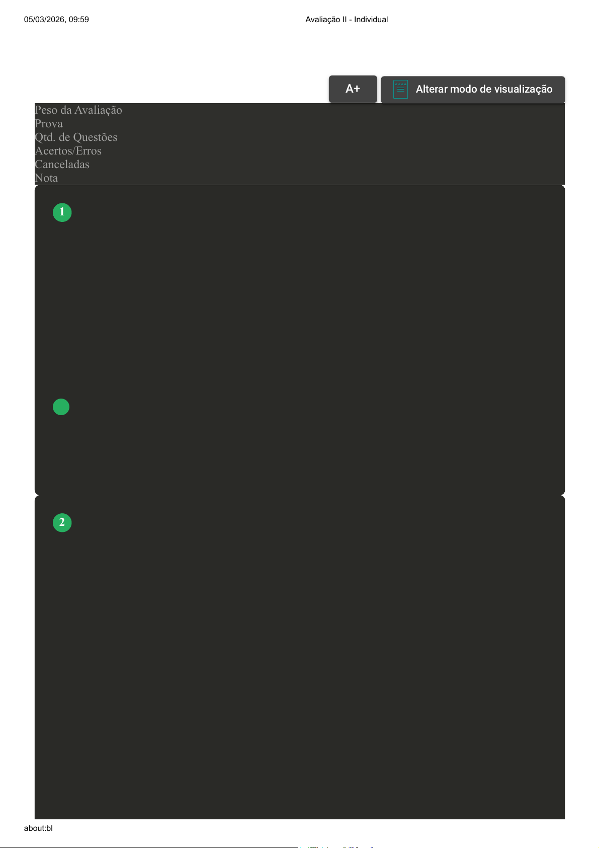 Prova Impressa GABARITO | Avaliação II - Individual (Cod.:1522938) Peso da Avaliação 2,00 Prova 105454678 Qtd. de Questões 10 Acertos/Erros 9/0 Canceladas 1 Nota 10,00 [Laboratório Virtual – Enzimas: Catalisadores e Inibidores de Reação Química] – De maneira geral, pode-se dizer que as enzimas são proteínas que atuam diretamente nas reações químicas biológicas. Nesta prática, há o uso de substratos crus e cozidos, que têm a função de analisar os efeitos da atividade enzimática na degradação da água oxigenada. Com base nos resultados observados, assinale a alternativa CORRETA: A Os resultados não evidenciaram desnaturação proteica. B Os resultados mostraram que o limão adicionado à batata crua acelera a reação. C Observou-se desprendimento de gás no béquer contendo água oxigenada e batata crua. D Observou-se formação de precipitado no béquer contendo água oxigenada e batata cozida. As enzimas são proteínas altamente especializadas e eficientes que desempenham um papel essencial na estrutura e função biológica. Sua complexa estrutura tridimensional permite que elas catalisem reações químicas específicas em organismos vivos. Agindo como catalisadores biológicos, as enzimas aceleram as reações químicas, garantindo que ocorram em uma taxa adequada para sustentar a vida. Com alta especificidade, as enzimas reconhecem e interagem seletivamente com seus substratos, graças à forma e aos resíduos aminoácidos em seu sítio ativo. Além disso, as enzimas são capazes de operar em condições suaves, como temperaturas moderadas e pH neutro, sendo essenciais para a manutenção da homeostase. Fonte: adaptado de: TORTORA, G. J.; FUNKE, B. R.; CASE, L. C. Microbiologia. 12. ed. São Paulo: Artmed, 2017. Com base nos conceitos sobre as enzimas, analise as afirmativas a seguir: I. A função da enzima é aumentar a velocidade da reação, sendo consumida durante o processo. II. As enzimas são proteínas que atuam como catalisadores e requerem cofatores, como íons metálicos ou coenzimas, para desempenhar suas funções catalíticas. III. O aspecto fundamental das enzimas é a sua capacidade de aumentar a energia de ativação necessária para que uma reação química ocorra, permitindo que a reação ocorra mais rapidamente. VOLTAR A+Aumentar, FonteAlterar modo de visualização 1 2 05/03/2026, 09:59 Avaliação II - Individual about:blank 1/7 IV. As reações enzimáticas ocorrem por meio da criação de um caminho alternativo com uma energia de ativação menor. Esse caminho envolve a formação de um estado de transição ou complexo enzima- substrato transitório. É correto o que se afirma em: A II e IV, apenas. B I, II, III e IV. C I, II e III, apenas. D I e III, apenas. [Laboratório Virtual – Enzimas: Catalisadores e Inibidores de Reação Química] – A decomposição da água oxigenada é essencial nos organismos vivos, pois esse composto é altamente oxidante e, assim, destrutivo para a célula. Nesse contexto, percebe-se a importância do estudo da ação da catalase, enzima responsável por acelerar a decomposição da água oxigenada. Considerando as etapas experimentais da atividade prática “Enzimas: Catalisadores e Inibidores de Reação Química” assinale a alternativa CORRETA: A A solução de água oxigenada é adicionada, em gotas, na superfície dos pedaços de batata crua e cozida para a realização do experimento. B Para a realização do experimento, os pedaços de batata são colocados em béqueres, enquanto que os pedaços de fígado são colocados em placas de Petri. C O fígado é cozido, em uma das etapas do experimento, em banho maria, a uma temperatura de 45 graus celsius. D O suco de limão é adicionado aos pedaços de batata e fígado para avaliar se o ácido acético também age como catalisador. O DNA e o RNA são moléculas fundamentais para a vida. O DNA carrega informações genéticas essenciais que determinam as características de um organismo. Ele é formado por duas hélices complementares e possui bases nitrogenadas adenina, timina, citosina e guanina. Já o RNA é responsável pela transcrição e tradução dessas informações. Ele é uma única fita de nucleotídeos, com a timina substituída pela uracila. O DNA é estável e permanece no núcleo celular, enquanto o RNA pode ser encontrado tanto no núcleo quanto no citoplasma. Essas moléculas desempenham papéis 3 4 05/03/2026, 09:59 Avaliação II - Individual about:blank 2/7 vitais na síntese de proteínas e na regulação dos processos celulares, garantindo a diversidade e a funcionalidade da vida. Fonte: adaptado de: NELSON, D. L.; COX, M. M. Princípios de bioquímica. 6. ed. Porto Alegre: Artmed, 2014. Sobre o DNA e o RNA, analise as afirmativas a seguir: I. O mRNA é considerado "mensageiro" porque carrega a mensagem do DNA para a síntese de proteínas. II. A replicação é semiconservativa, pois a cada dupla hélice recém-formada contém uma fita nova e uma fita velha. III. As duas fitas do DNA são paralelas, o que significa que elas correm na mesma direção, de 5' para 3'. Essa configuração é importante para a estabilidade da estrutura de dupla hélice do DNA. É correto o que se afirma em: A I, apenas. B II e III, apenas. C I e II, apenas. D I, II e III. As proteínas são moléculas importantes para as células e são formadas por aminoácidos, que são pequenas peças que se unem em uma sequência. Existem muitos tipos de proteínas e cada uma tem sua própria forma e função específicas, como ajudar na construção e manutenção das estruturas celulares. Por exemplo, algumas proteínas ajudam na digestão dos alimentos, enquanto outras transportam oxigênio pelo corpo. As proteínas também são essenciais para o crescimento e reparo dos tecidos. Em resumo, as proteínas são moléculas importantes que desempenham muitas funções vitais nas células e organismos. Fonte: adaptado de: NELSON, D. L.; COX, M. M. P