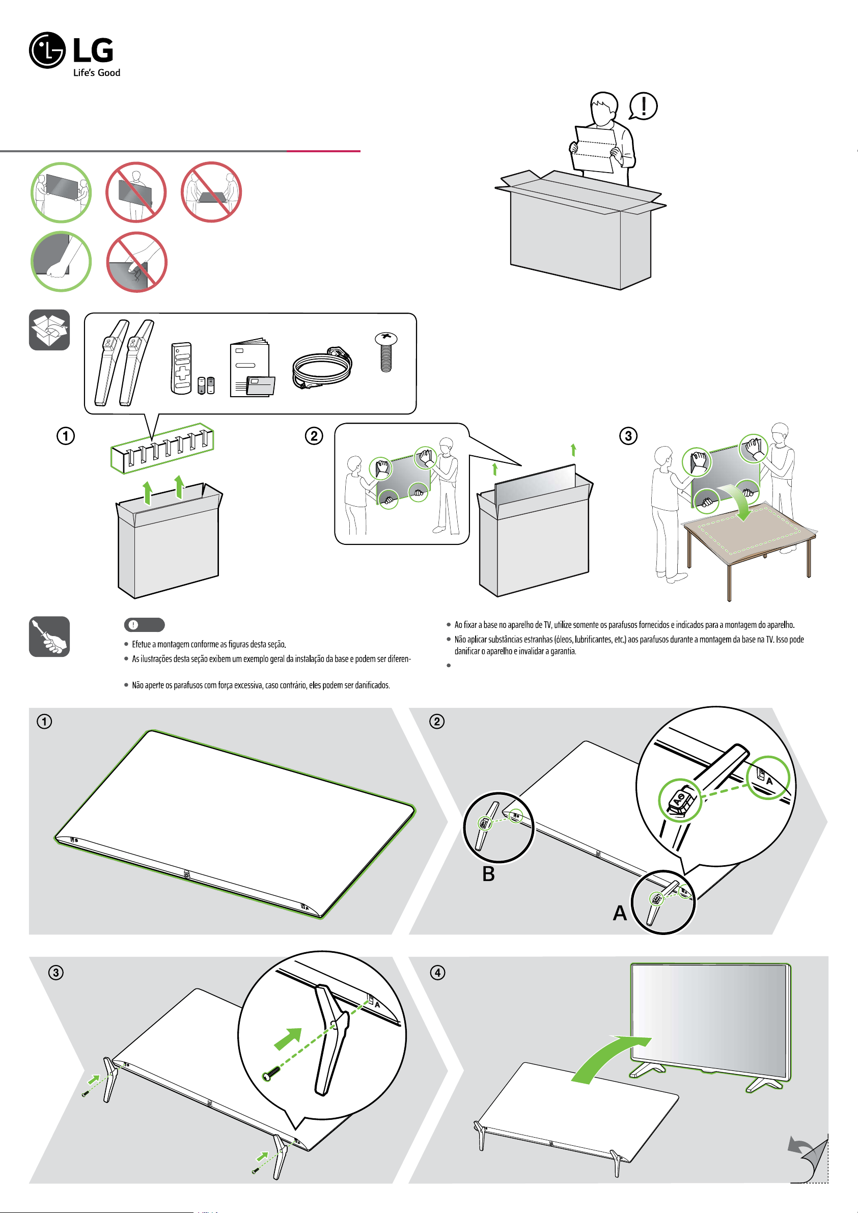 43UP7500PSF Posicione a TV com a tela voltada para baixo sobre uma superfície plana, acolchoada e livre de objetos. Nota tes do produto real. Sempre que for montar ou desmontar o Conjunto Base, coloque a TV com a tela virada para baixo sobre uma superfície plana, acolchoada e livre de objetos. x 2 (M4 x L16) AAA www.lg.com/br *MFL71776943* MFL71776943 REV.00 MAR/21 (MP) CATEGORIA 43UP7500PSF ME DID AS Com Base (L x A x P) 973 x 611 x 187 Sem Base (L x A1 x P1) 973 x 572 x 85 PE SO Com Base 8,1 Sem Base 8,0 TE LA Resolução 3840 x 2160 Diagonal (cm) 108 EN ER GIA Operação Normal 110 W Standby
