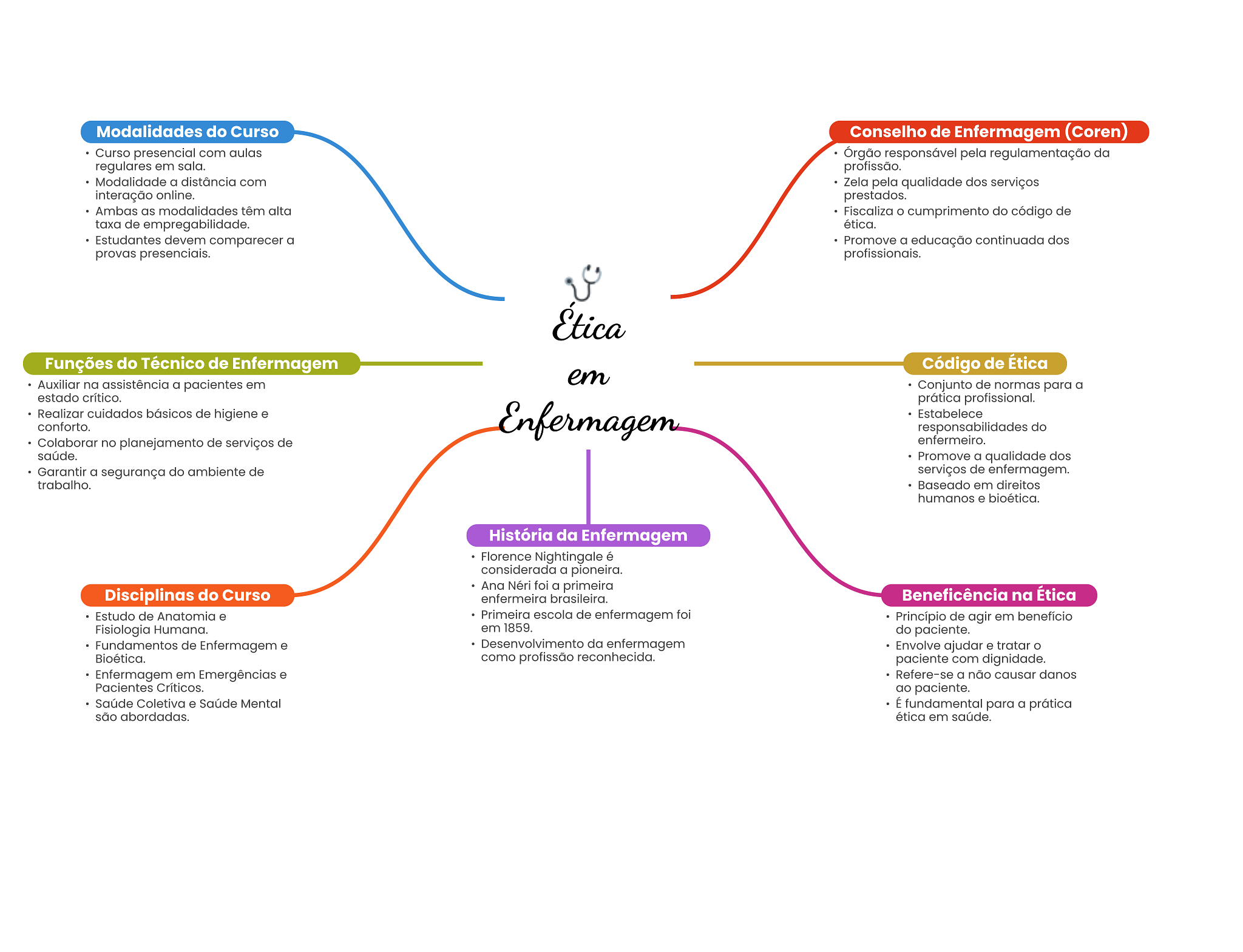 Modalidades do Curso Conselho de Enfermagem (Coren) Curso presencial com aulas Órgão responsável pela regulamentação da regulares em sala. profissão. Modalidade a distância com Zela pela qualidade dos serviços interação online. prestados. Ambas as modalidades têm alta Fiscaliza cumprimento do código de taxa de empregabilidade. ética. Estudantes devem comparecer a Promove a educação continuada dos provas presenciais. profissionais. Ética Funções do Técnico de Enfermagem Código de Ética em Auxiliar na assistência a pacientes em Conjunto de normas para a estado crítico. prática profissional. Realizar cuidados básicos de higiene e conforto. Enfermagem Estabelece responsabilidades do Colaborar no planejamento de serviços de enfermeiro. saúde. Promove a qualidade dos Garantir a segurança do ambiente de serviços de enfermagem. trabalho. Baseado em direitos humanos e bioética. História da Enfermagem Florence Nightingale é considerada a pioneira. Ana Néri foi a primeira Disciplinas do Curso enfermeira brasileira. Beneficência na Ética Estudo de Anatomia e Primeira escola de enfermagem foi Princípio de agir em benefício Fisiologia Humana. em 1859. do paciente. Fundamentos de Enfermagem e Desenvolvimento da enfermagem Envolve ajudar e tratar O Bioética. como profissão reconhecida. paciente com dignidade. Enfermagem em Emergências e Refere-se a não causar danos Pacientes Críticos. ao paciente. Saúde Coletiva e Saúde Mental É fundamental para a prática são abordadas. ética em saúde.