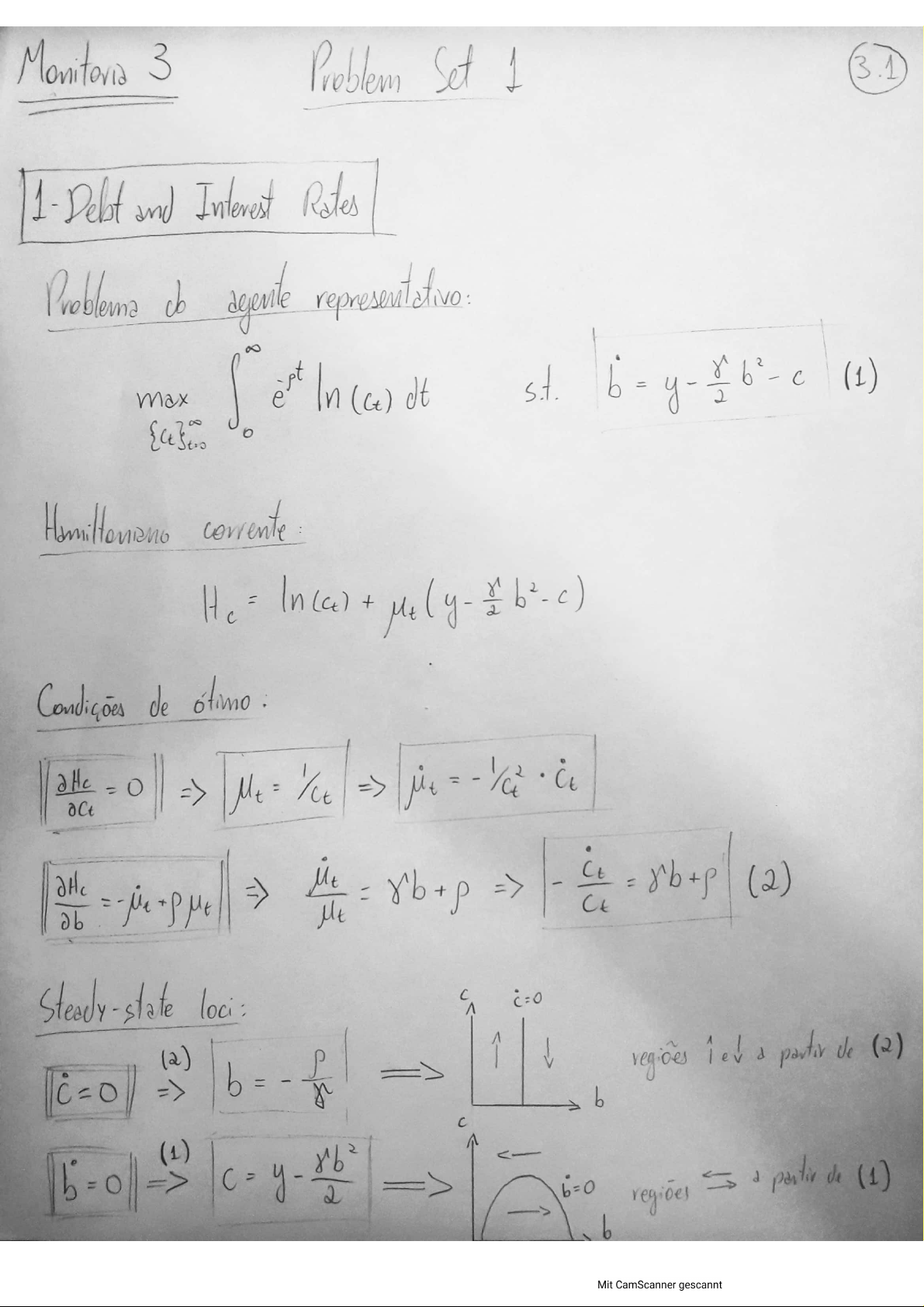 Moniteria 3 Problem Set 1 3.1 1- Debt and Interest Rates Problema agente representativo: 00 max est In It s.t. b = y- I 2 C (1) 0 = + Mt ( y- r c) Condições de = = 1/ct = - = = + Mt = rb+p = - = rb+p (2) Ct loci : (2) b = - regioes d partir (2) = 0 b (1) b = > 2 regioes d partir de (1) b Mit CamScanner gescanntDiagrama 3.2 CA b=0 b Choque em assumindo CA original with i=0 shock Two possible paths: I I from above II from below b=0 11 b Mit CamScanner gescanntr 3.3 Additional / short descent, C t immediate increase in debt II C -br t II t -b I t 2- The Yeoman model a) The representative firm problem max P.Y s.t. = = PY aggregate market aggregate consumption = expenditure of i on its consumption The takes the L = + Mit CamScanner gescannt3.4 First Order Condition on = 0 + A2P di ) 1/2 1/2 - = 0 For itj : 2) ) = ) = Pj = Pj = 1/2 Back to original restriction : Pj P = Y 1/2 (1) = = S.' di = Pⱼ = Pj P 2 (2) b) For each Ci = eernings P Price level Li = Uᵢ = r r consumption Thus its problem is written as: max - P (1) = r (*) (*): Assuming FOC: 1/2 - = = (1/2) symmetric price Mit CamScanner gescannt3.5 = ( 2 = = = - 1/8 remember d) All Yeomans producing = Y= = ( = = C: - = Pi P - r = - = = - r e) 1st order approximation around = = = + = = = + 1/2 - = Considering of a single agent3.6 3- Choque com vigidez de preços a) I problems da firms é: max 00 Pt 2 2 It 0 mas é pl explicitor d leide movimento da de Logo: Hc = - 2 + µ V. Pt Pt b) Condições de 0 - Pt + = Pt = (1) dHc = - + r Pt L' Pt M ) = + = - (2) c) Steady -state ^ 0 L"d) 3.7 0 M Pt e) Choque e permanente em M (assumido M M M t 0 St M M M M' t Efeito de em Pt= 0 Θ V Pt Locus não "custo depende de Θ de no preço" No limite Θ Pt as Ajuste "instantâneo" Mit CamScanner gescannt